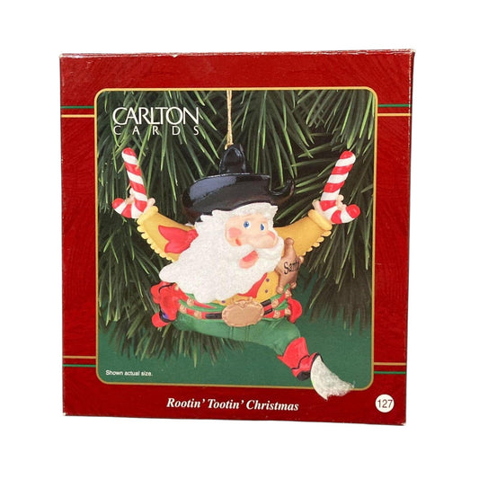 Among the standout pieces is the 2015 "Tin Toys #2 – Rootin' Tootin' Cowboy," which features a vintage-inspired cowboy figure with a lasso, evoking nostalgia for classic Western toys. Another notable ornament is the 2015 "Rhinestone Cowboy," showcasing Santa Claus dressed in a star-spangled cowboy outfit, complete with rhinestones and a button that plays the classic song "Rhinestone Cowboy" by Glen Campbell. For a more whimsical take, the 1982 "Cowboy Snowman" ornament depicts a snowman dressed in cowboy attire, complete with a hat and boots, adding a festive Western flair to holiday decorations.