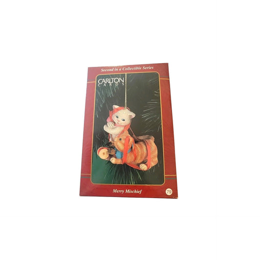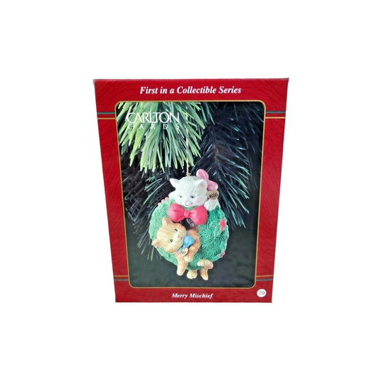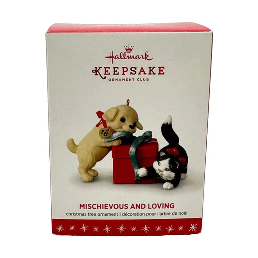 “Mischievous Kittens” is a beloved, verified Hallmark Keepsake series capturing playful kittens getting into holiday trouble. Each ornament shows adorable cats climbing trees, batting ornaments, or unwrapping gifts. This series celebrates humor, innocence, and the irresistible charm of curious pets.
