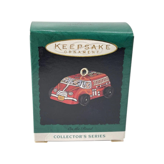 “On the Road” appears as a recurring Hallmark theme celebrating travel and adventure rather than a numbered series. These ornaments depict cars, ca...