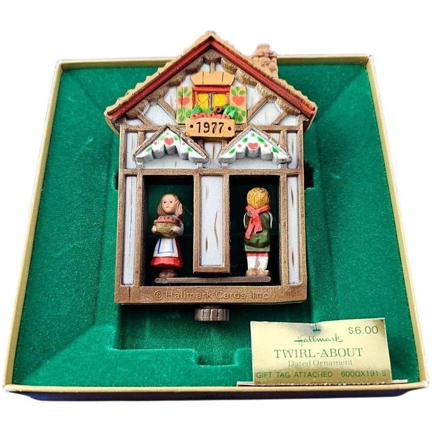 Celebrate the charm of Swiss alpine tradition with this 1977 Weather House ornament from Hallmark's Twirl-About Series. Featuring a Swiss girl and boy rotating through the doors of a country chalet, this ornament captures the essence of holiday nostalgia. Crafted by Hallmark, it arrives mint in its original box, complete with the official Hallmark tag. No batteries, cords, or power adapters are required—simply display and enjoy.