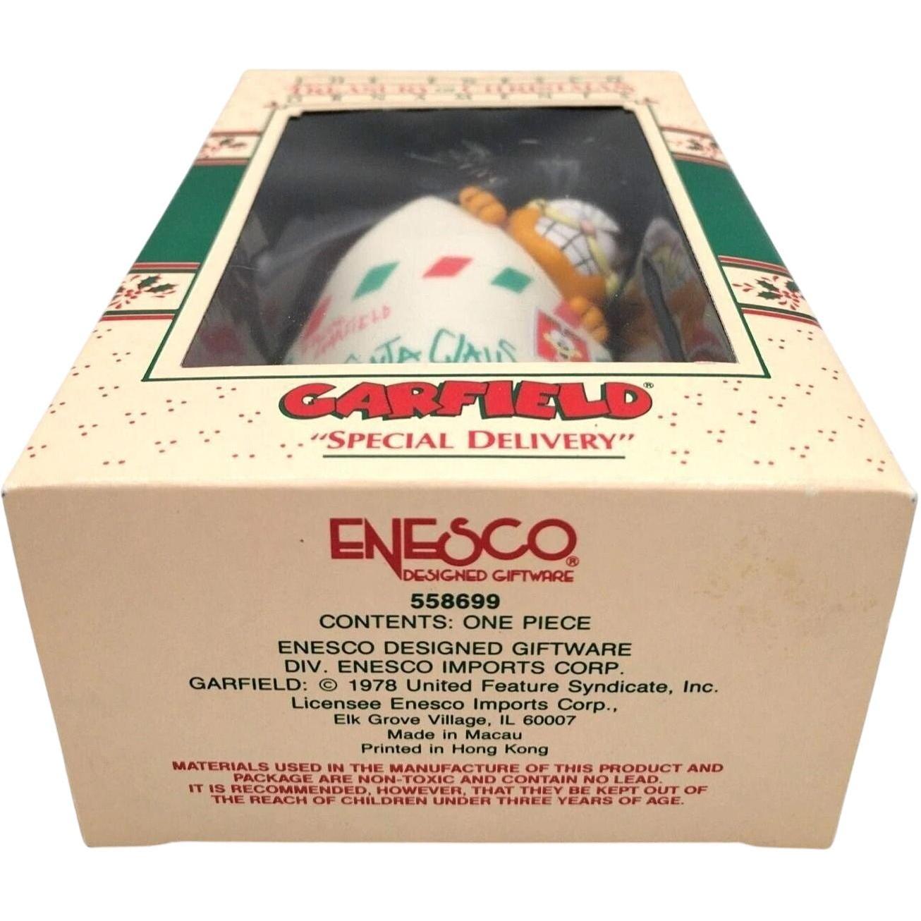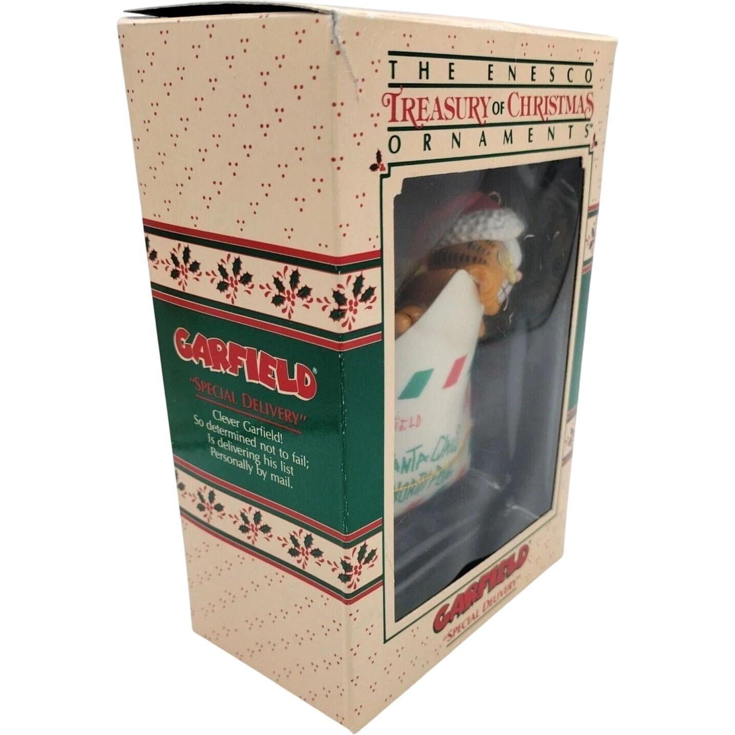 This charming vintage ornament features the iconic Garfield peeking out of a holiday-themed envelope addressed to Santa—capturing the comic-strip cat’s mischievous spirit wrapped in festive cheer. It’s molded plastic, hand-painted with rich holiday colours, and part of Enesco’s “Treasury of Christmas” line. A delightful piece for fans of Garfield, retro ornament collectors, or anyone wanting a playful vintage addition to their holiday décor.