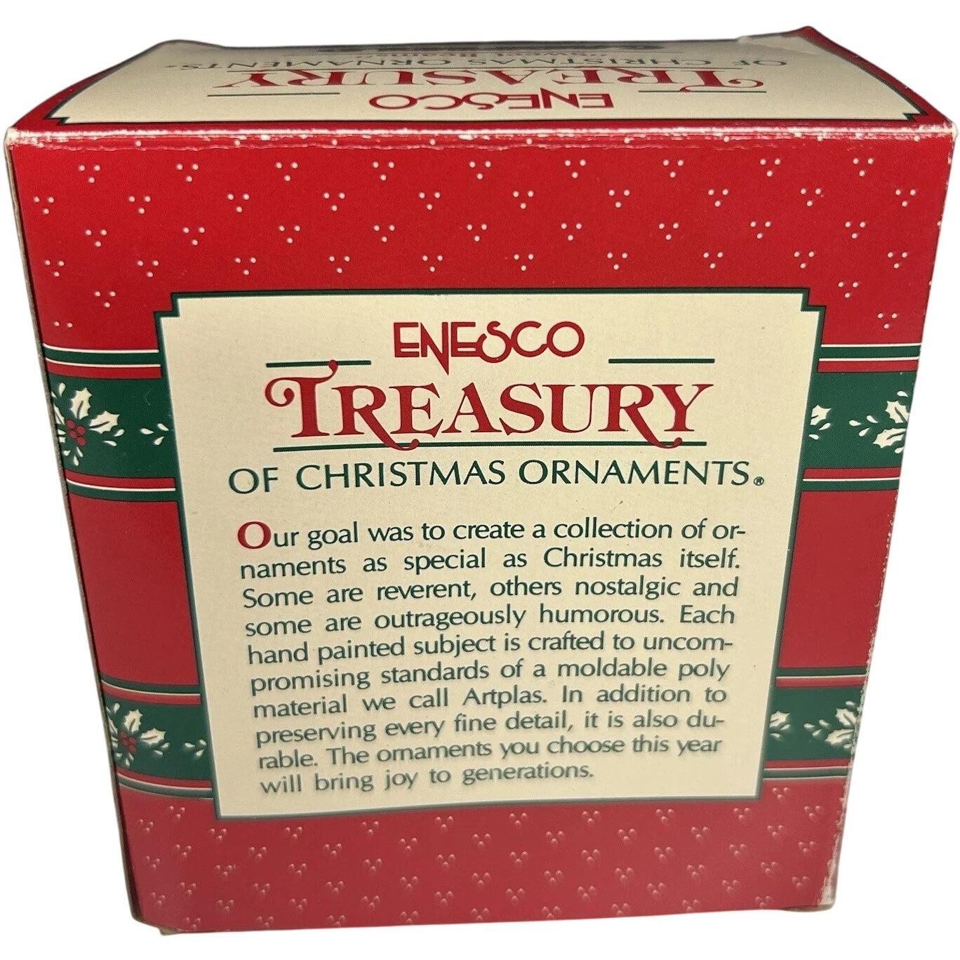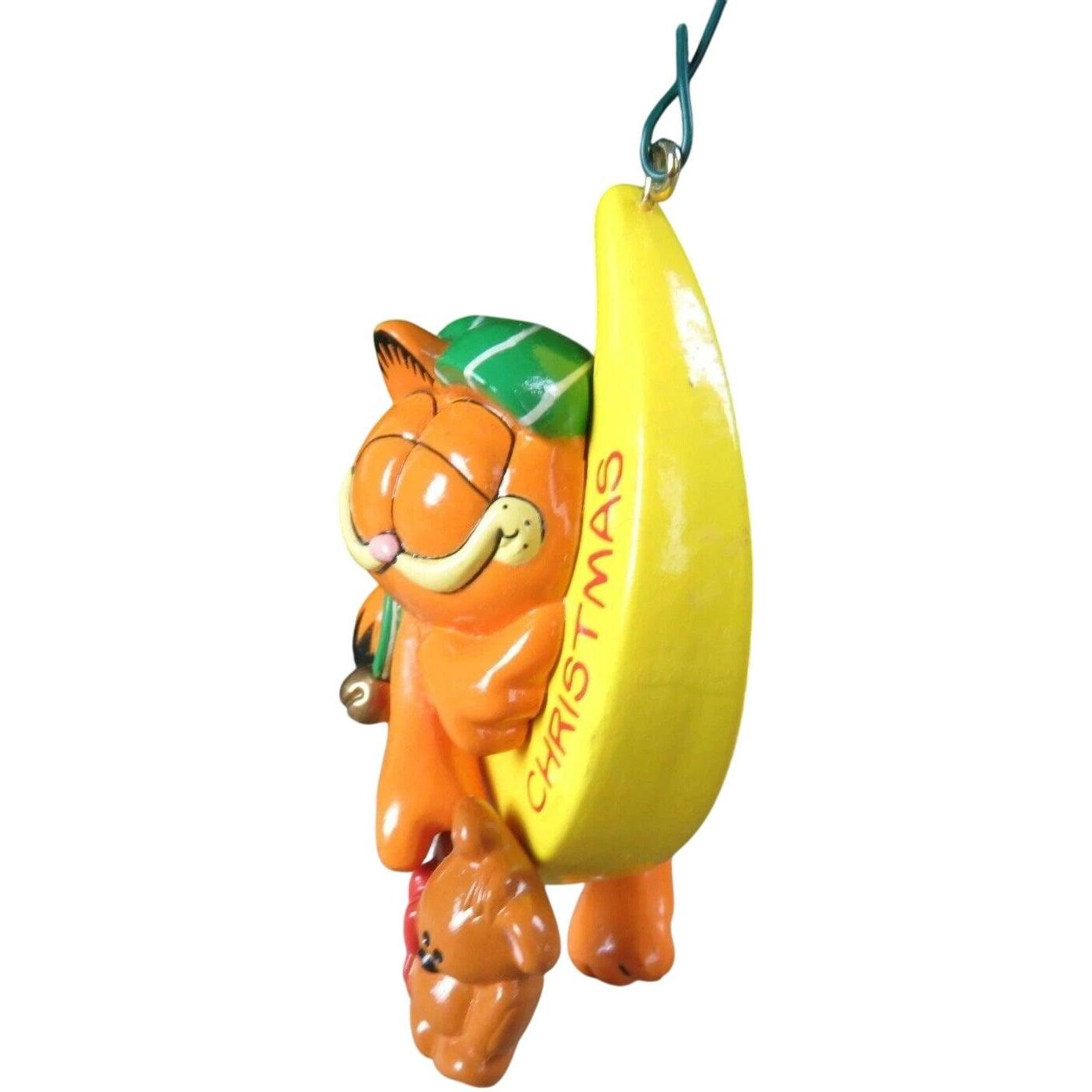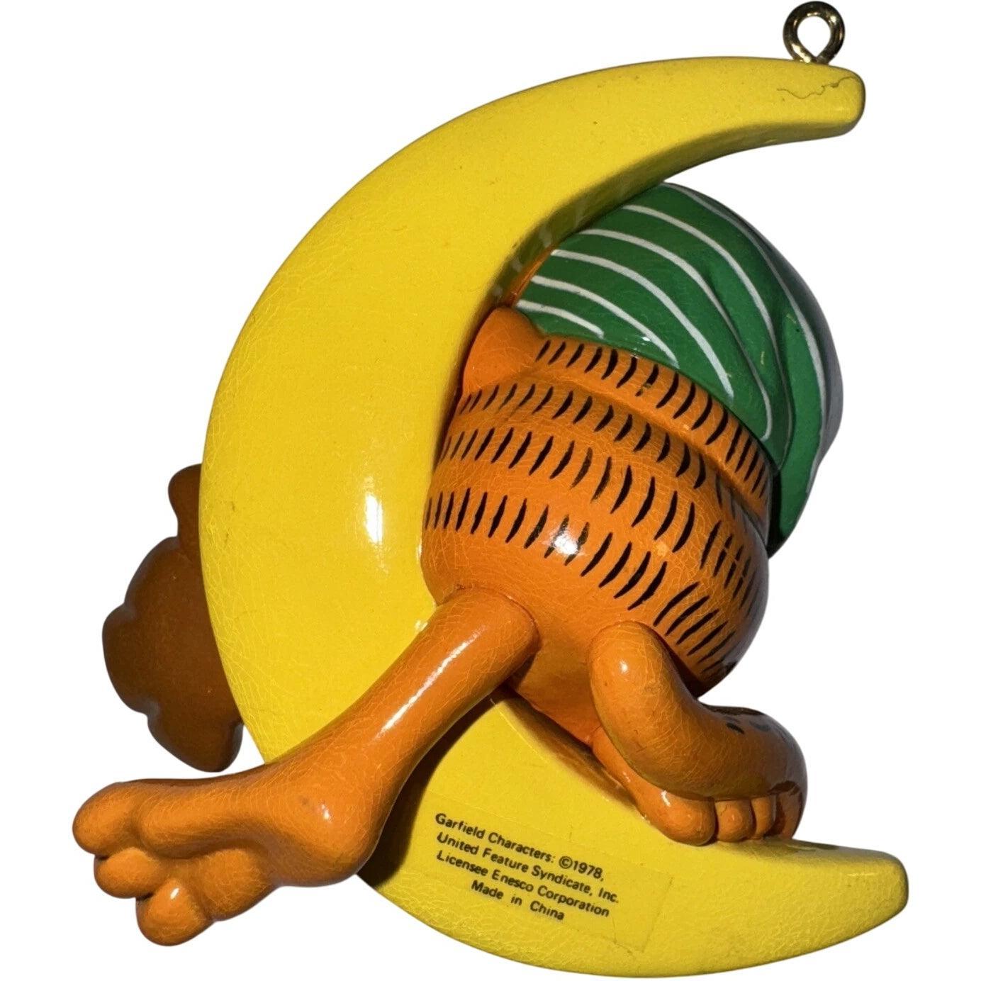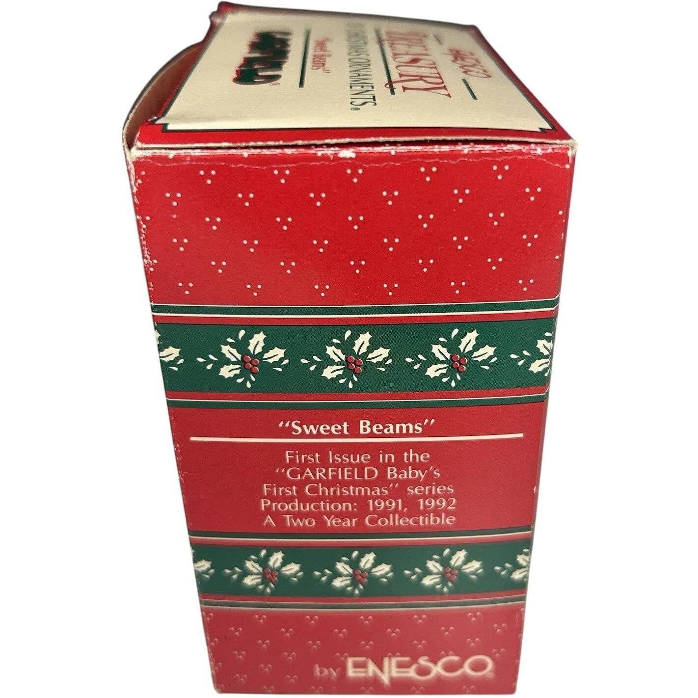 This charming ornament features Garfield curled up on a crescent moon, wearing a cozy night-cap and clutching a teddy bear—an endearing nod to a baby’s first holiday season. The design glows with soft pastel details, and the moon is inscribed with “Baby’s 1st Christmas”, giving it extra keepsake value. Crafted with care by Enesco as the first issue of the “Sweet Beams” series, this piece holds particular appeal for both Garfield fans and holiday ornament collectors. With its nostalgic design and playful character motif, it’s a standout addition to any vintage Christmas décor collection.This charming ornament features Garfield curled up on a crescent moon, wearing a cozy night-cap and clutching a teddy bear—an endearing nod to a baby’s first holiday season. The design glows with soft pastel details, and the moon is inscribed with “Baby’s 1st Christmas”, giving it extra keepsake value. Crafted with care by Enesco as the first issue of the “Sweet Beams” series, this piece holds particular appeal for both Garfield fans and holiday ornament collectors. With its nostalgic design and playful character motif, it’s a standout addition to any vintage Christmas décor collection.