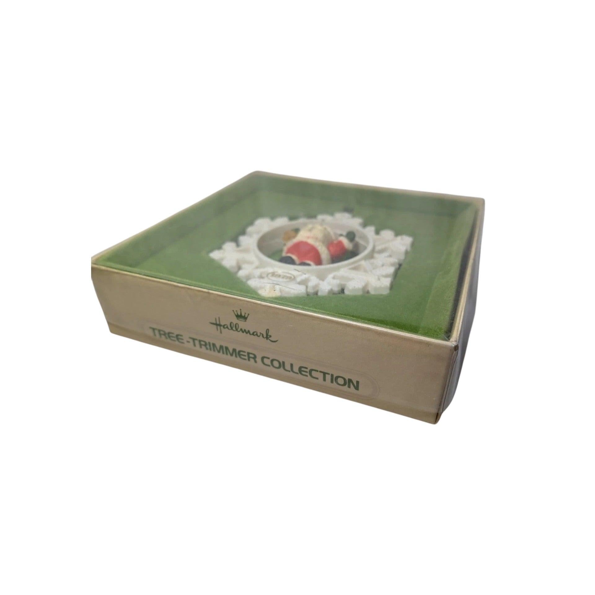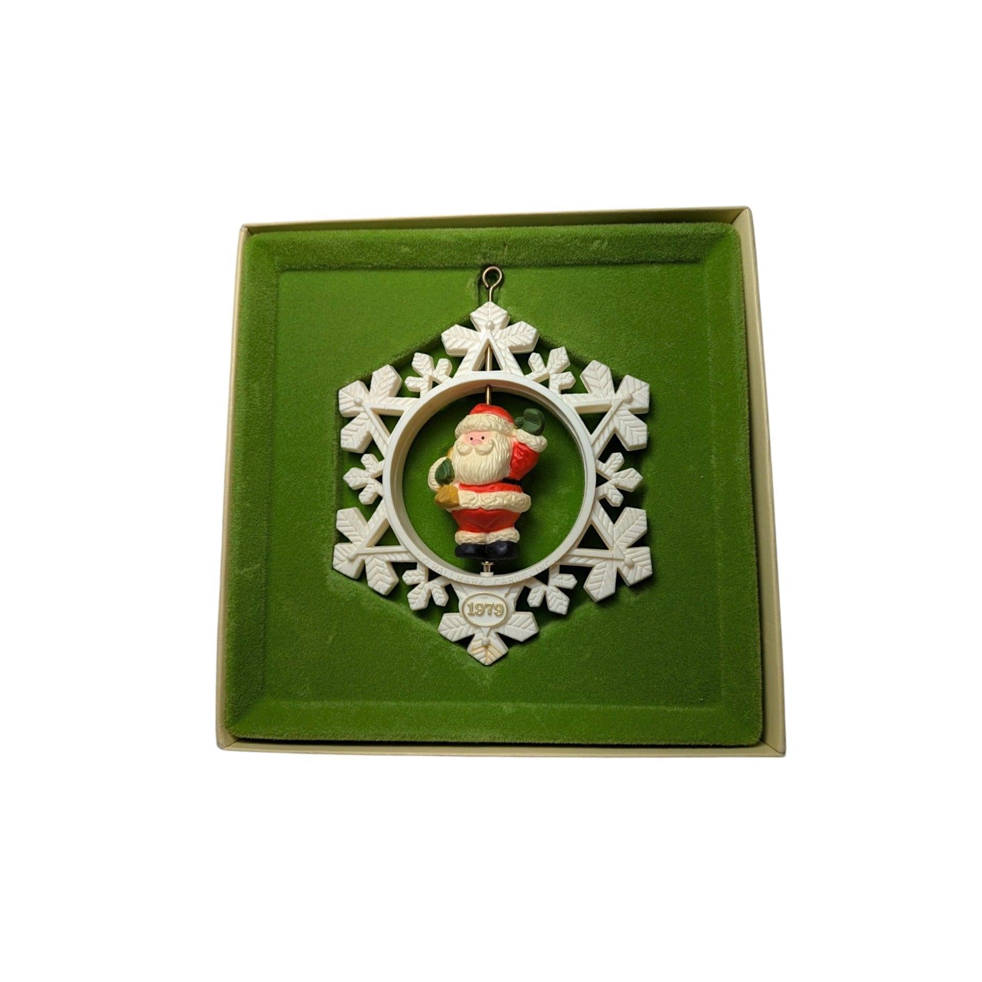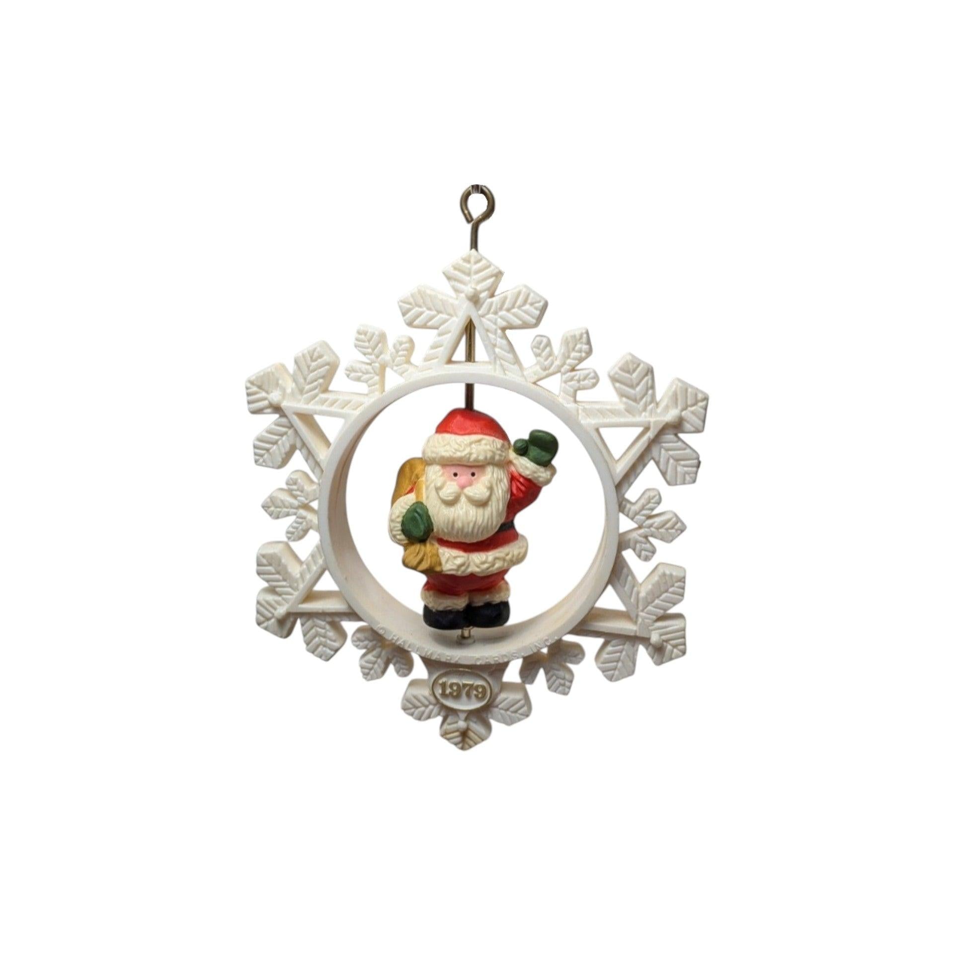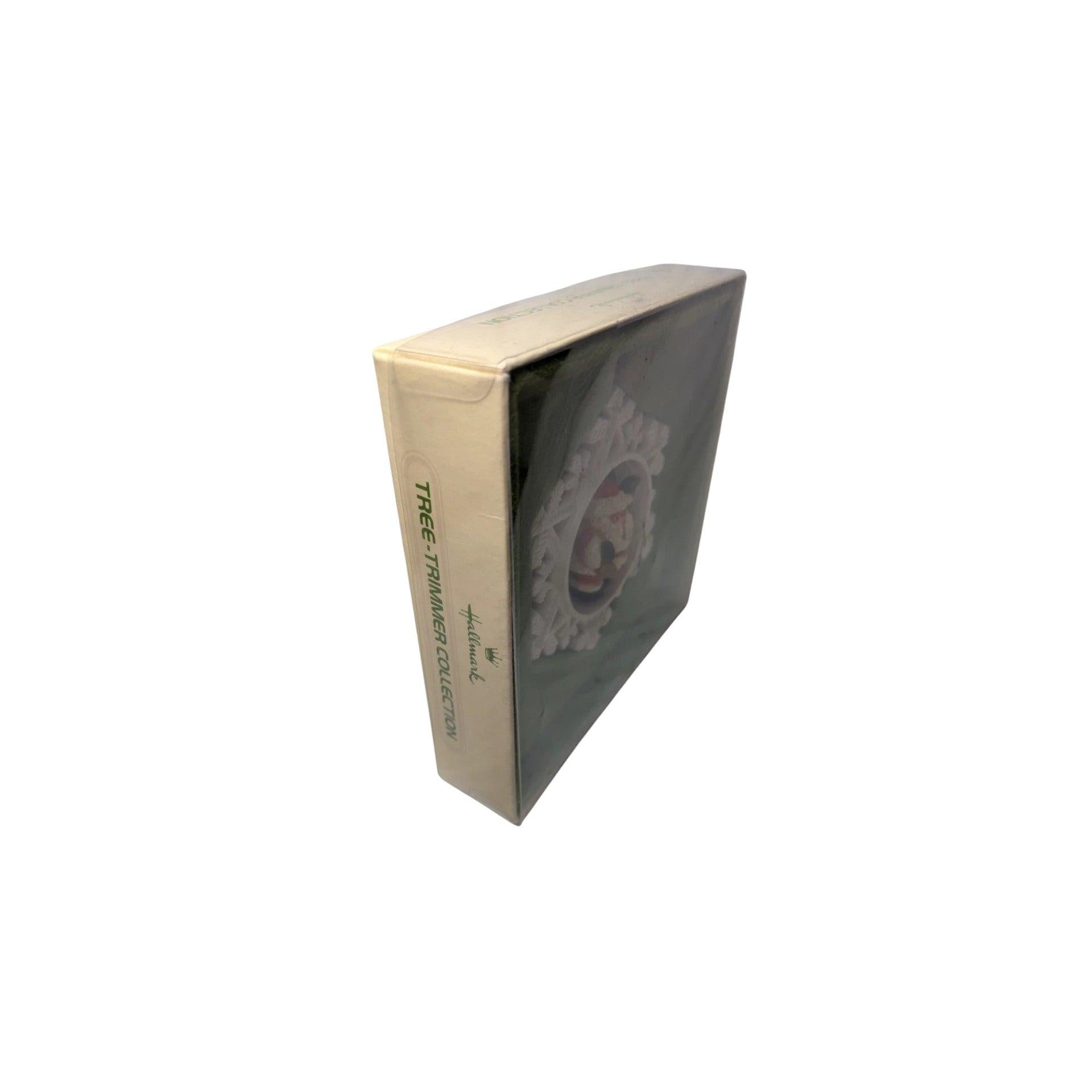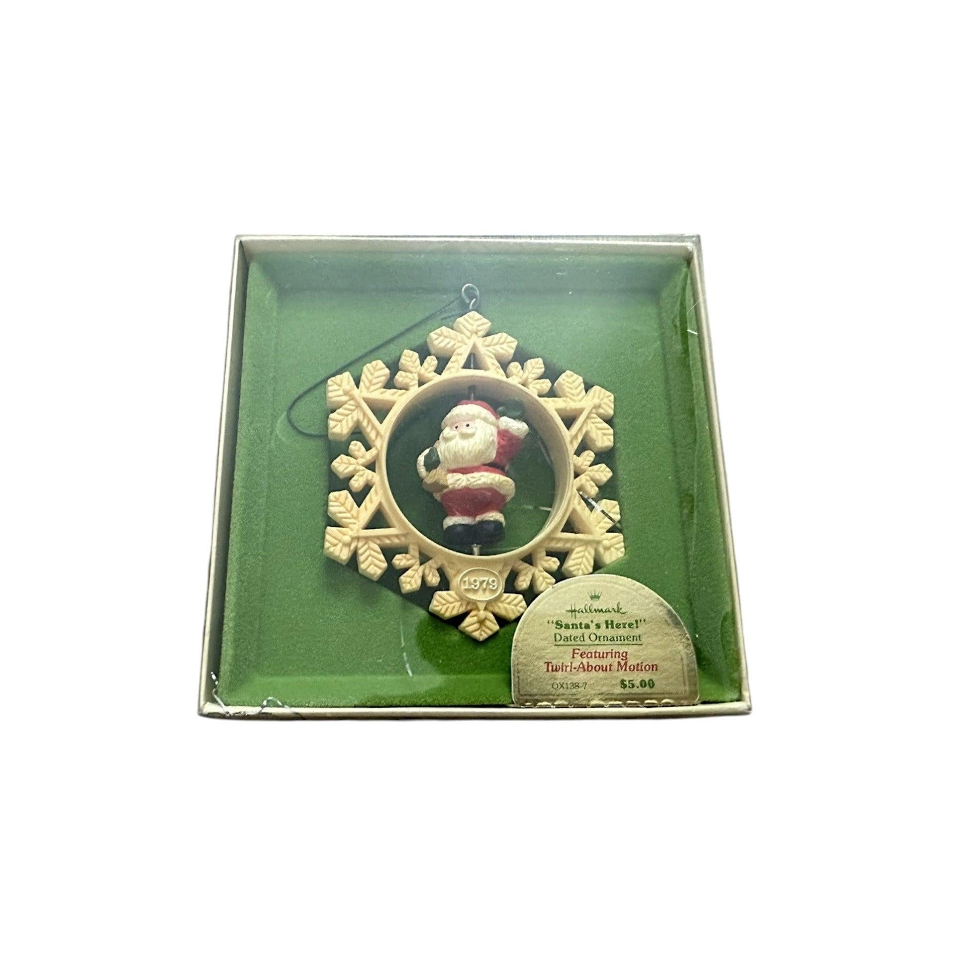 Welcome Santa to the tree in classic vintage style with Santa’s Here!, featuring a cheerful Santa waving while he twirls/rotates inside a large white snowflake frame—a playful motion effect that gives the ornament extra charm from every angle. New-condition examples are commonly found mint in the original Hallmark box (some listings also mention the vintage inner packaging/insert). This is a mechanical motion ornament, so it needs no batteries, cords, power boxes, or light strings.