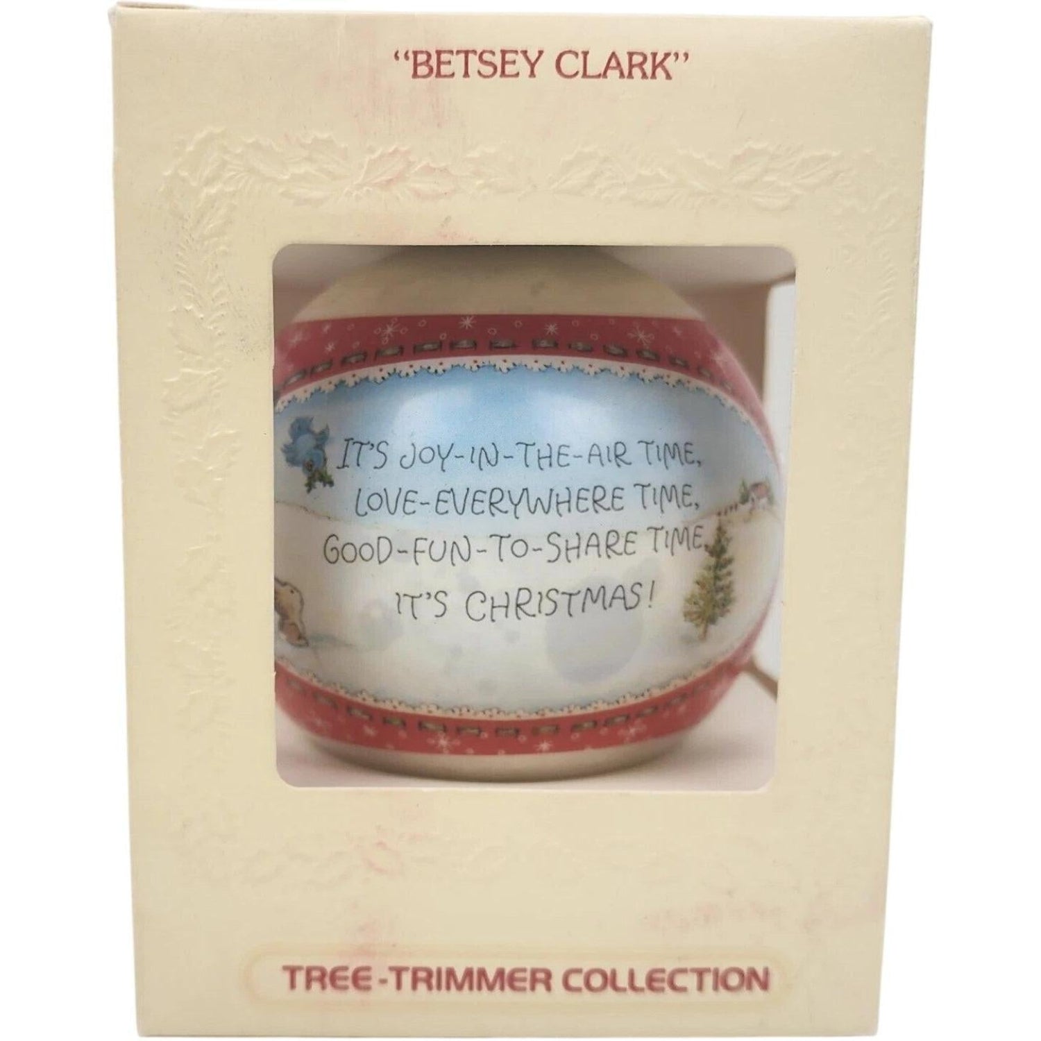 Capture the warmth of vintage holiday charm with this 1980 Hallmark ornament, featuring the beloved Betsey Clark art style. Crafted as a delicate white glass ball, the ornament portrays two rosy-cheeked children bundled in winter attire, sledding joyfully through a snowy scene beside a “Christmas 1980” sign. The reverse displays a heartwarming seasonal greeting. This keepsake arrives in its original box, ready to hang—no batteries or power required.