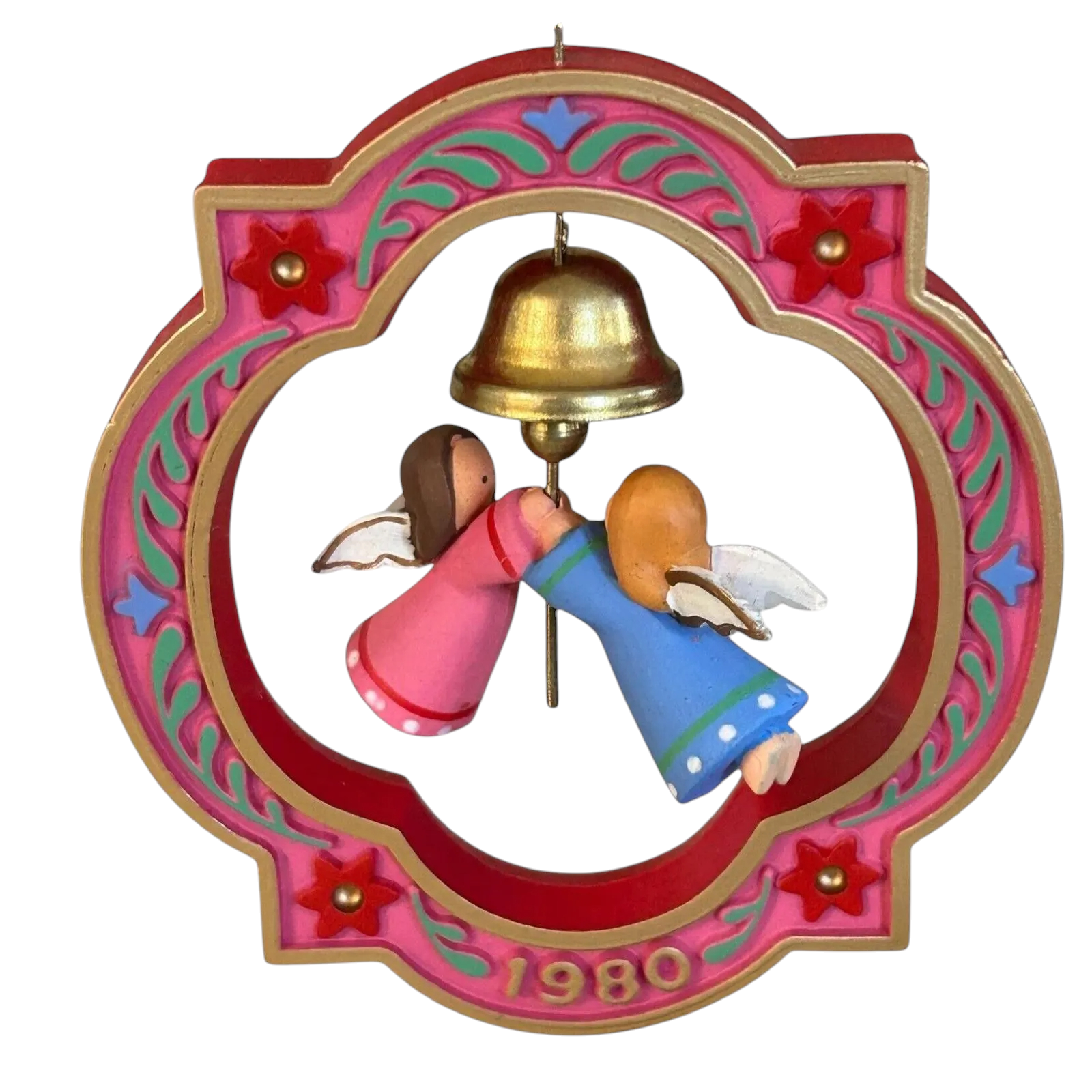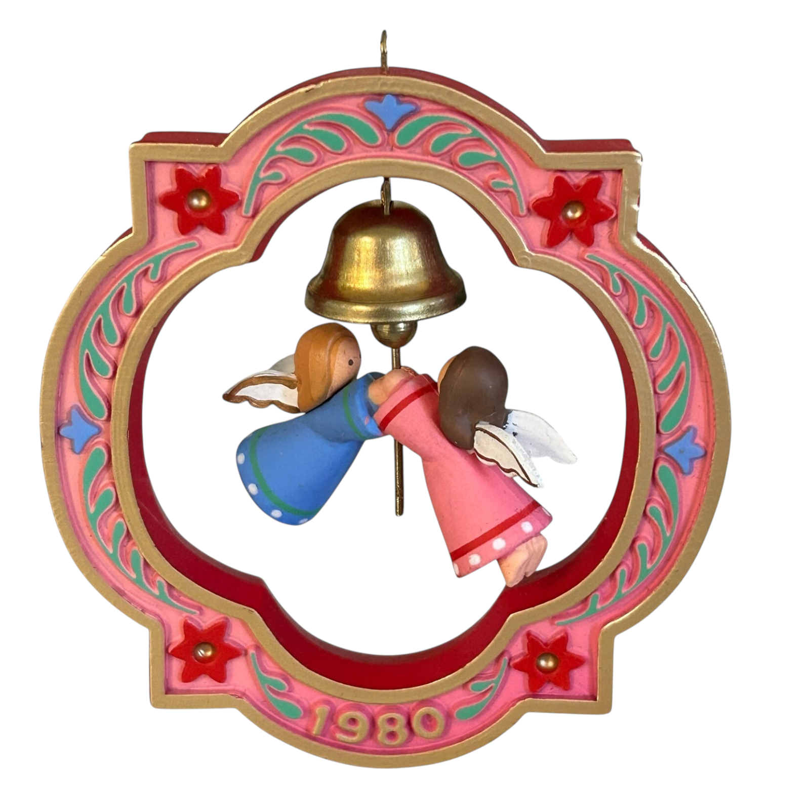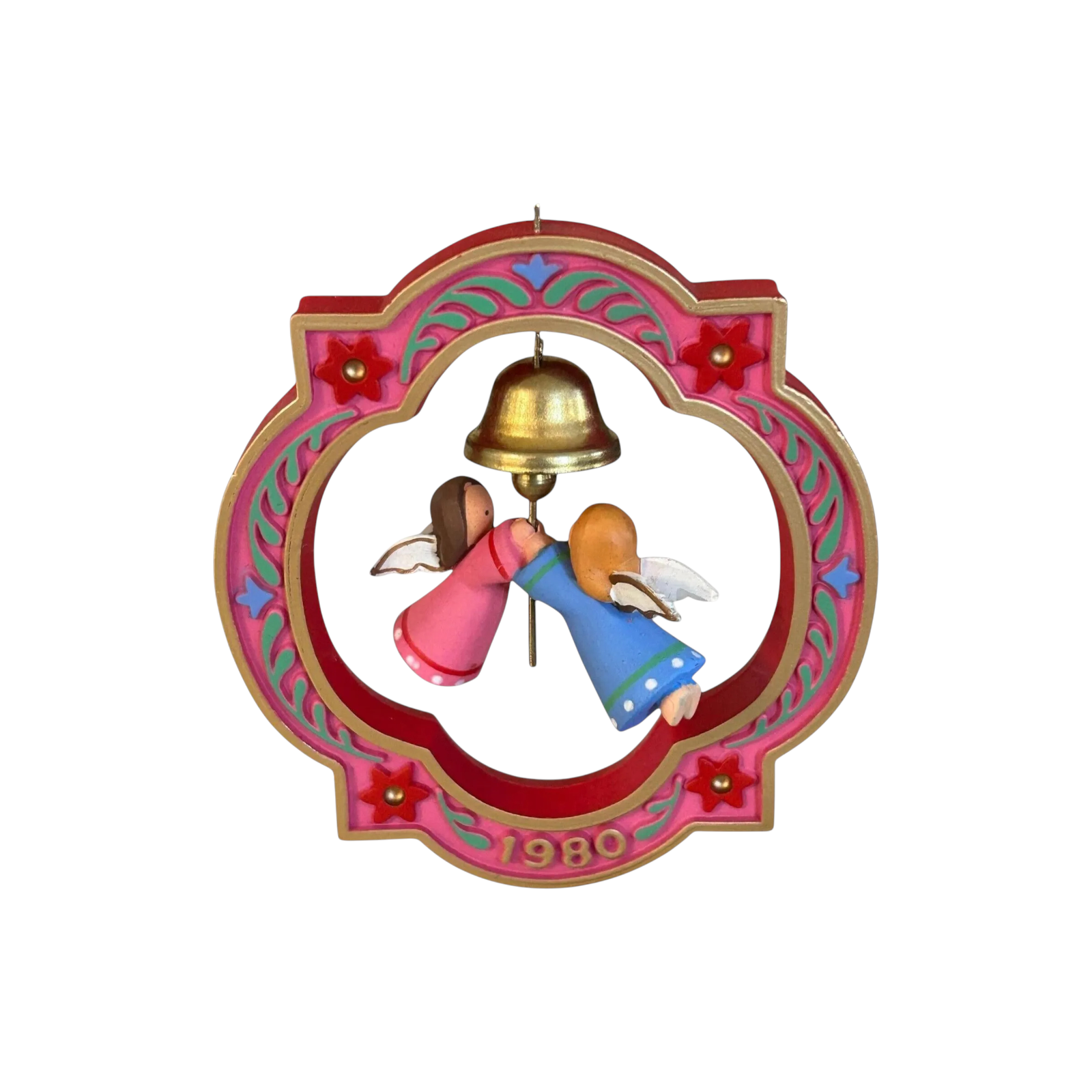 Materials: Painted metal/plastic bell piece with metal hanging loop and molded angel figures