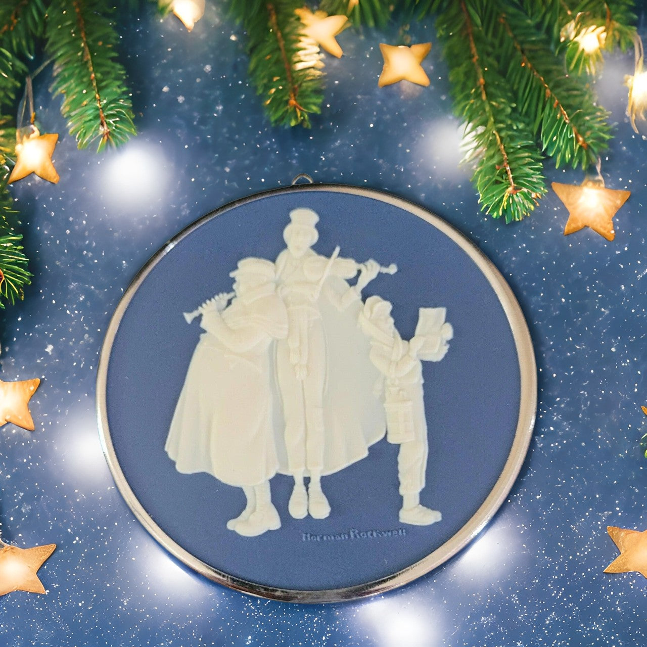 Invite timeless American artistry into your holiday décor with the 1981 Hallmark Cameo Keepsake from the Norman Rockwell series. This exquisite ornament showcases a finely molded cameo of carolers—crafted in white relief on a rich blue disc, evoking nostalgic winter evenings. It comes elegantly framed in its original Hallmark box, dated Christmas 1981 and marked as “second in a series” of cameos. No power or extra components required—simply unwrap and hang for an instant touch of classic charm.