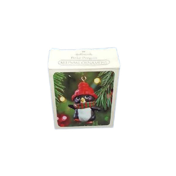 Add a touch of festive charm to your holiday decor with the 1981 Perky Penguin ornament. This delightful piece features a cheerful penguin wearing a red stocking cap and a red and green striped scarf, capturing the whimsy and warmth of the season. Crafted from painted resin, it measures approximately 2.121" H × 1.460" W × 1.107" L. The ornament comes complete with its original box and tag, making it a perfect addition to any holiday collection. No batteries or cords are required—simply hang it and enjoy the festive spirit.