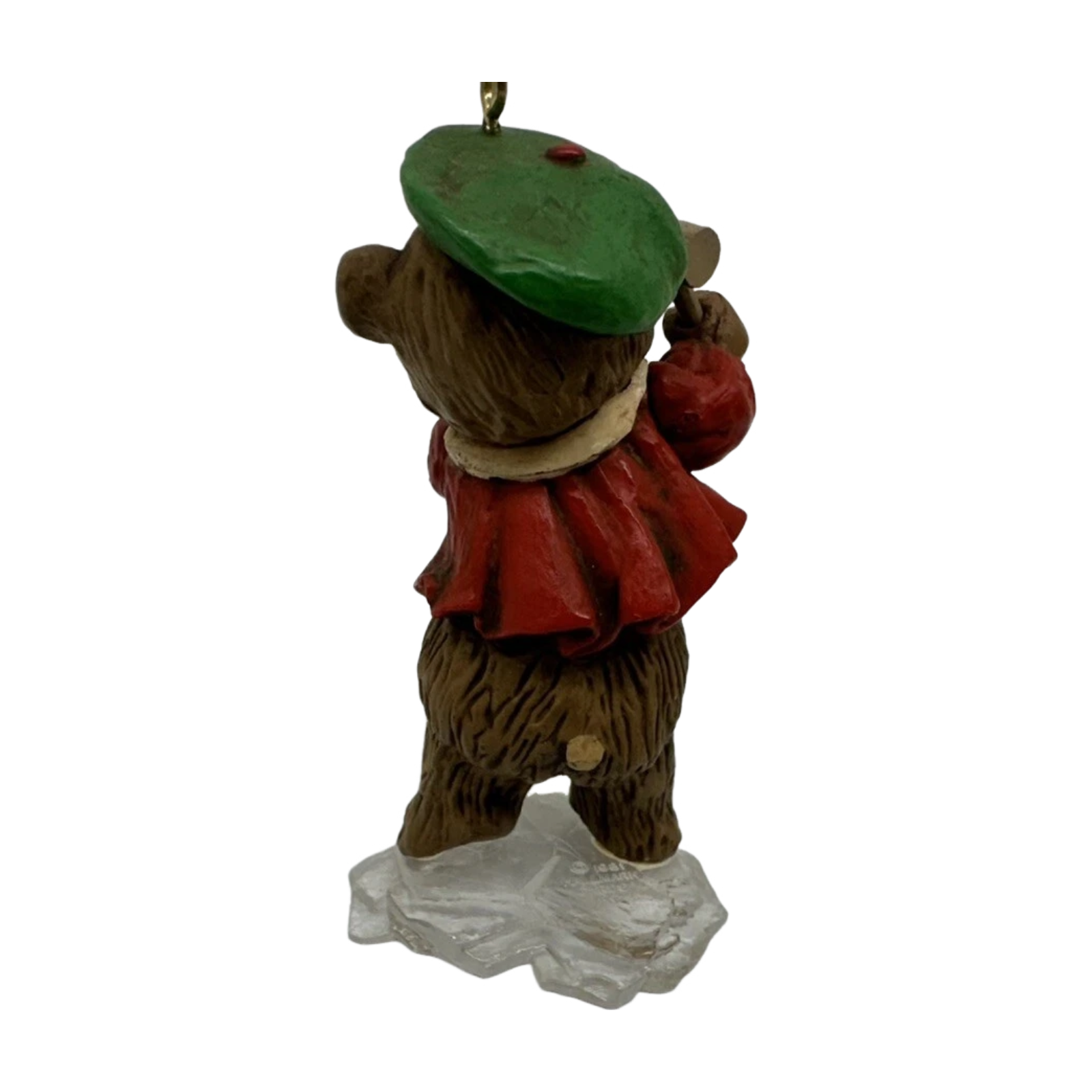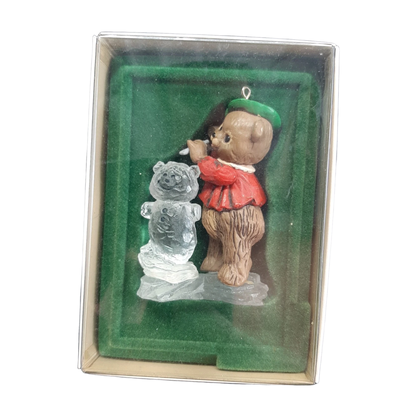 Bring frosty charm to your holiday tree with the 1981 The Ice Sculptor ornament. This delightful piece showcases a teddy bear bundled in a warm scarf, chisel in paw, intricately carving an ice heart. Measuring approximately 3¼″ tall, it arrives with the original box and Hallmark tag—perfect for collectors or seasonal gifting. No batteries, cords, or light strings required—just hang and enjoy the adorable craftsmanship.