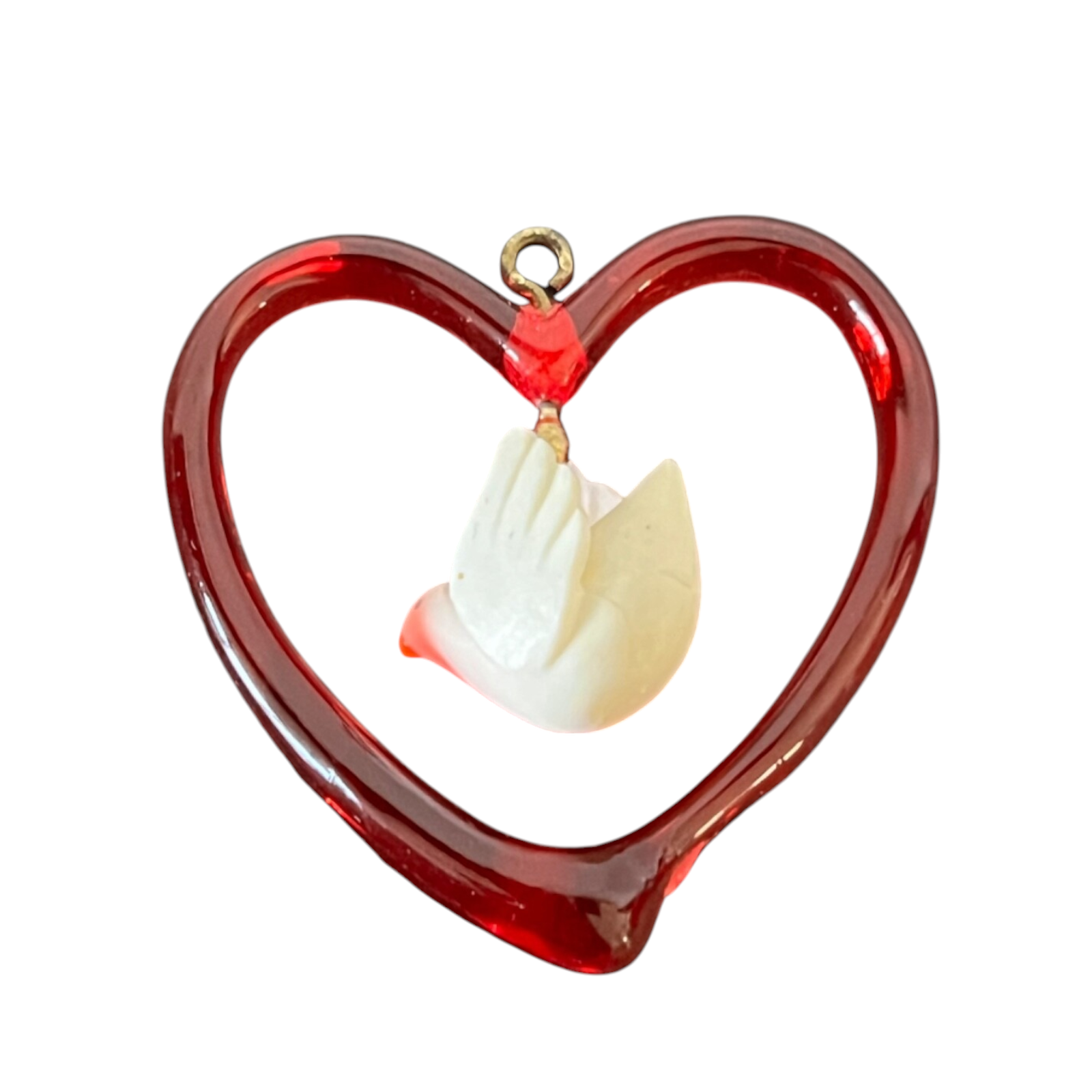 Materials: Acrylic heart-shape with a rubber or plastic white dove suspended in the center