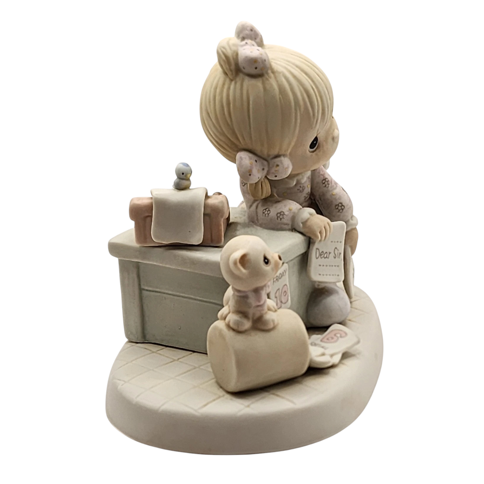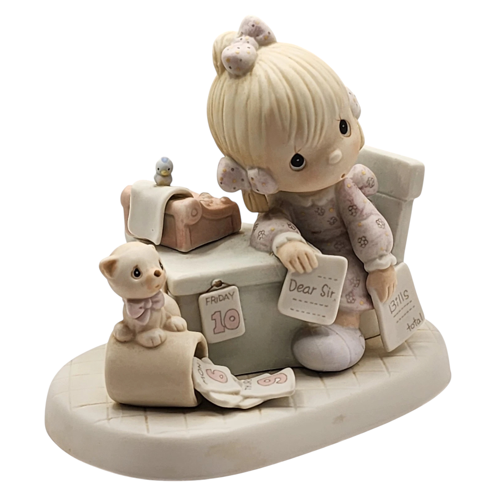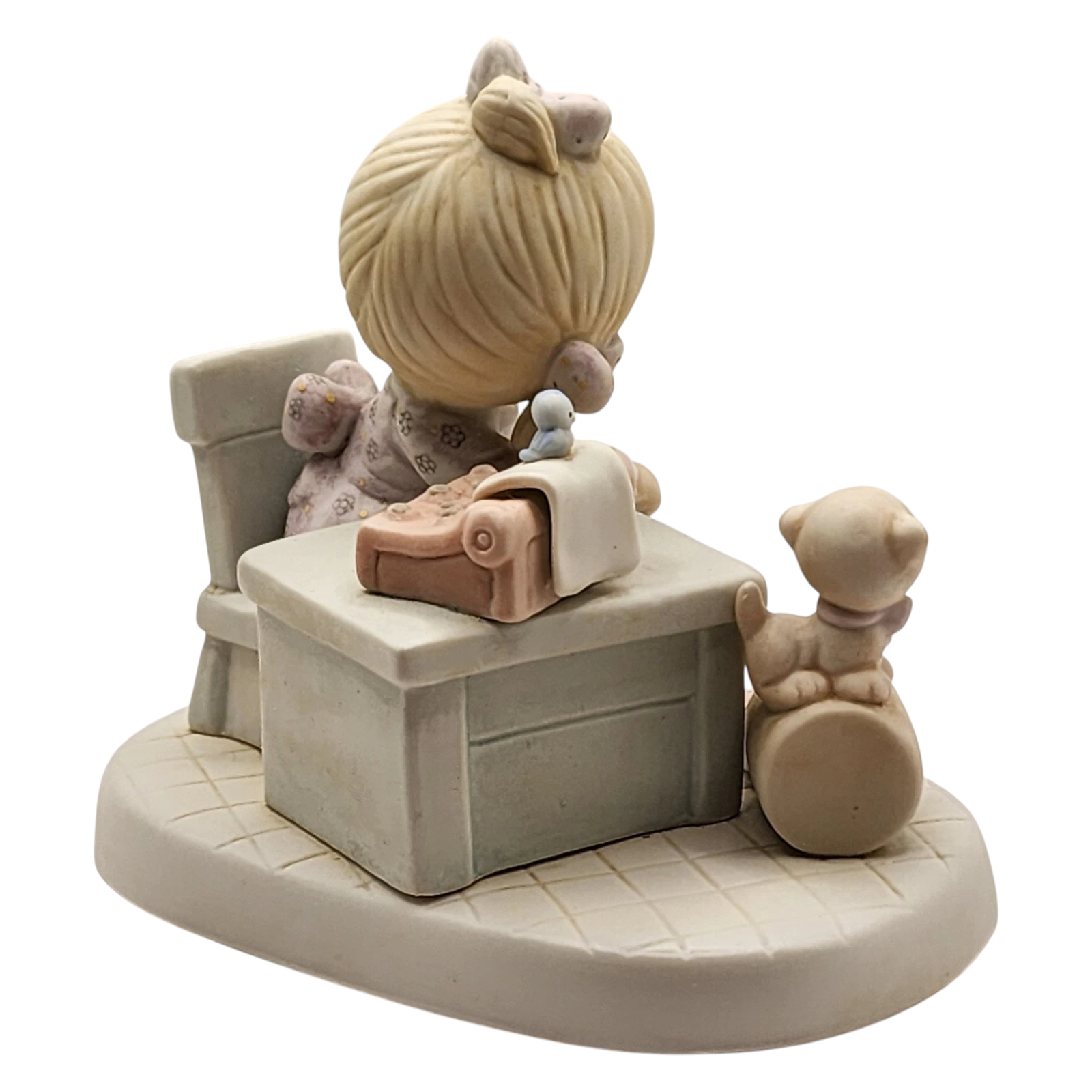 This 1982 porcelain figurine from the Precious Moments collection depicts a young girl seated at a typewriter with scattered sheets of paper and a kitten nearby — the handwritten inscription reads “Praise the Lord anyhow,” a heartfelt nod to perseverance and faith. The original package typically includes the boxed figurine, registration card, and original style box. No batteries, cords, or special power features are required — it’s a decorative piece meant for display.
