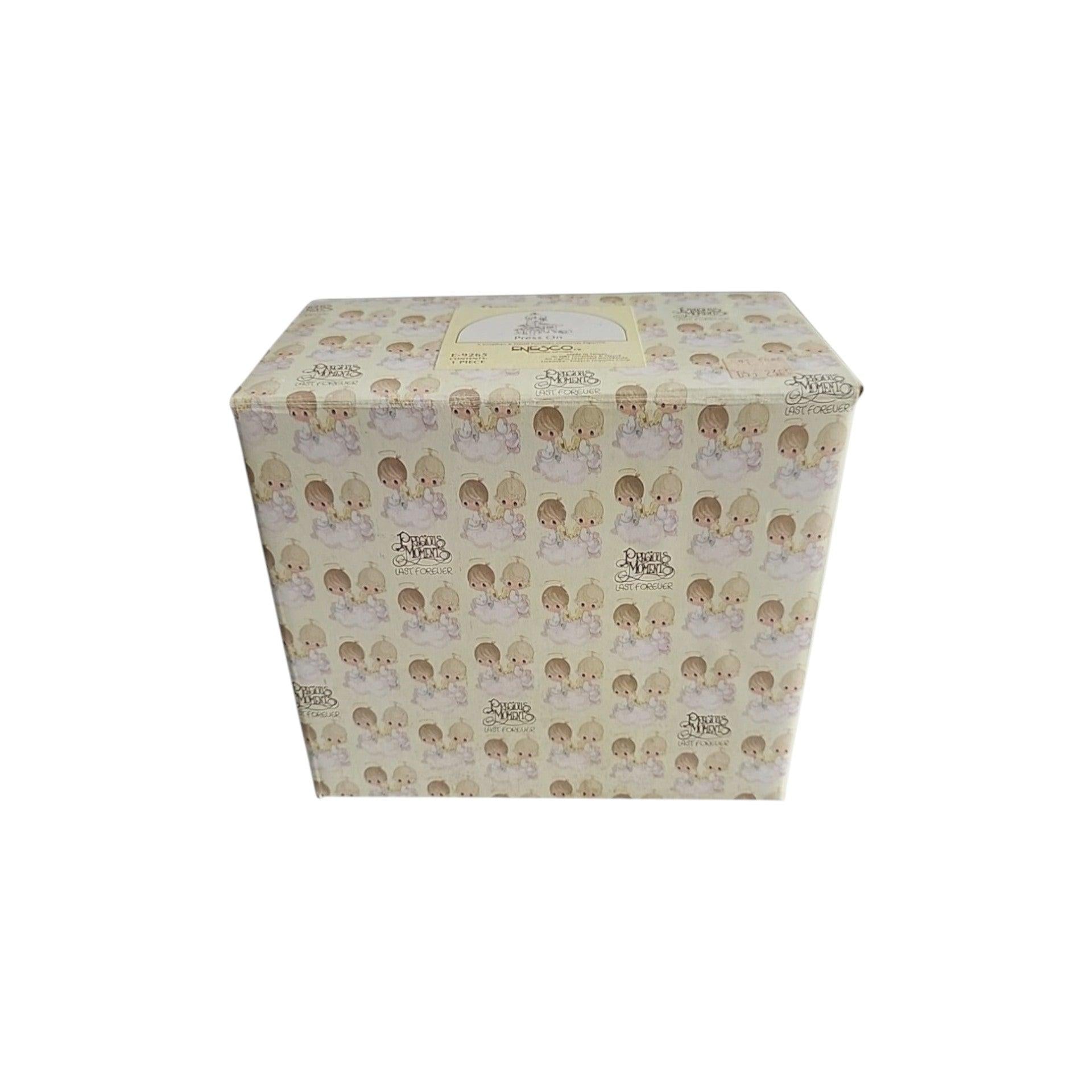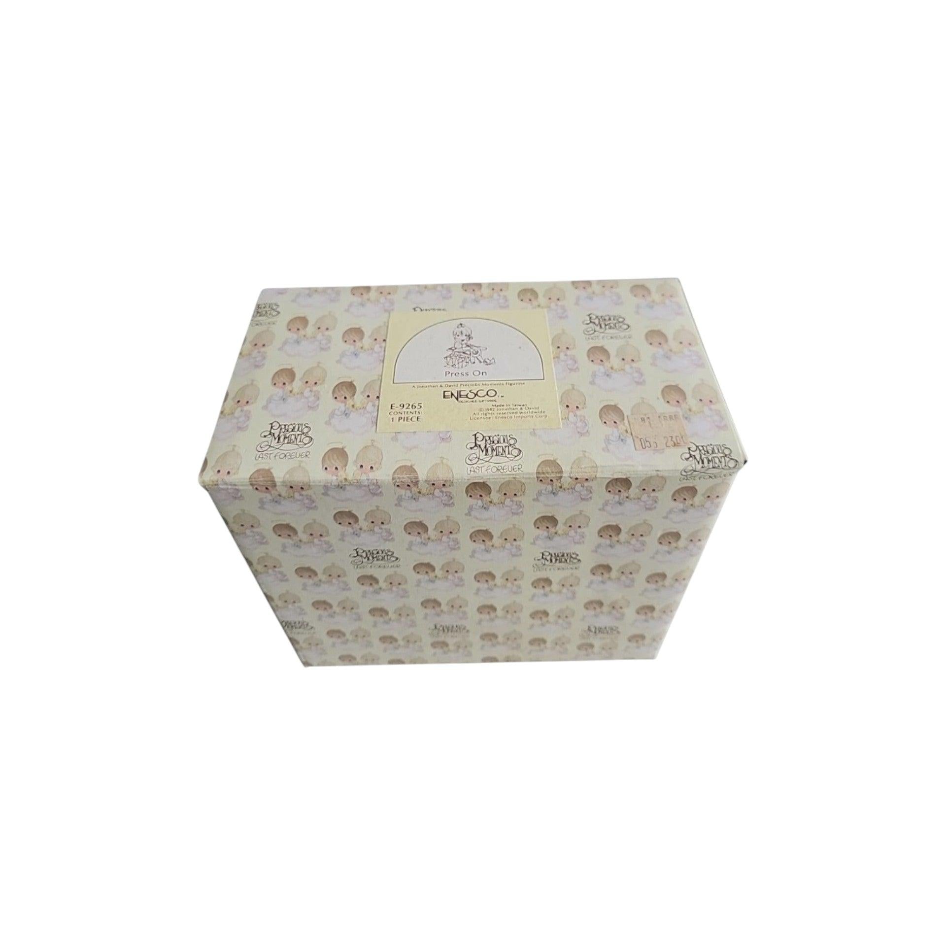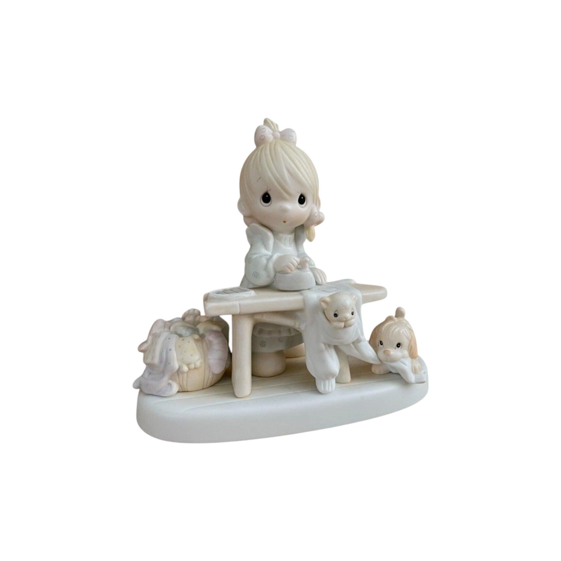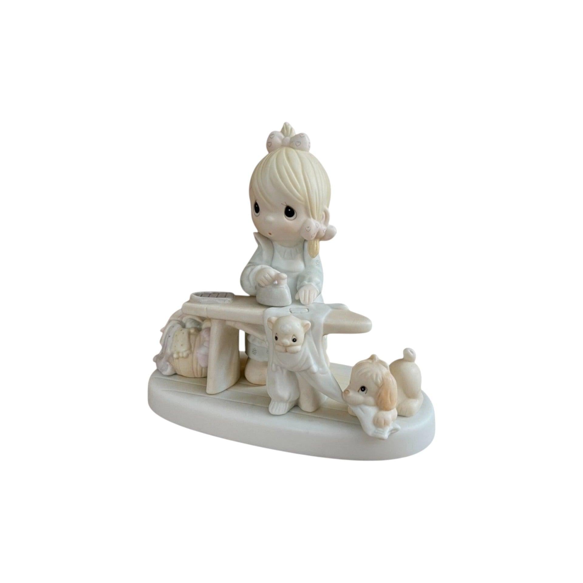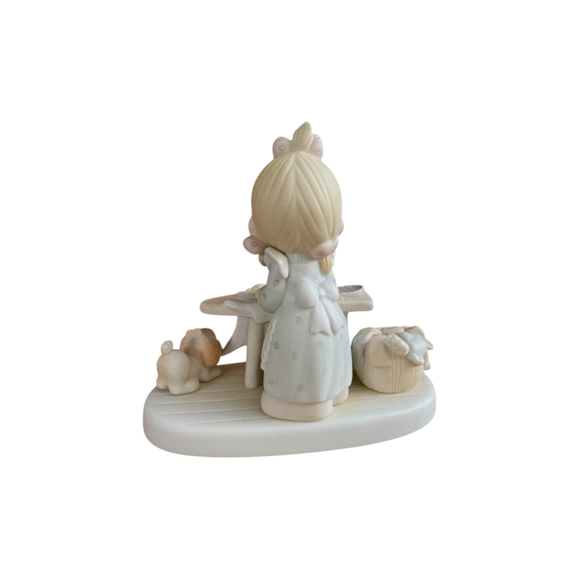 This vintage Precious Moments figurine titled “Press On” depicts a young girl busily pressing clothes with an iron while her beloved puppy sits nearby. Rendered in soft pastel colors and finished in matte porcelain bisque, the piece reflects the gentle, sentimental style cherished by collectors of Precious Moments. It captures daily life with a touch of nostalgic charm, making it a meaningful addition for fans of classic collectibles or as an encouraging decorative piece for everyday inspiration.