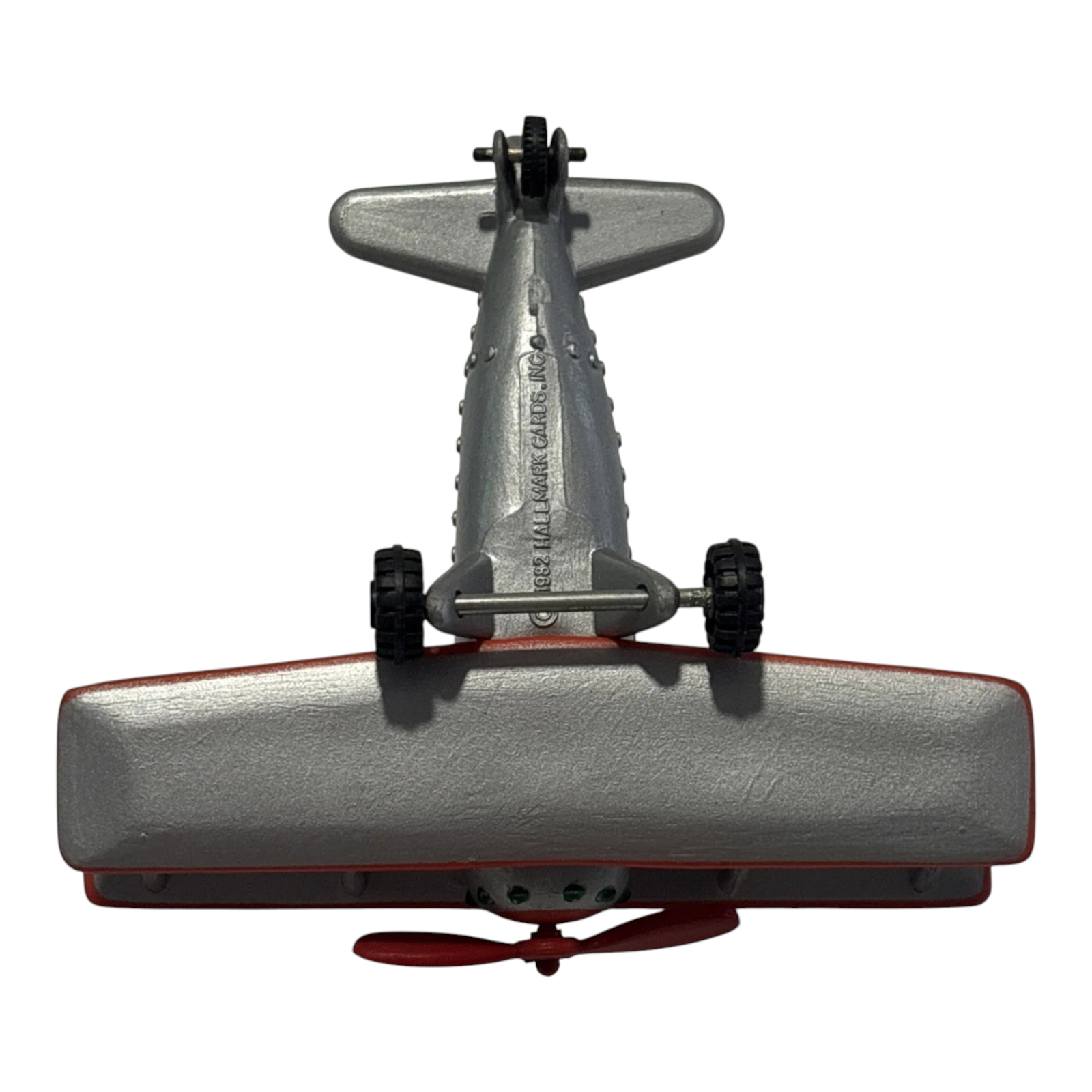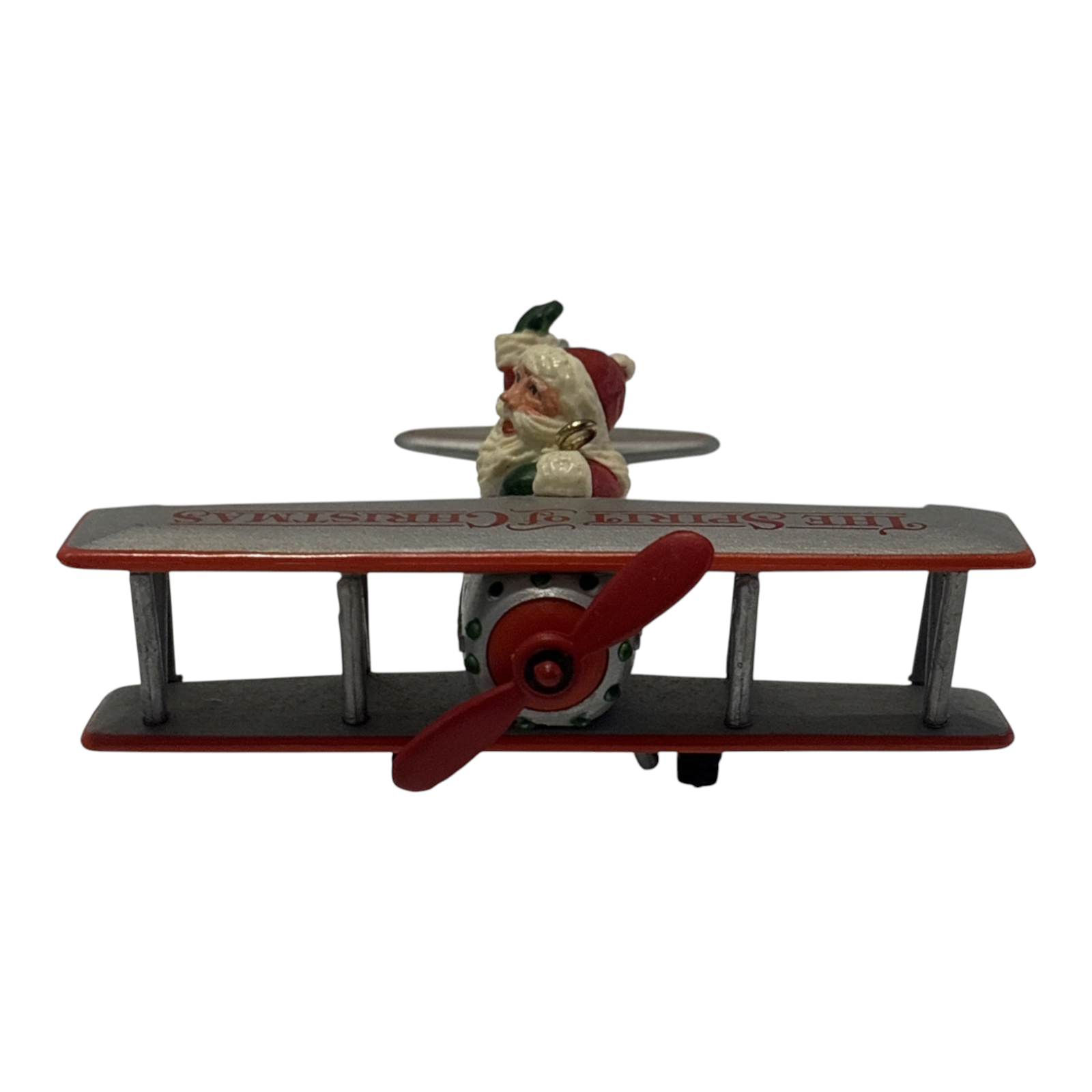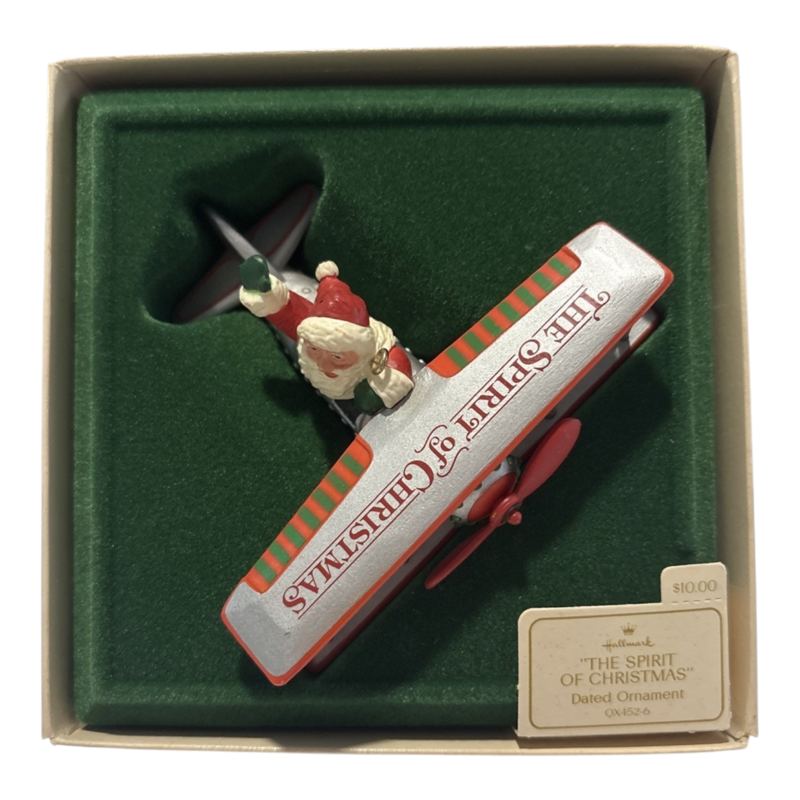 This dynamic 1982 ornament features Santa Claus piloting a silver-and-red bi-plane, capturing the exhilaration of holiday flight and the joy of “spirit” in motion. With rotating propeller and wheels built into the design, the piece adds animated charm to the tree. The package typically includes the ornament in its original box with the dated “1982” imprint and hanging loop; no batteries, cords or lights are required — simply hang the ornament and let its design shine.