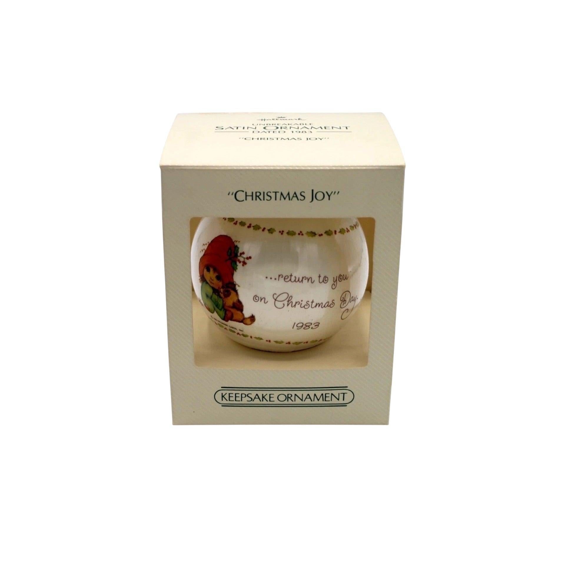 “Christmas Joy” is a 1983 Hallmark Keepsake soft-sheen satin/glass ball ornament in a warm ecru tone, featuring classic 1980s Hallmark art of a sweet holiday scene and the printed sentiment: “May All The Joy You Give Away…Return To You on Christmas Day.” The smooth satin-wrapped finish gives it an elegant vintage look that stands out beautifully among traditional glass ornaments. It comes new in its original Hallmark Keepsake box with the matching title panel and protective insert, as issued in 1983. This ornament is purely decorative with no light, sound, or motion, so no batteries, cords, power boxes, or light strings are required—just hang and enjoy.