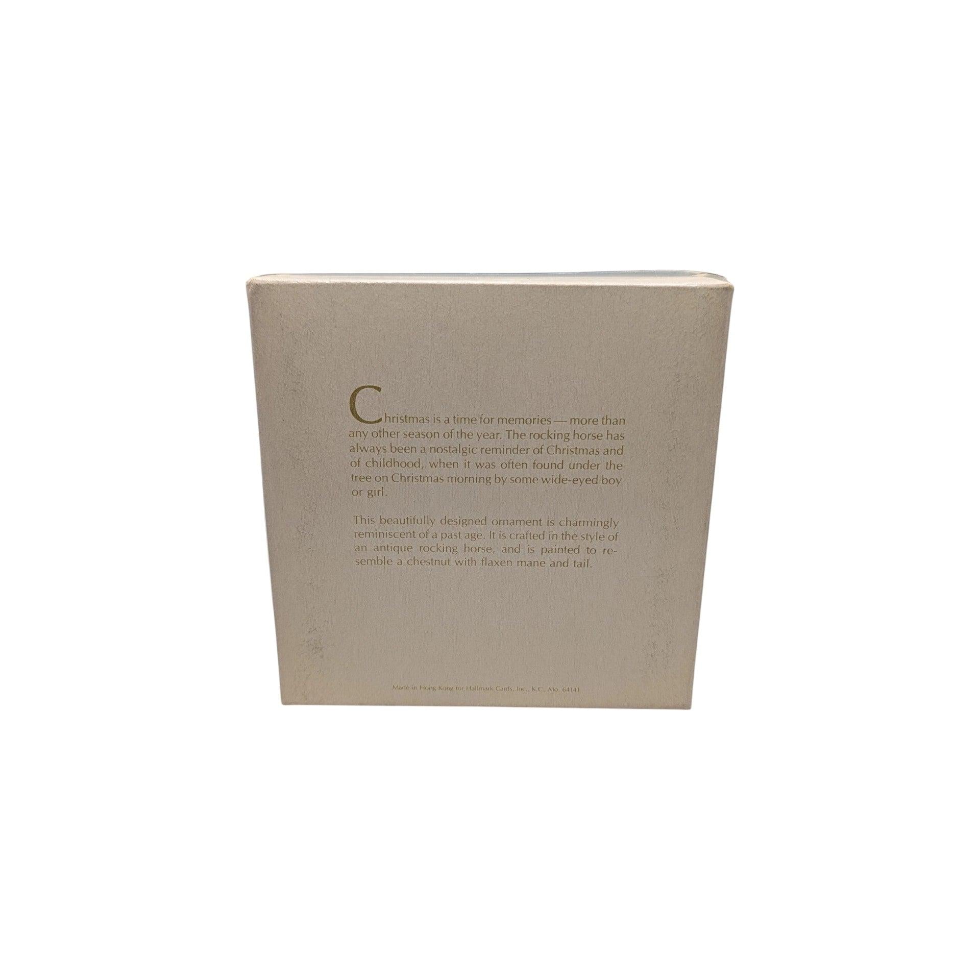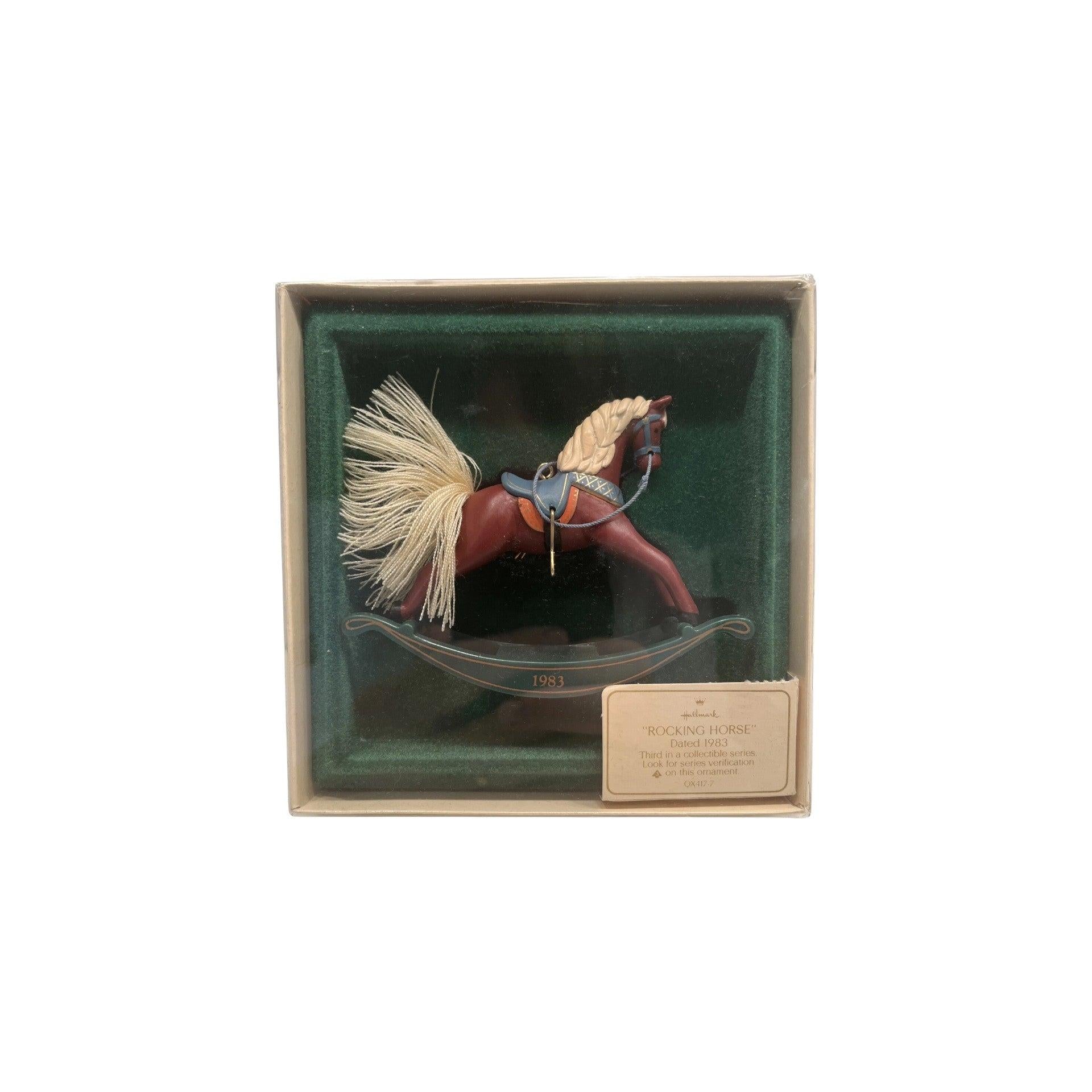 Evoking nostalgic childhood memories, this 1983 Rocking Horse ornament is the third release in Hallmark’s cherished Rocking Horse series. This beautifully crafted russet-brown horse features a flaxen mane and tail, a blue saddle, and green rockers trimmed in gold—all dated “1983” on the rocker. The ornament arrives mint in box, complete with original packaging and tag, and is ready to grace your tree—no batteries, cords, or light strings required.