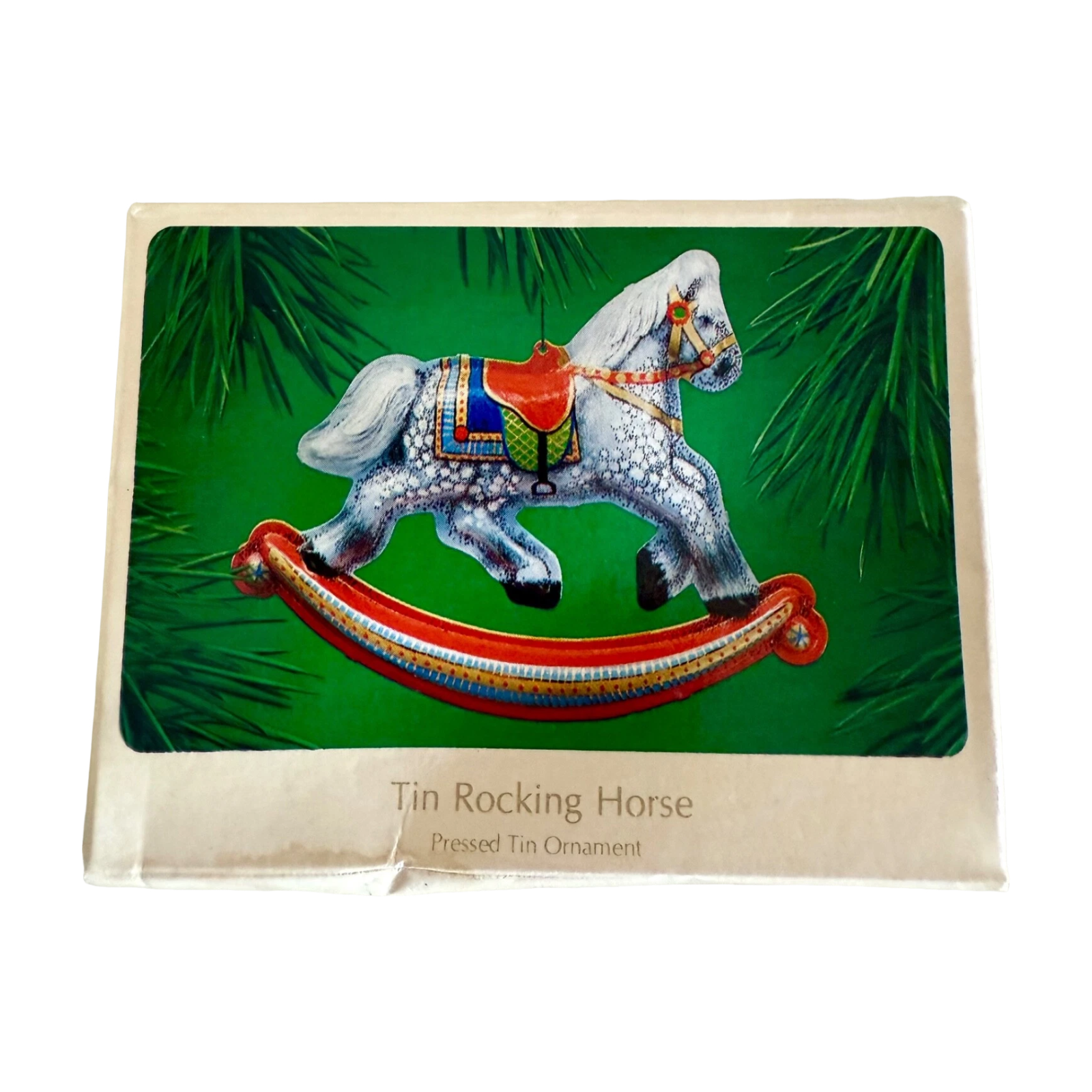 Celebrate timeless holiday charm with the 1983 Tin Rocking Horse ornament—the third entry in Hallmark’s beloved Rocking Horse series. This handcrafted tin ornament, measuring approximately 3¼ inches high, features a vintage-style rocking horse painted in festive colors with gold accents. The ornament arrives mint in box, complete with original packaging and tag. No batteries, cords, or lights are needed—simply hang and enjoy its nostalgic appeal.