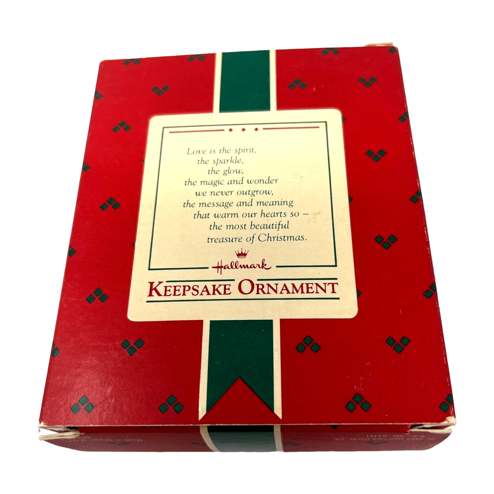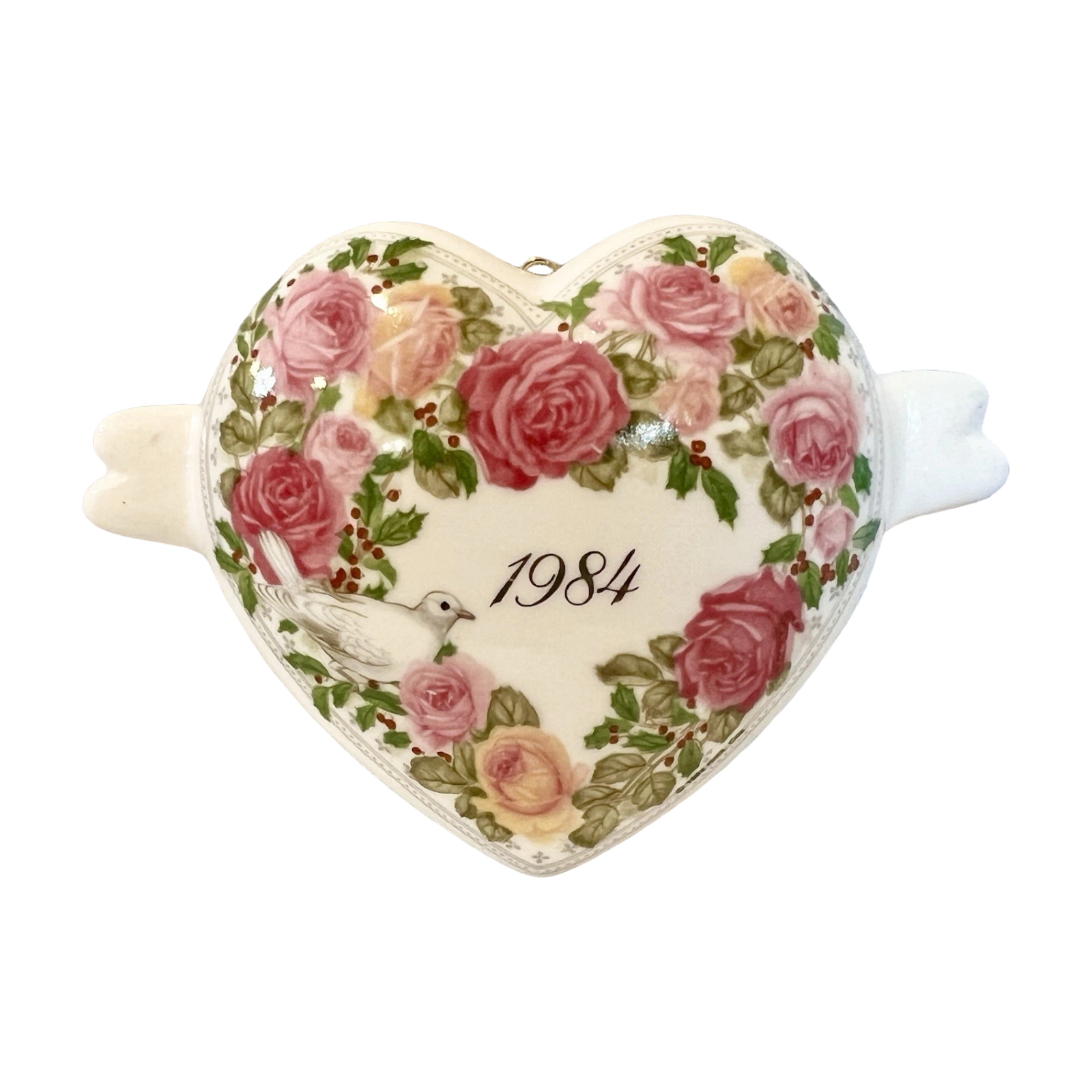 Celebrate the season of love with the 1984 A Heart Full of Love ornament—a timeless piece made of bone china. This handcrafted ornament, measuring approximately 2.75" H x 4" W, features a delicate floral design and a ribbon accent. The ornament arrives mint in box, complete with original packaging and tag. No batteries, cords, or lights are needed—simply hang and enjoy its heartfelt message.