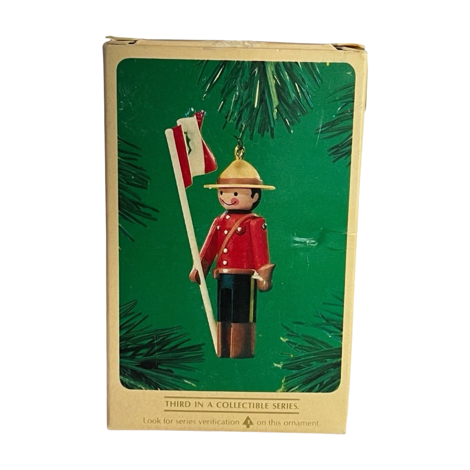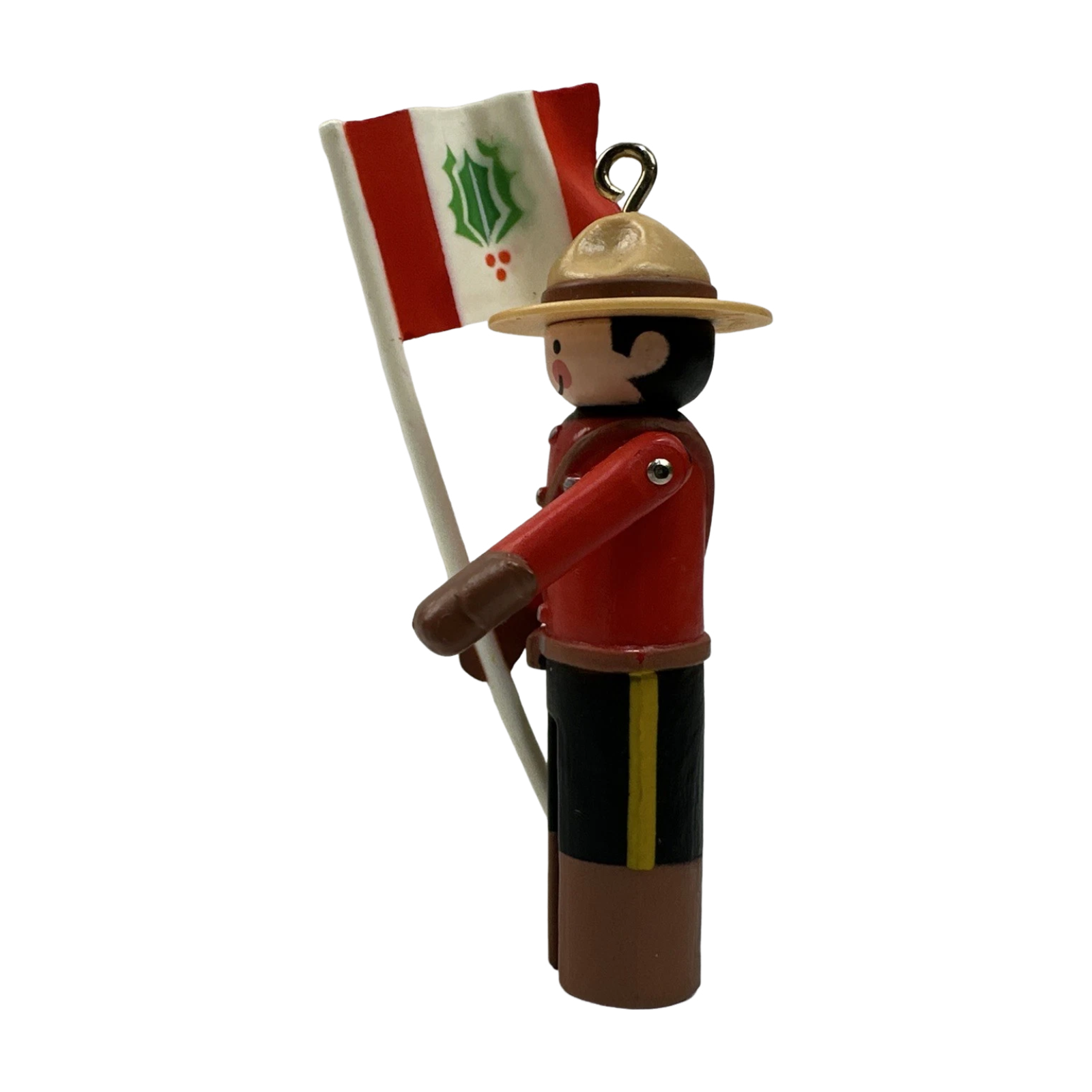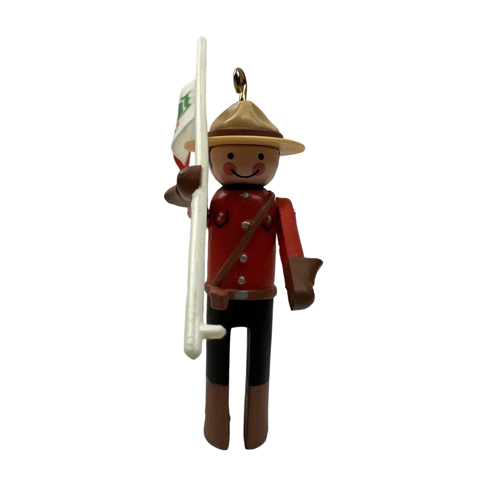 Honor a festive icon with the Canadian Mountie, the third installment in Hallmark’s playful Clothespin Soldier series, released in 1984. Designed by Linda Sickman, this miniature ornament captures a Mountie in classic red and navy regalia, complete with a clothespin-style body and a movable arm brandishing a Canadian flag. Standing approximately 3 inches tall, this vintage keepsake arrives mint-in-box, dye‑cast ornamental joy that requires no power—simply hang it and add a cheerful nod to heritage and holiday cheer.