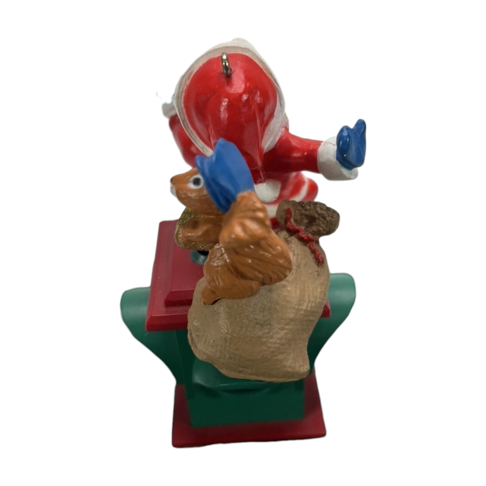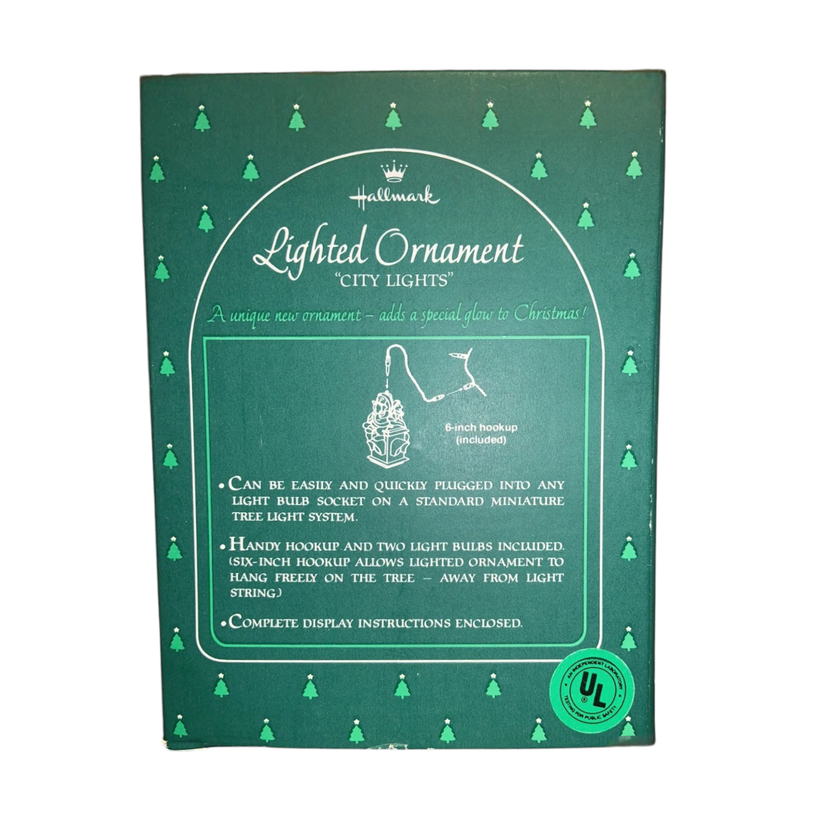 lluminate your holiday season with the 1984 City Lights Hallmark Keepsake Ornament. This charming piece features Santa Claus and a squirrel perched atop a four-way traffic signal, capturing a whimsical cityscape scene. Designed by artist Bob Siedler, the ornament lights up when connected to a standard miniature light string, bringing a warm glow to your Christmas tree. Crafted from durable plastic, it comes in its original Hallmark packaging, making it a delightful addition to any vintage ornament collection.