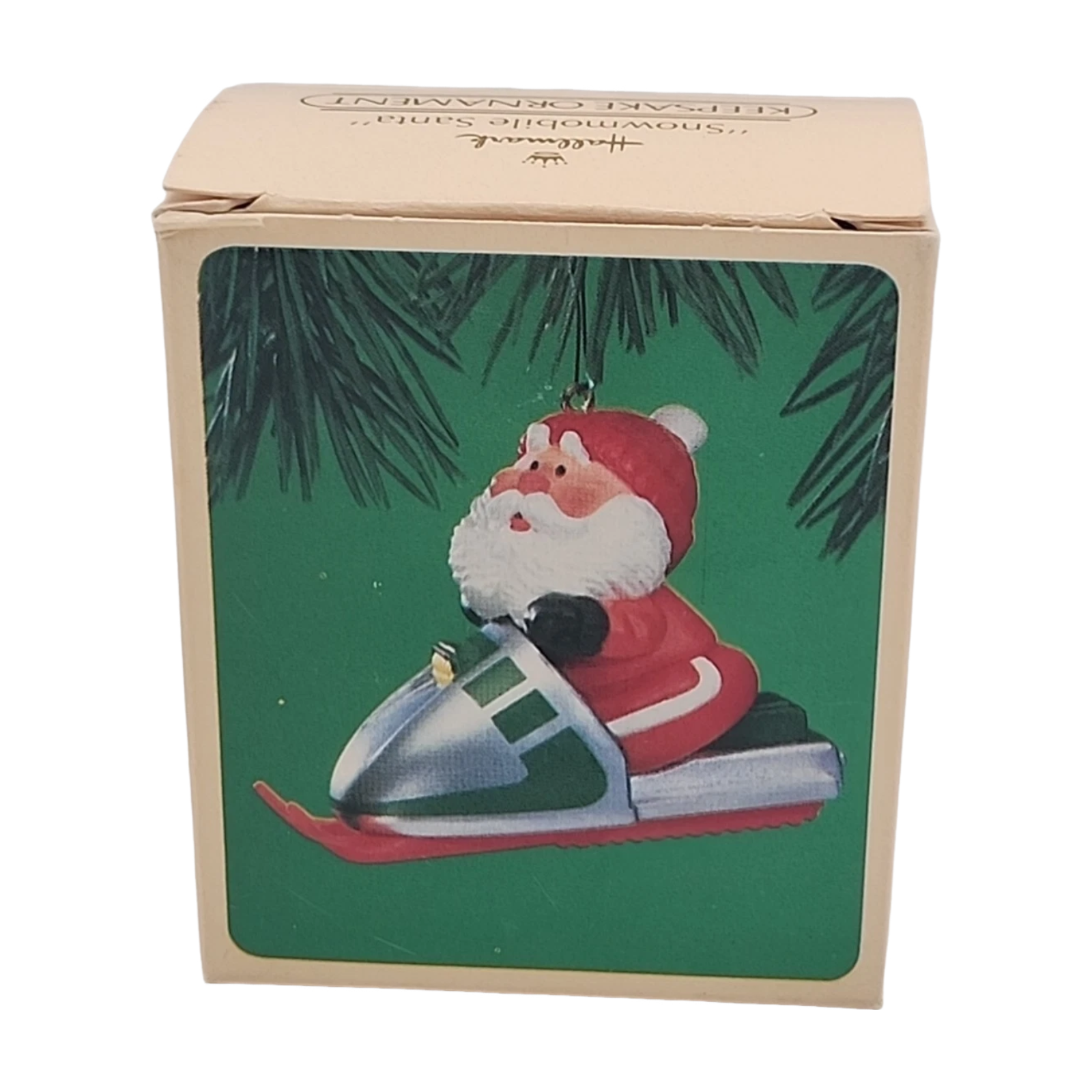 Speed into vintage holiday fun with this lively 1984 Snowmobile Santa ornament. Santa, bundled in crisp red winter gear, sits astride a silver-and-green snowmobile detailed with a red front runner—all molded in painted plastic. When sold in mint-in-box condition, the original tuck box and hang tag are included. No batteries, cords, or light strings needed—hang it on your tree and enjoy a dash of festive whimsy.