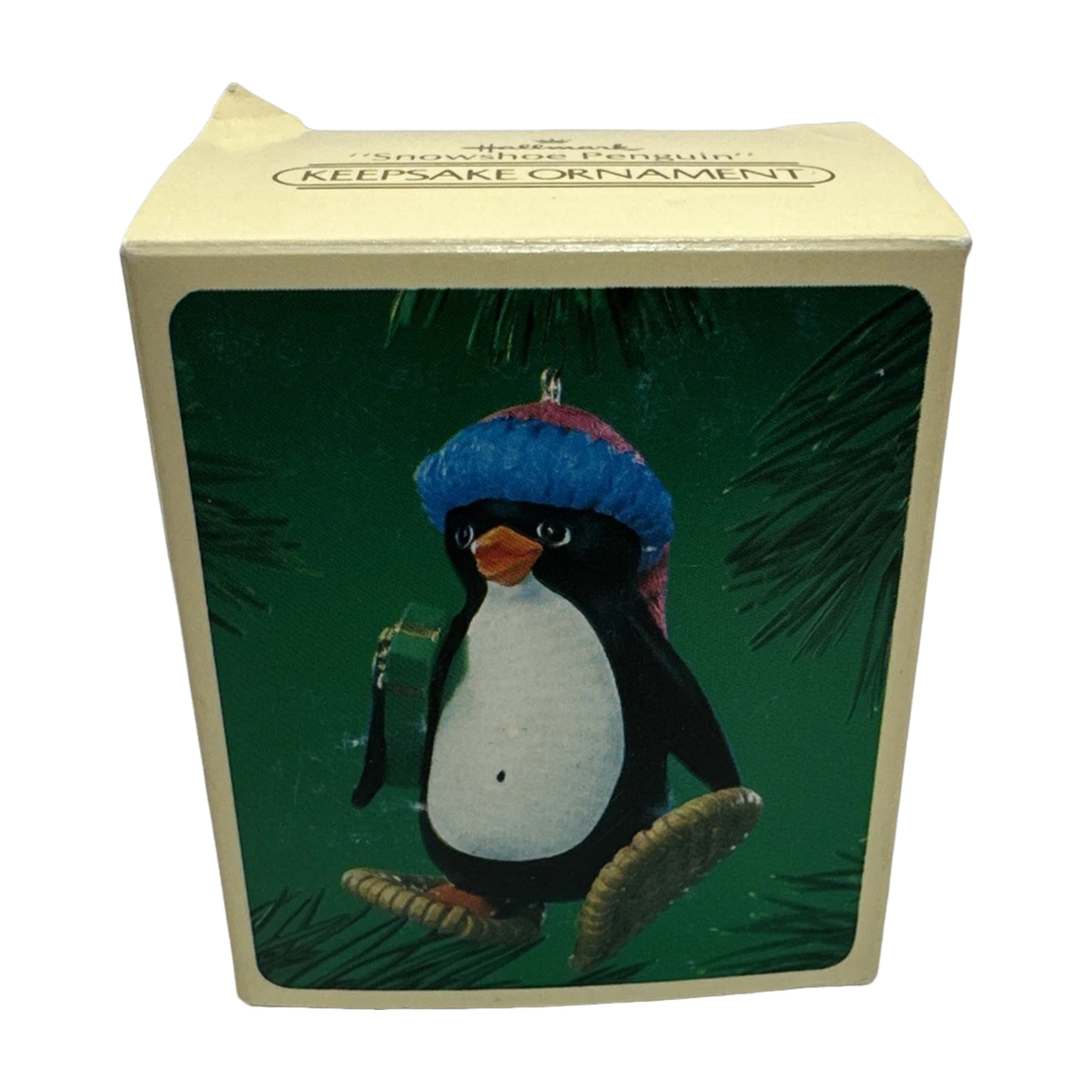 Embark on a whimsical winter journey with this 1984 Snowshoe Penguin ornament. This charming penguin, dressed in a blue-and-purple winter hat and snowshoes, holds a green gift wrapped with a golden bow—perfectly capturing playful holiday spirit. Crafted in hand‑painted mixed materials, it's a delightful miniature meant to hang on your tree. Mint‑in‑box versions typically include the original Hallmark tuck-box and hang tag. No batteries, cords, or light strings are needed—just hang it and enjoy its cozy charm.