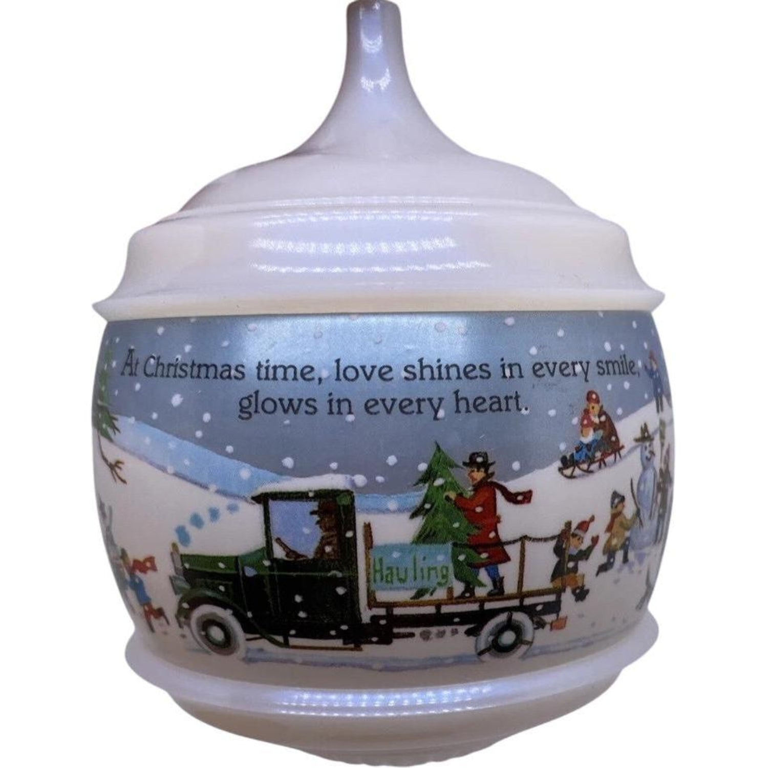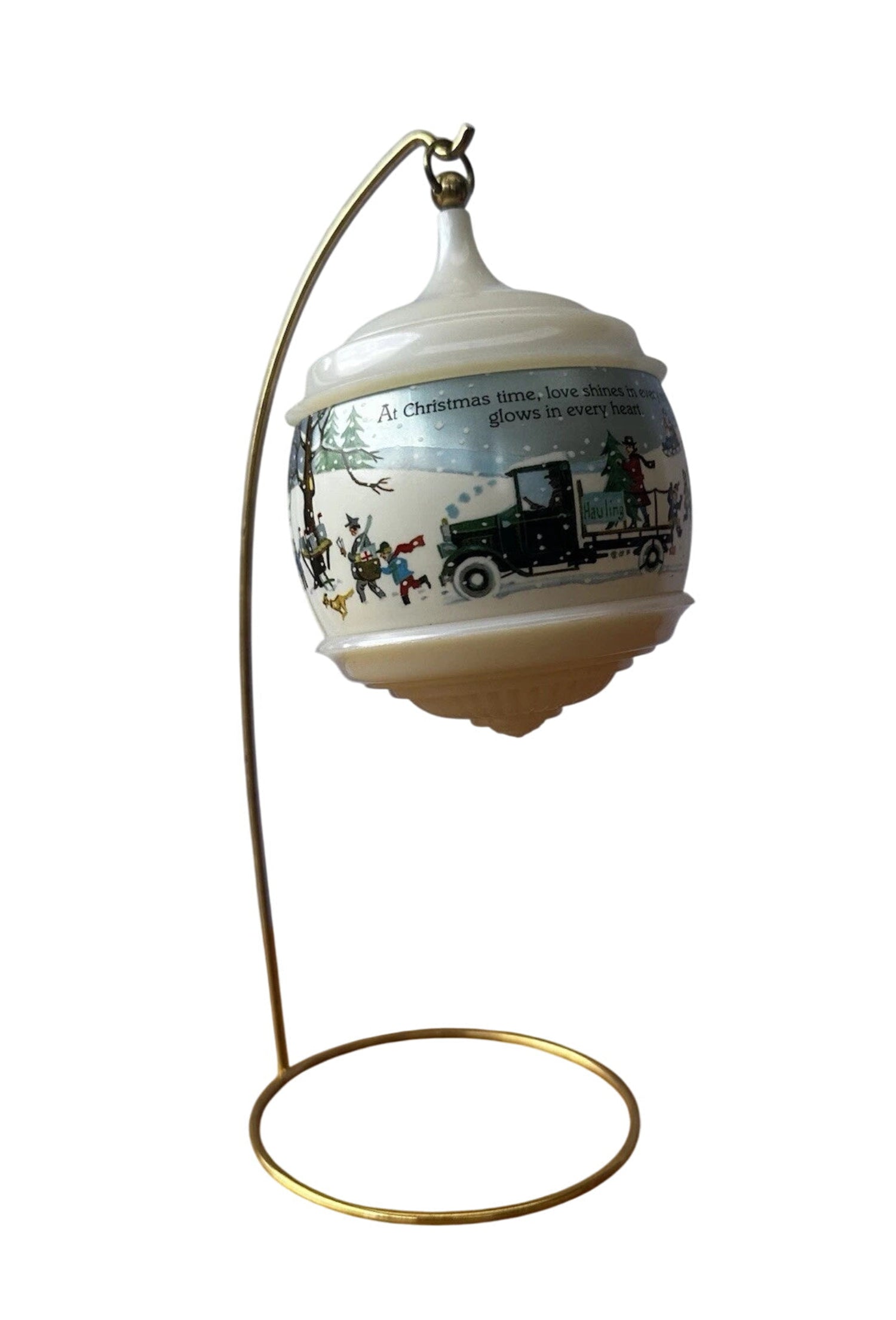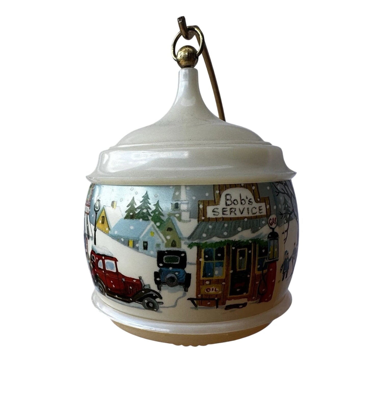 Bring the magic of music to your holiday décor with this 1984 Hallmark musical ornament. Crafted as a shimmering round ball, it plays the beloved holiday classic “White Christmas” when wound up, filling your home with festive nostalgia. The ornament features a printed scene accented with delicate design work and carries the inscription: