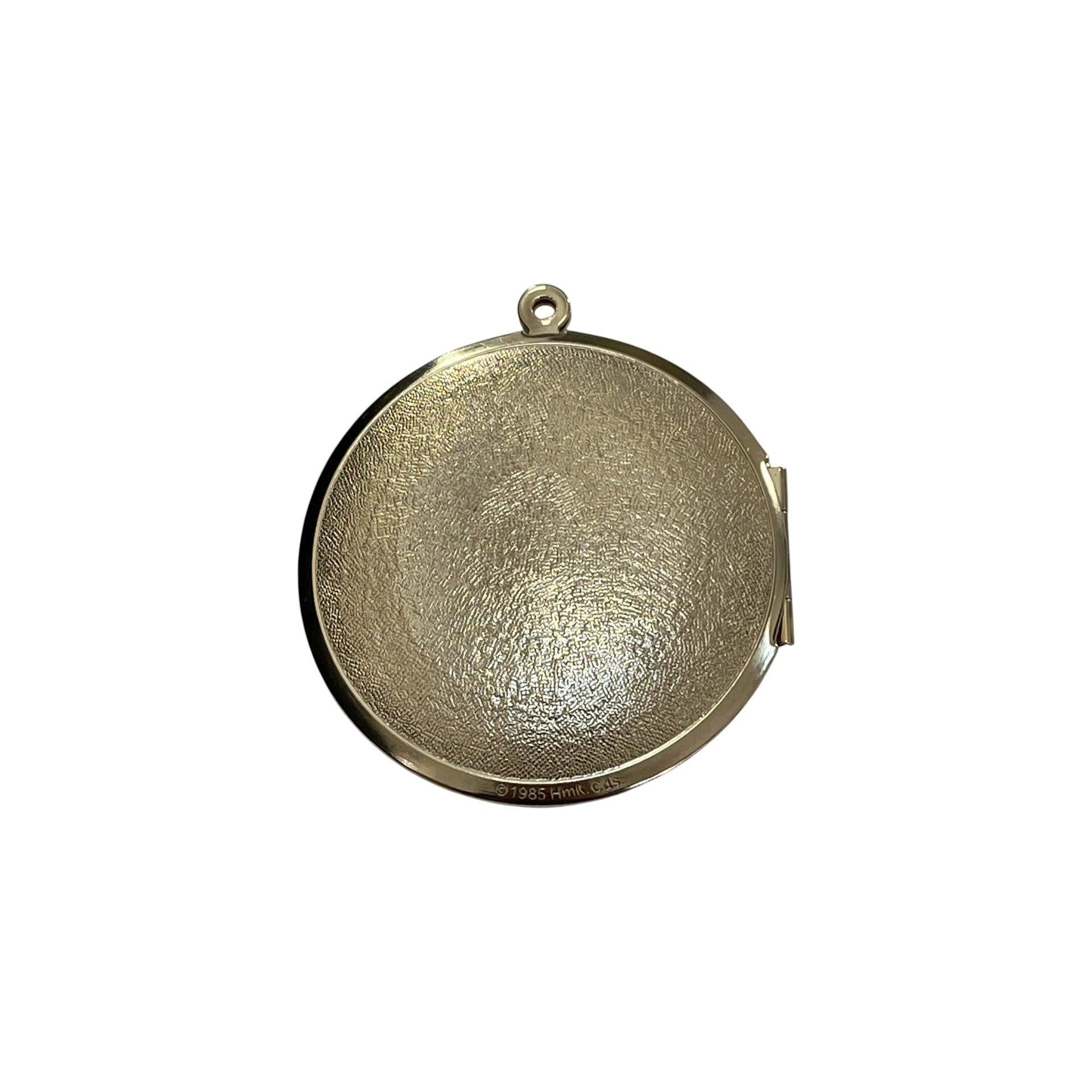 This 1985 ornament from Hallmark’s Photo Holder series features a charming baby-themed locket design, created to hold a tiny photo—perfect for commemorating a baby’s first Christmas or preserving a favorite early-memories snapshot. The ornament typically resembles a delicate locket with holiday accents such as holly, ribbons, or soft pastel detailing appropriate for newborn keepsakes. It usually includes its original Hallmark box and is intended for decorative display only. There are no lights, motion, or sound features, so no batteries, cords, or light strings are required.