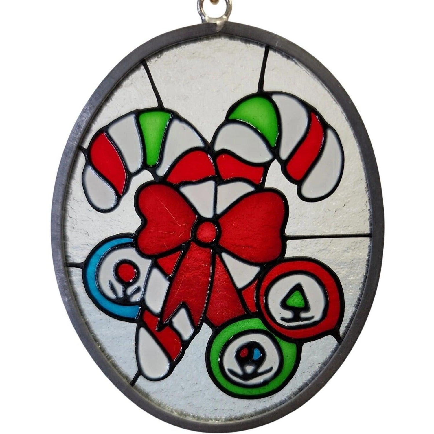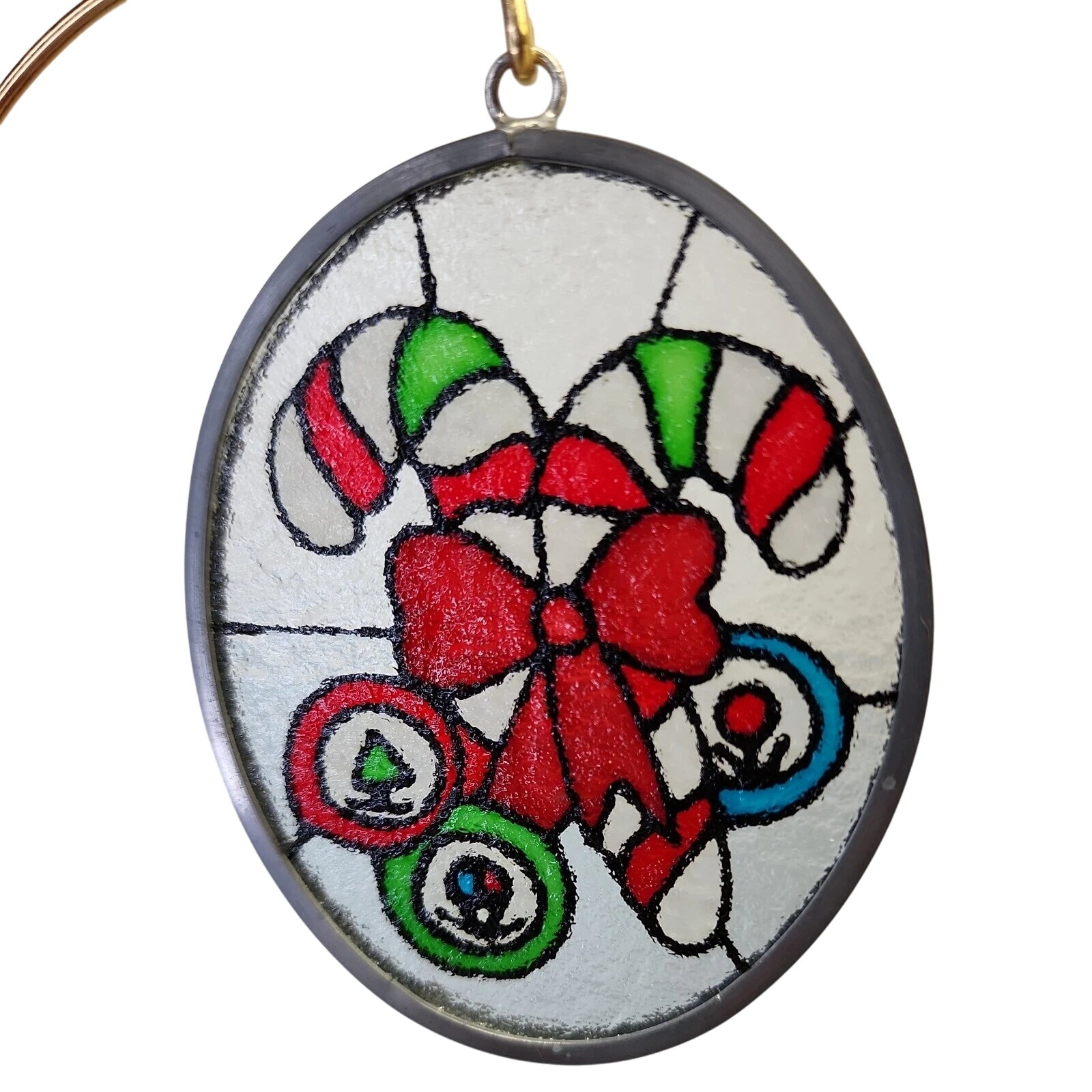 Materials: Beveled glass or translucent resin with candy cane and bow motif—stained-glass effect