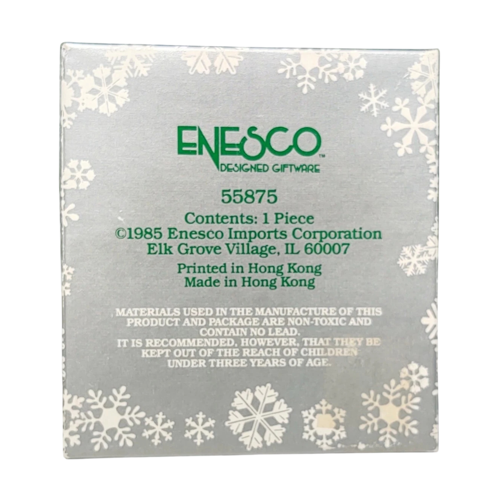 This enchanting 1985 Enesco ornament, titled Fishing for Stars, captures a tender and imaginative Christmas moment. It features a cherubic child angel seated on a crescent moon, holding a golden fishing pole as they reach down to “catch” a dangling star. The soft pastel coloring, gentle facial expression, and celestial theme perfectly represent Enesco’s charming 1980s artistic style. Each ornament was finely hand-painted and finished with subtle shimmer accents. Originally issued in a white-and-blue Enesco box, this piece includes a gold hanging cord for display. No batteries, cords, or lights are required — simply hang it on your tree to add a dreamy, peaceful touch.