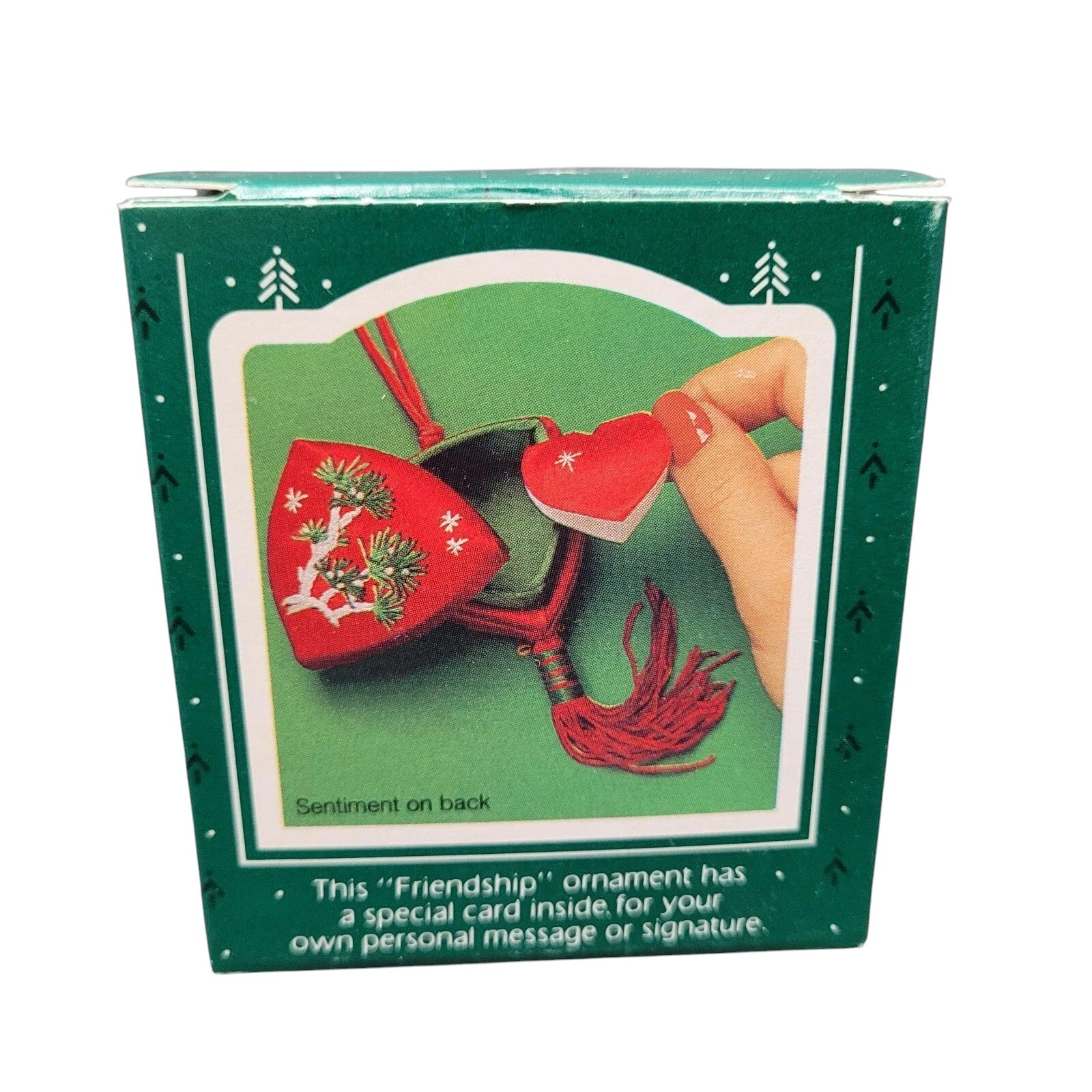 This heartwarming 1985 Hallmark ornament, titled Friendship, celebrates the simple joy of companionship and caring during the holiday season. The design features two cheerful teddy bears sitting side by side on a red heart-shaped base, sharing a candy cane. The words “Friendship is the sweetest gift” are beautifully inscribed, making this piece a thoughtful token for a close friend. The ornament was originally issued in a Hallmark Keepsake box and includes its gold hanging cord. No batteries, cords, or lights are required — simply hang it on your tree as a lasting reminder of love and friendship.