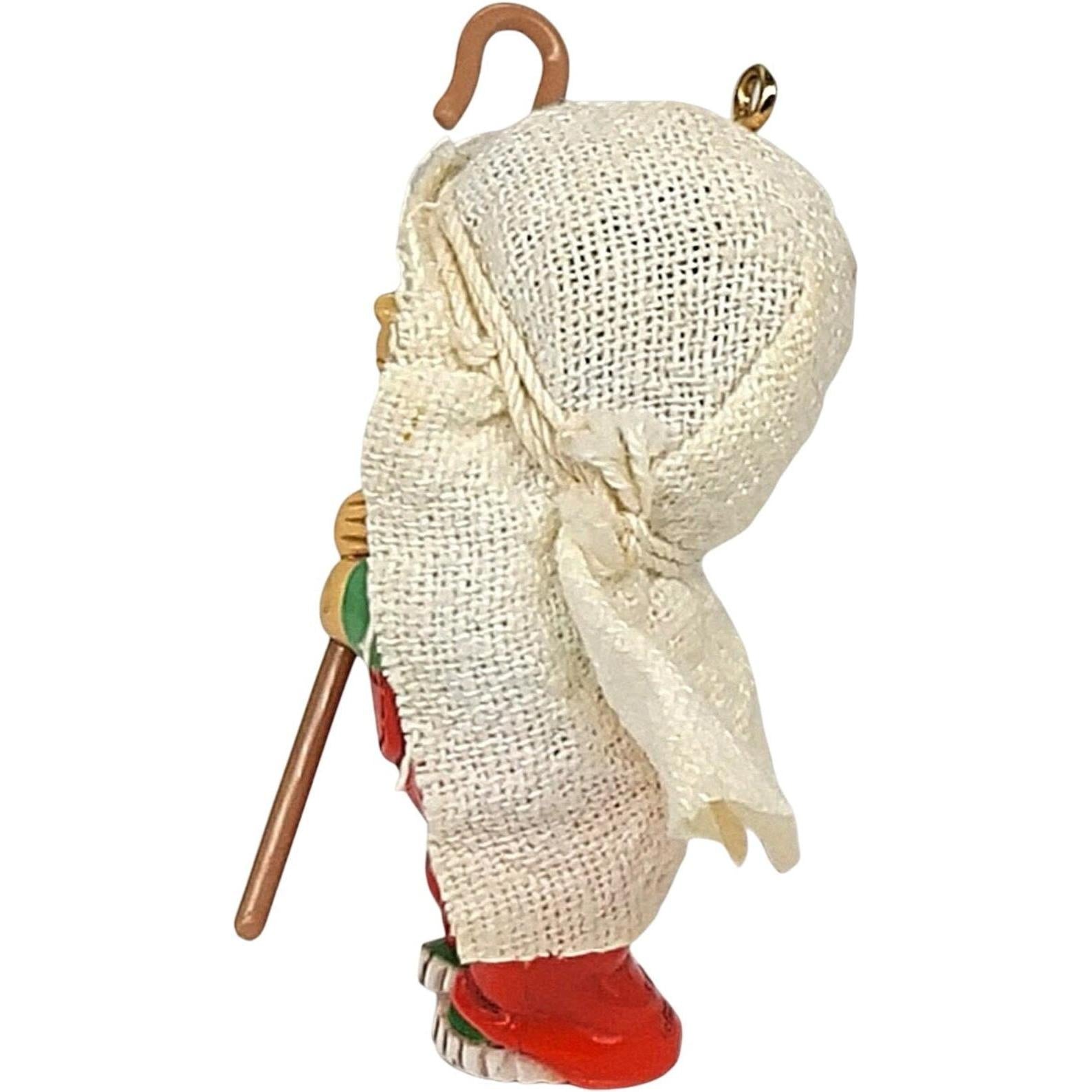 Rekindle the spirit of the Nativity with the 1985 Kit the Shepherd ornament—featuring a handcrafted shepherd child wearing red trousers and a green shirt, holding a wooden staff and draped in a soft white hooded cloth. This festive miniature comes in its original red-and-green Hallmark box with “Kit the Shepherd” branding and collector-friendly presentation. No batteries, cords, magic cords, or adapters are needed—its charm lies in timeless handcrafted detail and symbolic presence.