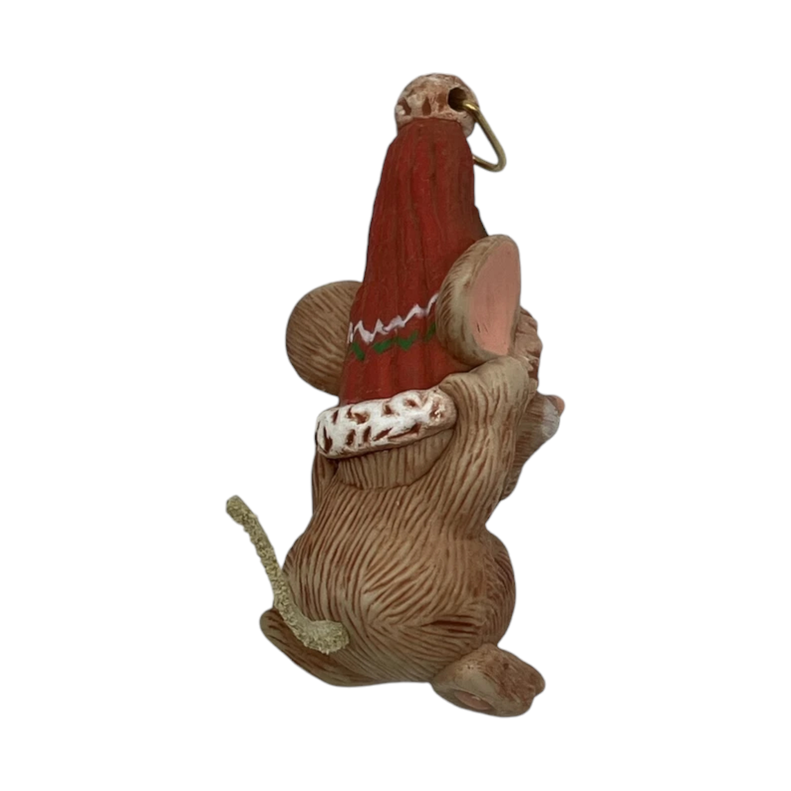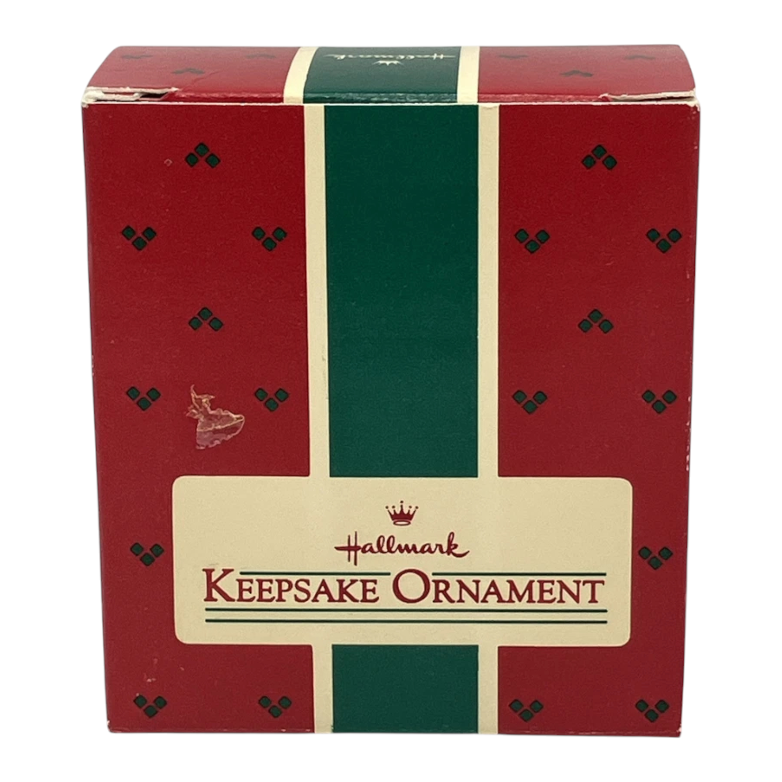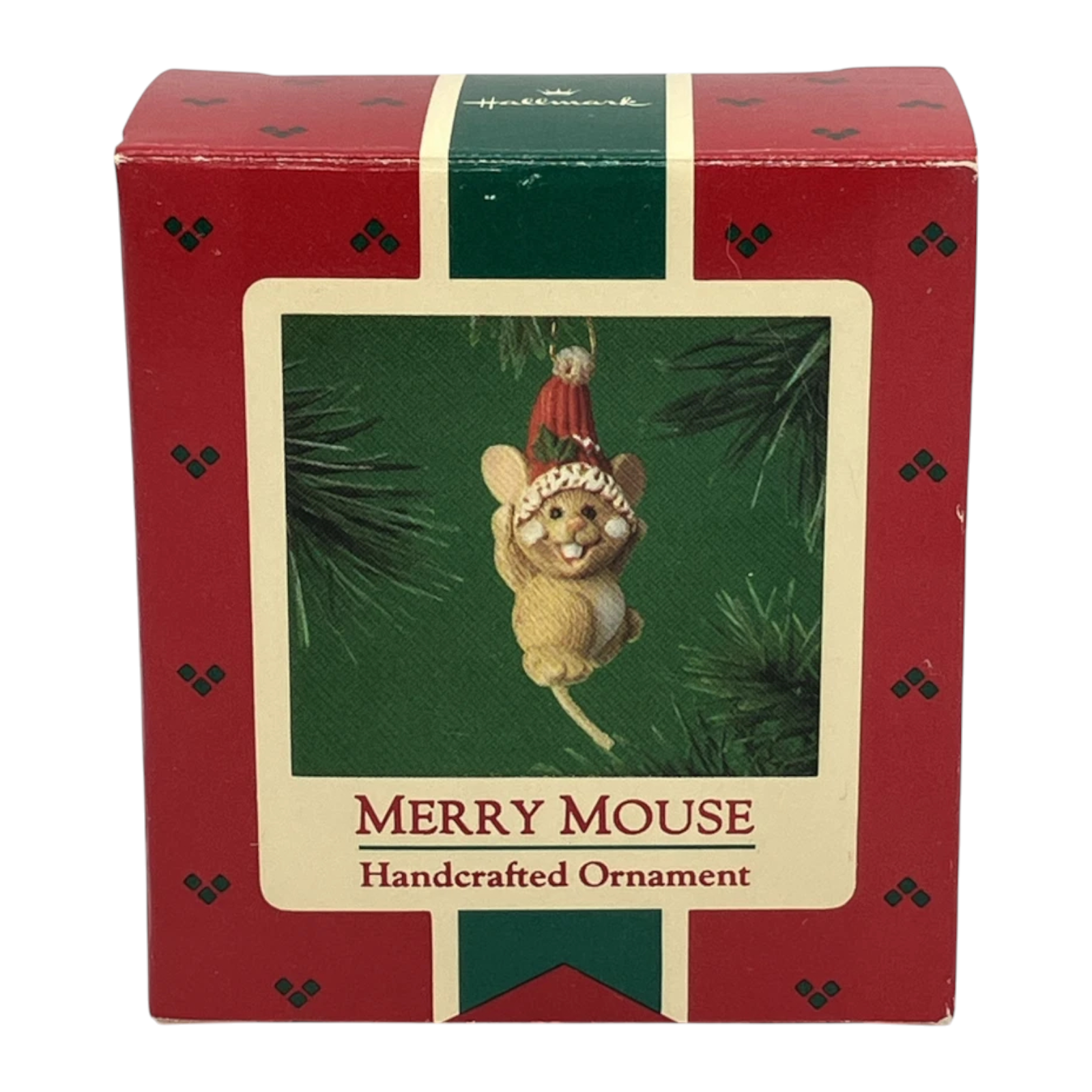 Sweet nostalgia meets festive fun in the 1985 Merry Mouse ornament, showcasing an adorable little brown mouse clutching onto his tall red knit cap as he dangles creatively from your Christmas tree. The whimsical design captures holiday cheer in miniature form. This collectible arrives in its original box (when listed as mint-in-box), accompanied by the classic dated tag and collector-friendly presentation. No batteries, cords, or power accessories are required—fully decorative and delightfully simple.