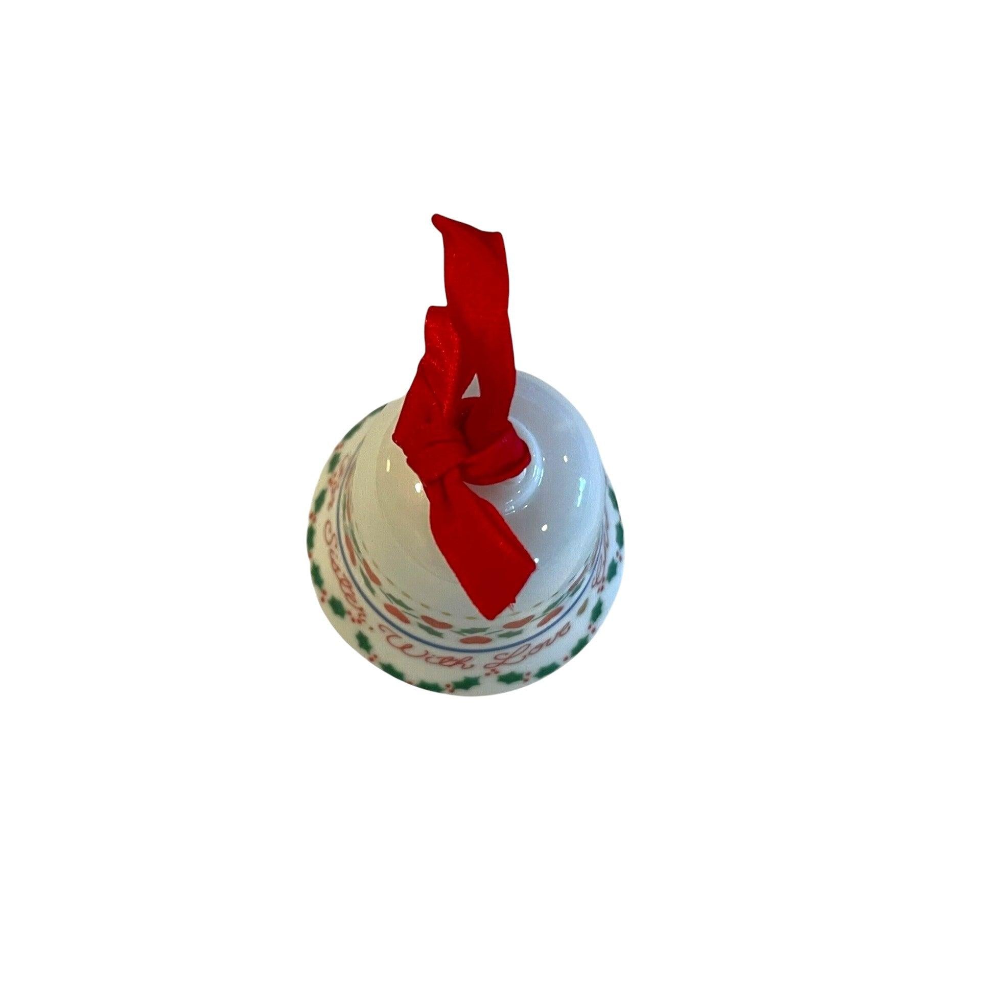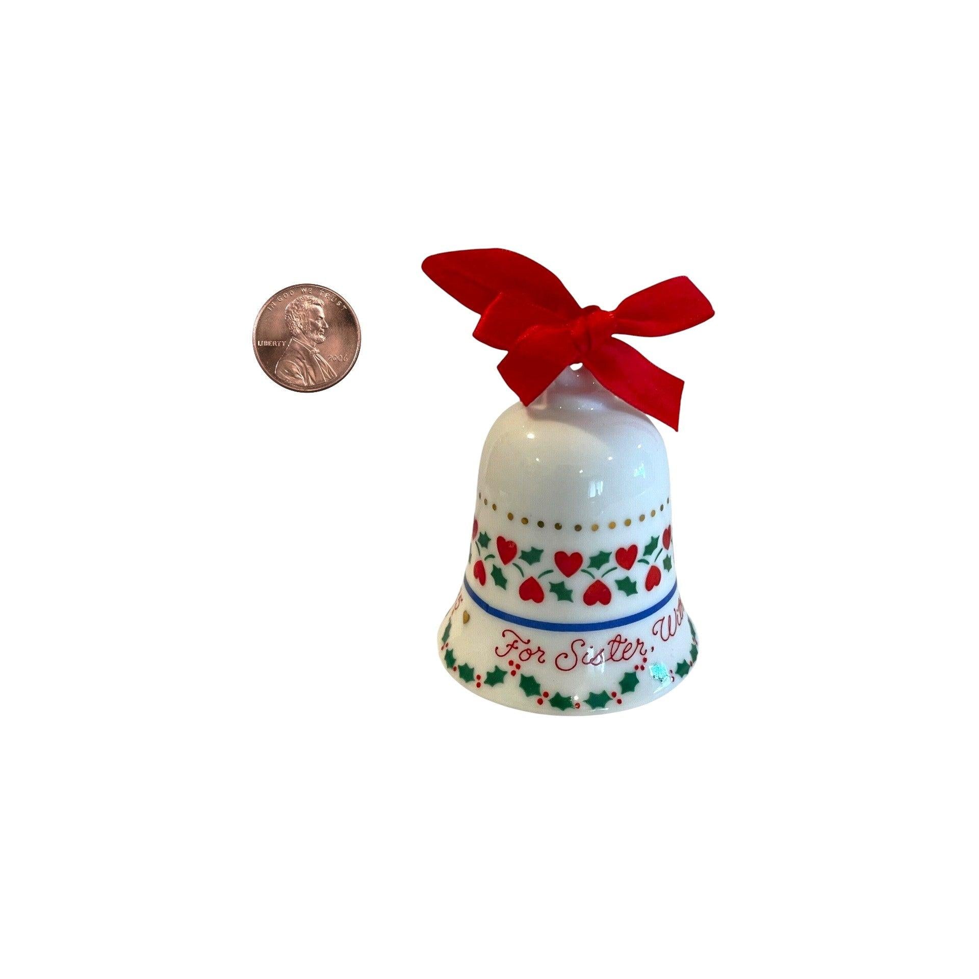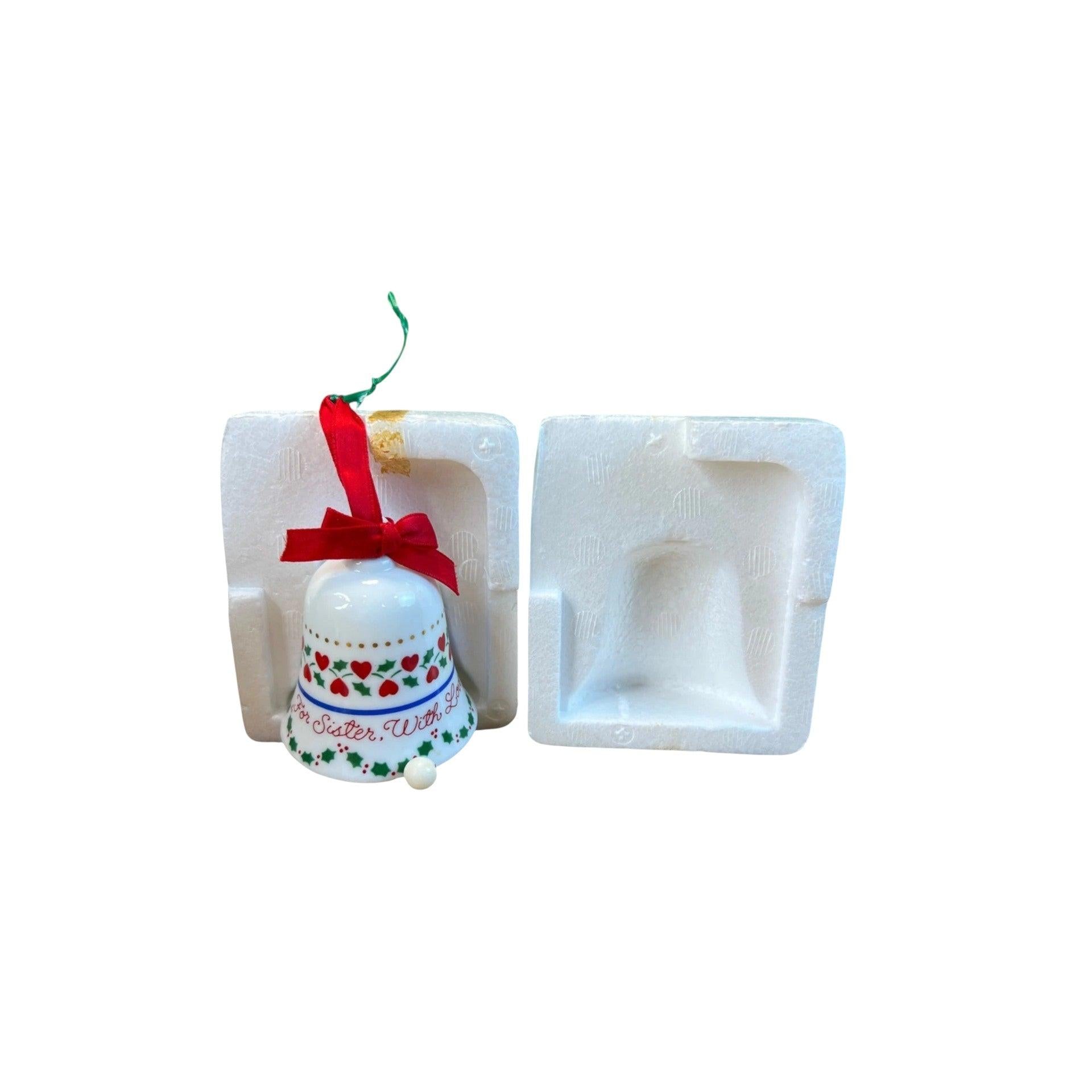 Celebrate the special bond with the 1985 Sister ceramic bell ornament, inscribed “For Sister, With Love.” This delicate porcelain bell, adorned with holly, hearts, and gold trim, stands about 2½″ tall and exudes classic holiday elegance. Presented in its original dated green Hallmark box with festive graphics, it’s a timeless keepsake. This purely decorative piece requires no batteries, cords, lights, or power—just heartfelt sentiment and quality craftsmanship. .
