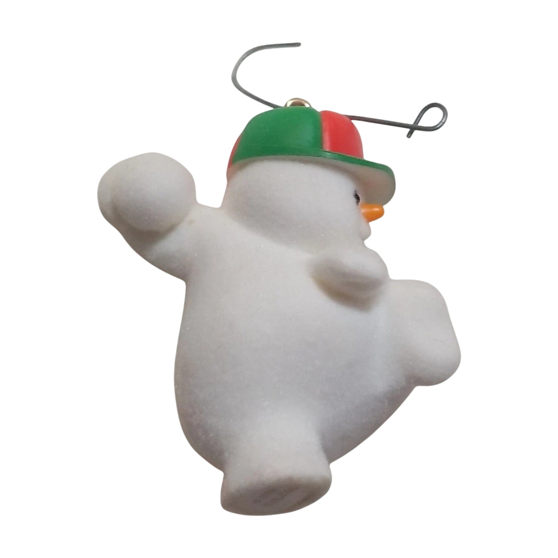 Celebrate playful winter nostalgia with the 1985 Snow Pitching Snowman ornament—featuring a flocked snowman mid-windup, wearing a festive red-and-green cap, about to pitch a snowball with joyful action. This handcrafted miniature comes in its original red-and-green collector’s box bearing the name Snow‑Pitching Snowman and the year stamp. No batteries, cords, lights, or power required—just vintage charm captured in motion.
