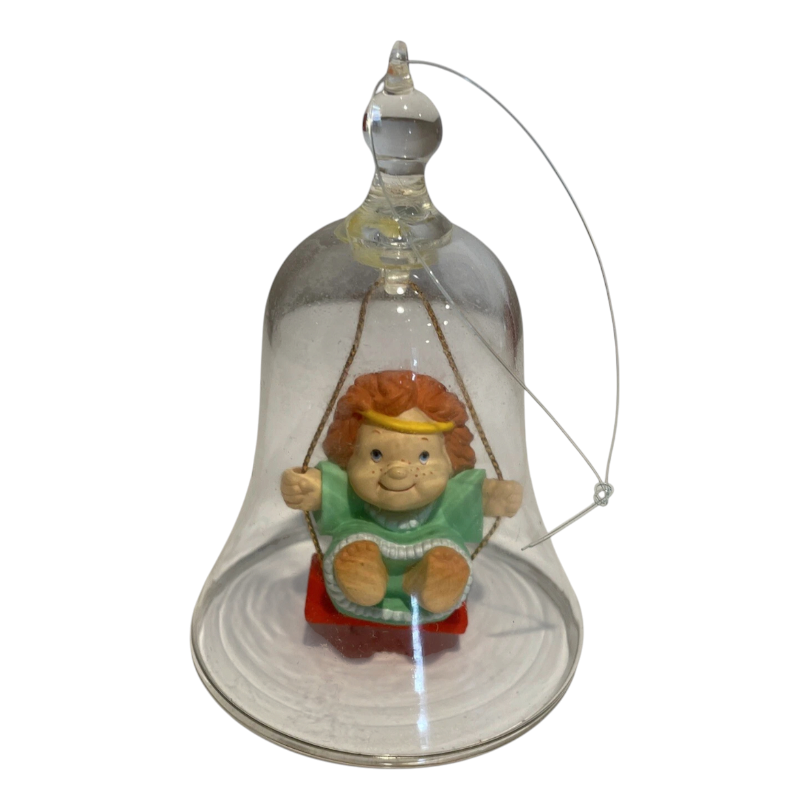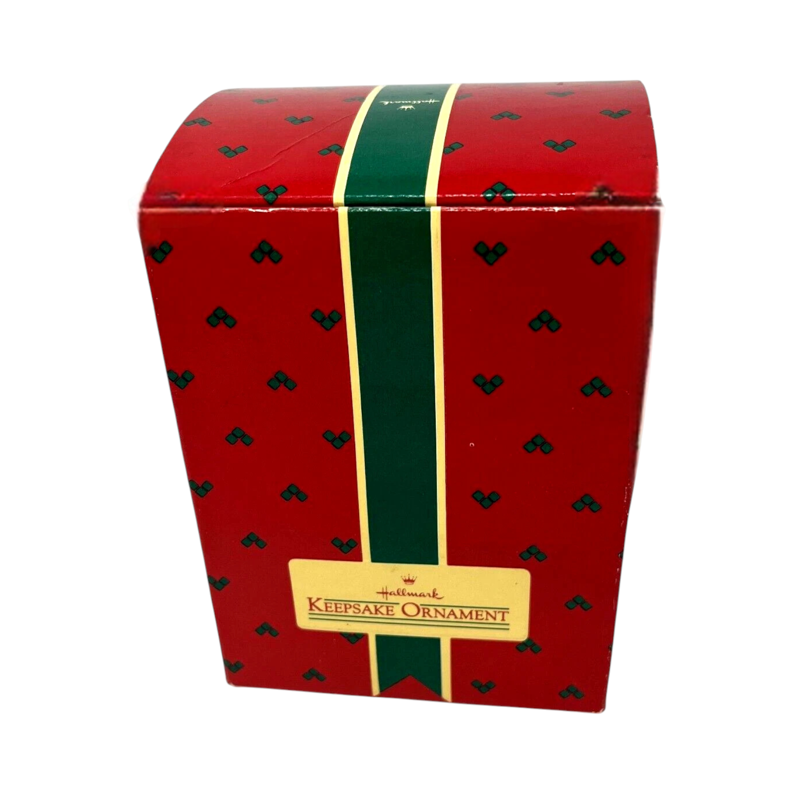 This lovely 1985 Hallmark ornament features a graceful angel dressed in flowing white robes and golden trim, holding onto a small swinging bell that chimes softly when moved. The angel’s delicate wings and serene expression capture the peaceful spirit of Christmas, while the movable bell adds a touch of interactive charm. This ornament was part of Hallmark’s handcrafted bell-themed designs of the mid-1980s and was originally issued in a dated Hallmark Keepsake box with a gold hanging cord. No batteries, cords, or lights are required — simply hang and let the gentle bell sound bring warmth and harmony to your holiday décor.