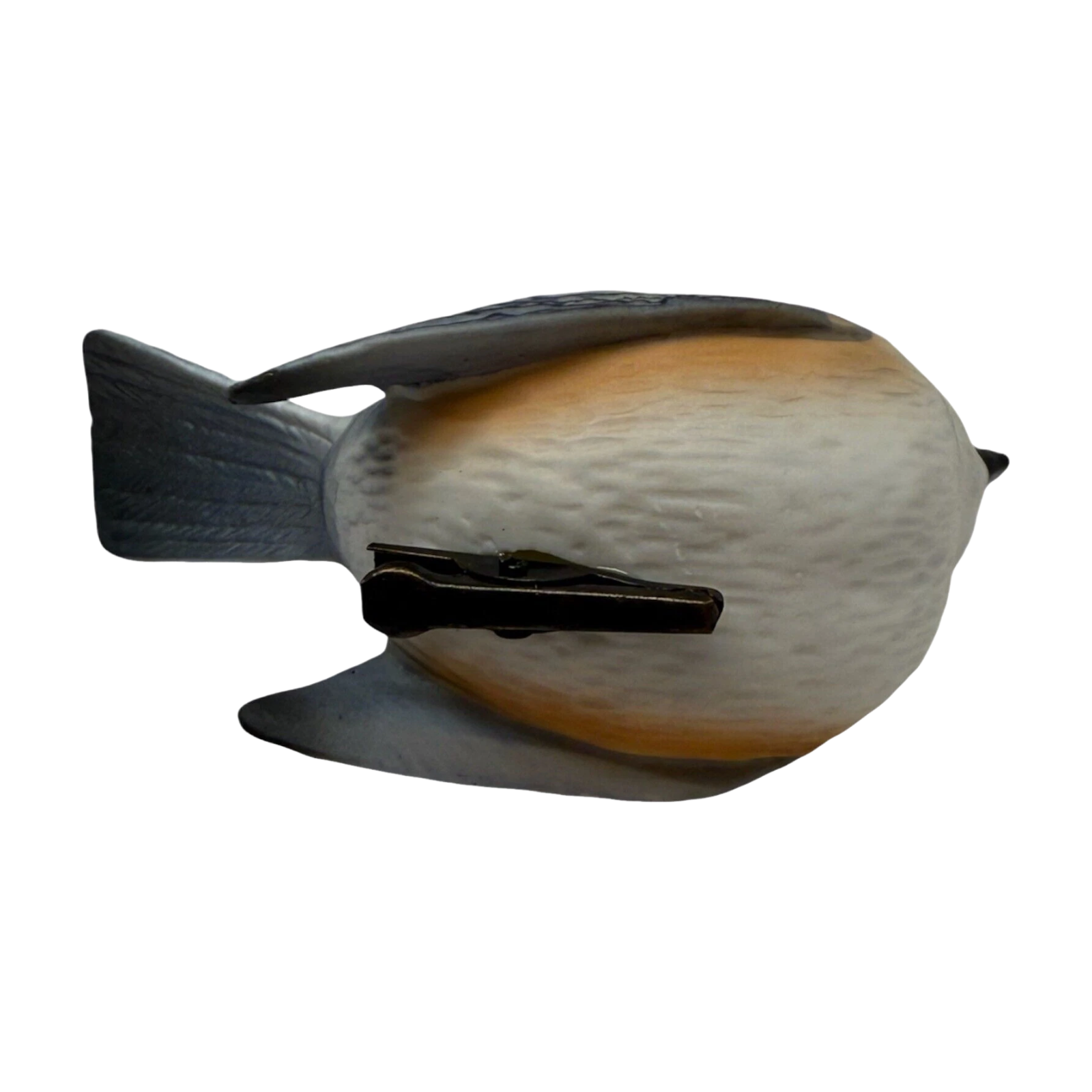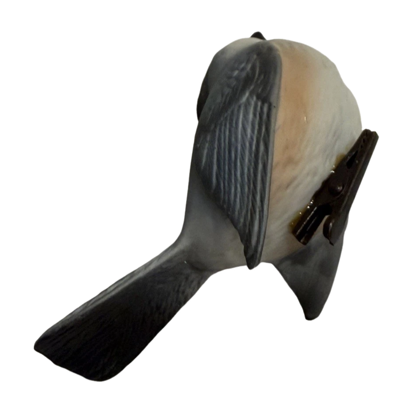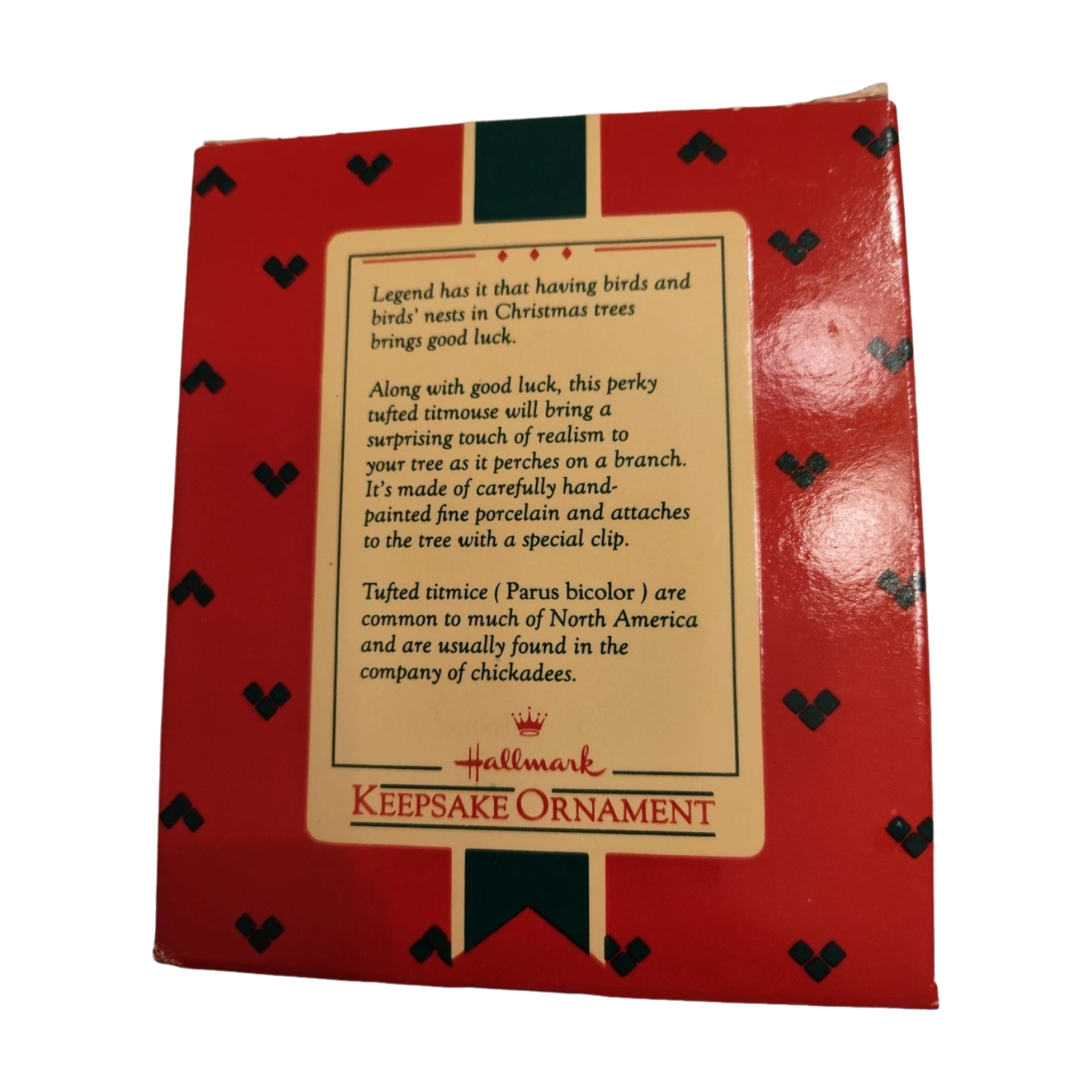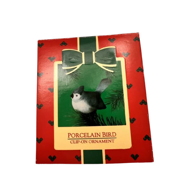 Delight the nature lover in your life with this 1985 Porcelain Bird ornament—a finely crafted tufted titmouse in graceful gray tones with a crisp white chest and sleek black beak. This elegant clip‑on figure comes in its original Hallmark box stamped with “Porcelain Bird,” dated “1985,” and features classic evergreen-and-red packaging. No batteries, cords, or lights—just timeless porcelain beauty perfect for adding charm to your tree.