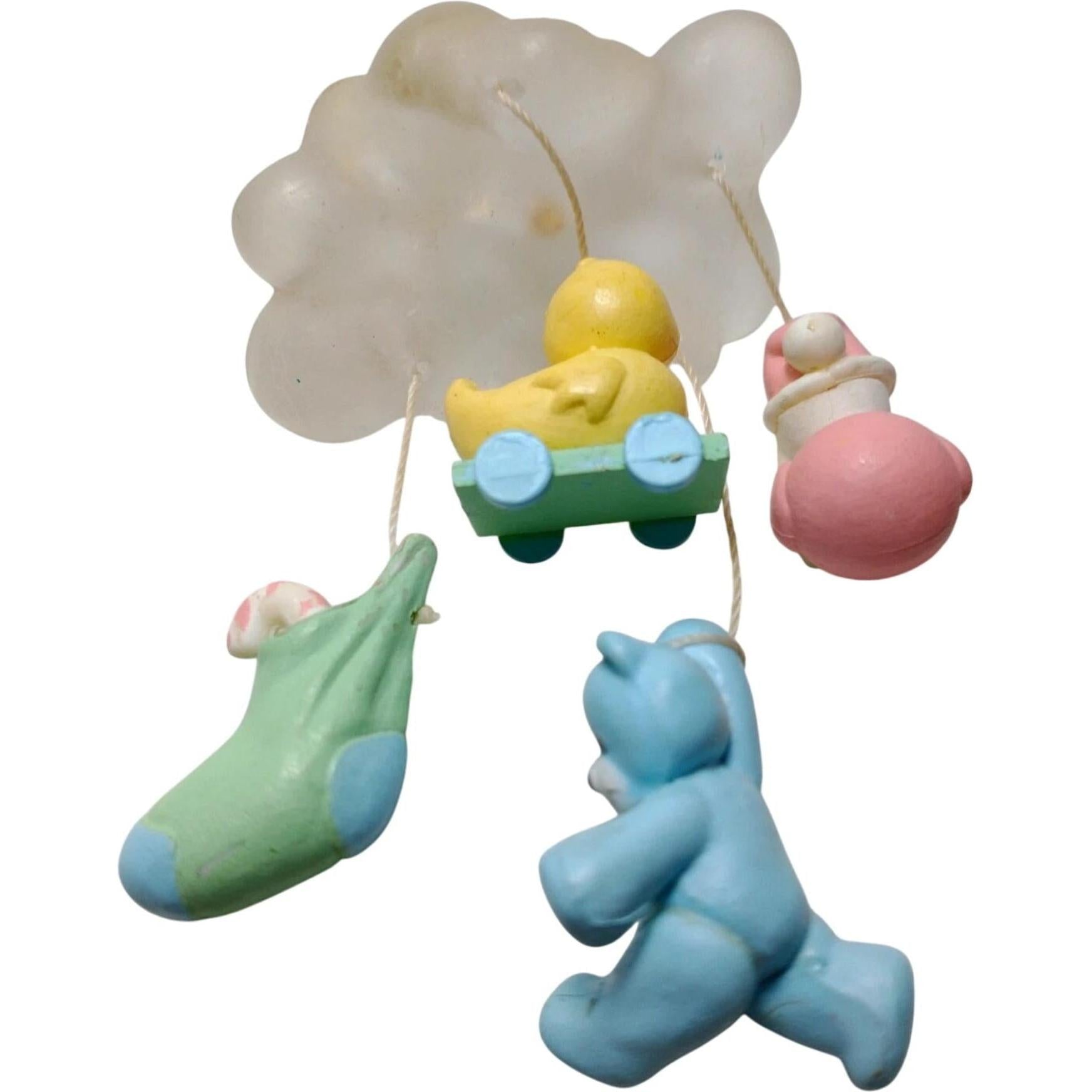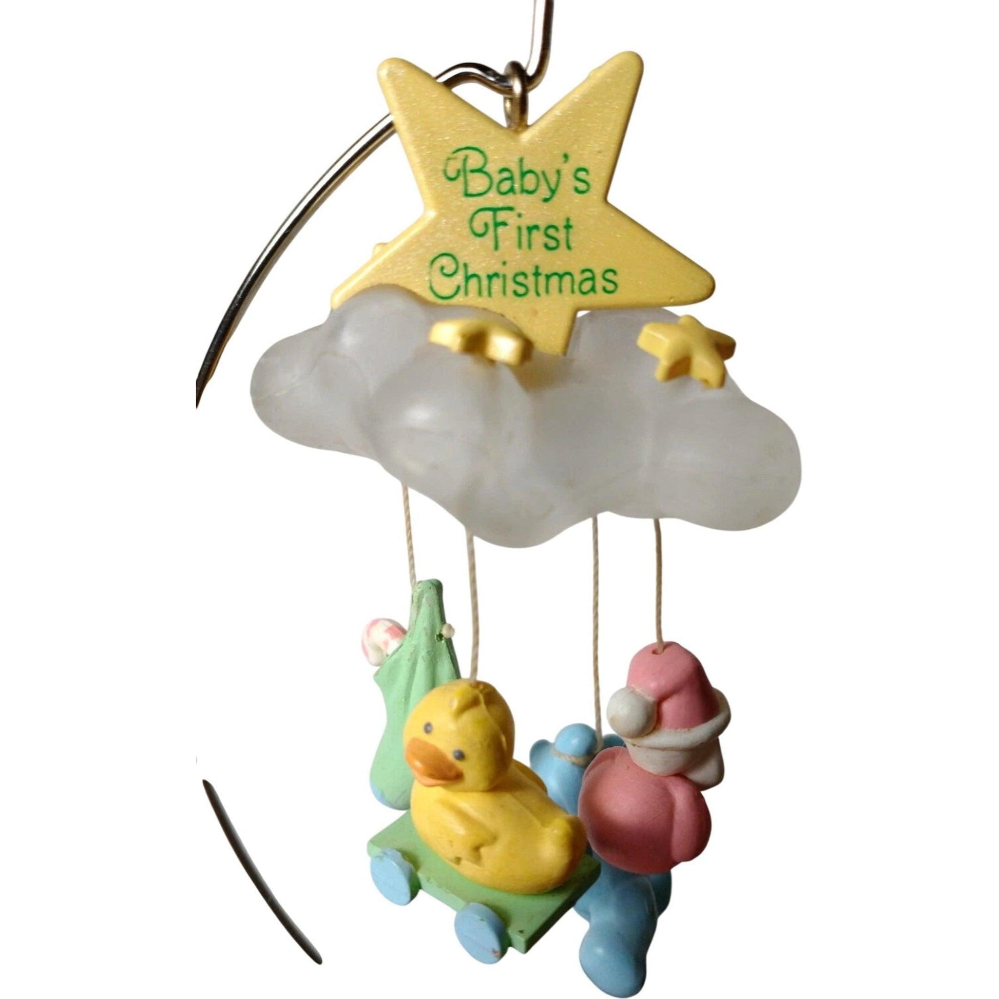 Celebrate the joy of a baby's inaugural holiday with this sweet keepsake mobile ornament. Featuring a cloud-shaped pedestal from which Santa, a toy duck, a teddy bear, and a candy-cane–filled stocking gently dangle, it embodies the enchantment of first Christmas memories. This collectible arrives ready for display in its original box—no power or accessories needed for this charming heirloom.