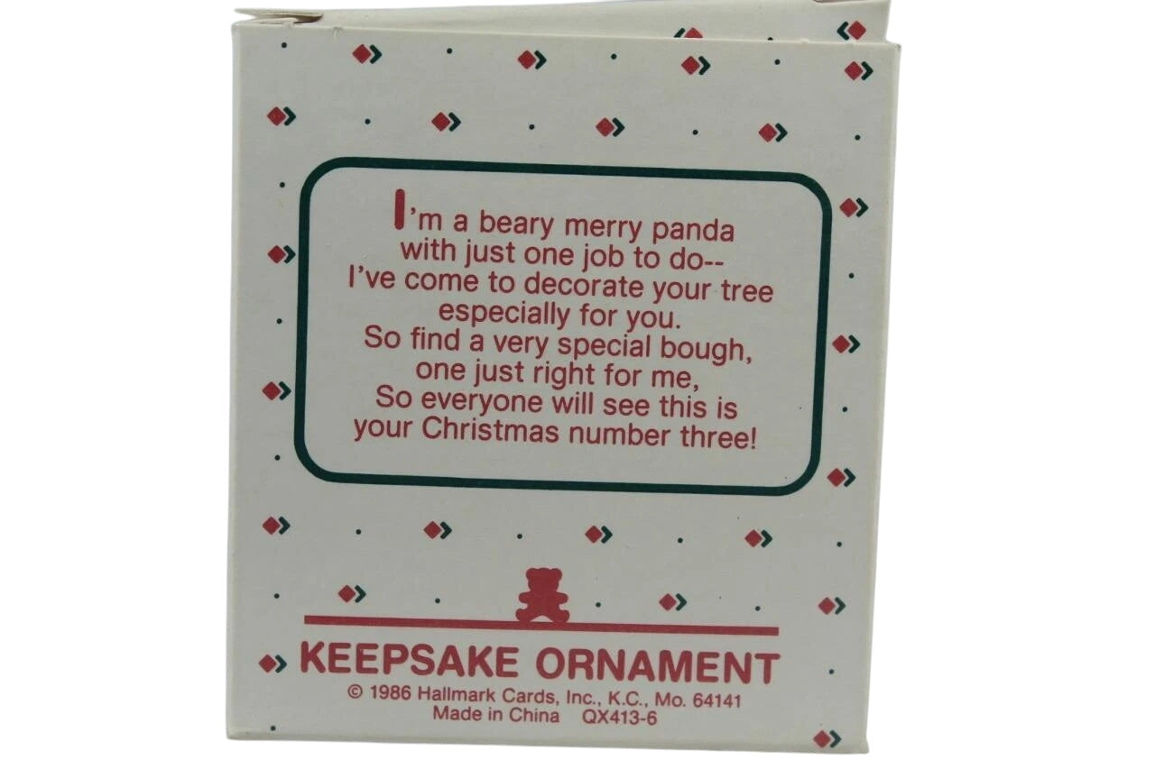 Celebrate that special milestone with the 1986 Child’s Third Christmas (Child’s Age Collection) ornament. This charming keepsake features a panda bear dressed in a festive red outfit and Santa hat, holding a green medallion that reads “My Third Christmas 1986.” The soft fabric texture and classic Hallmark detailing evoke a nostalgic, heartfelt tribute to a child’s third holiday season.