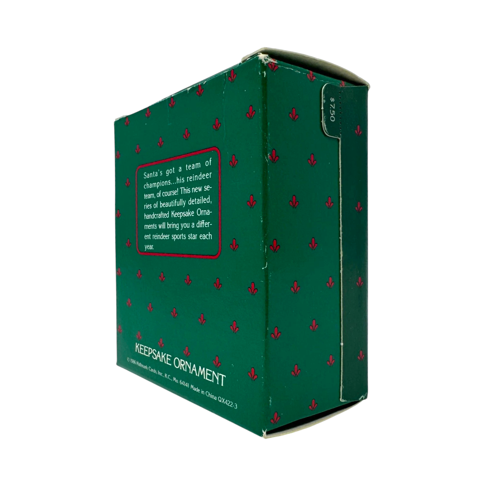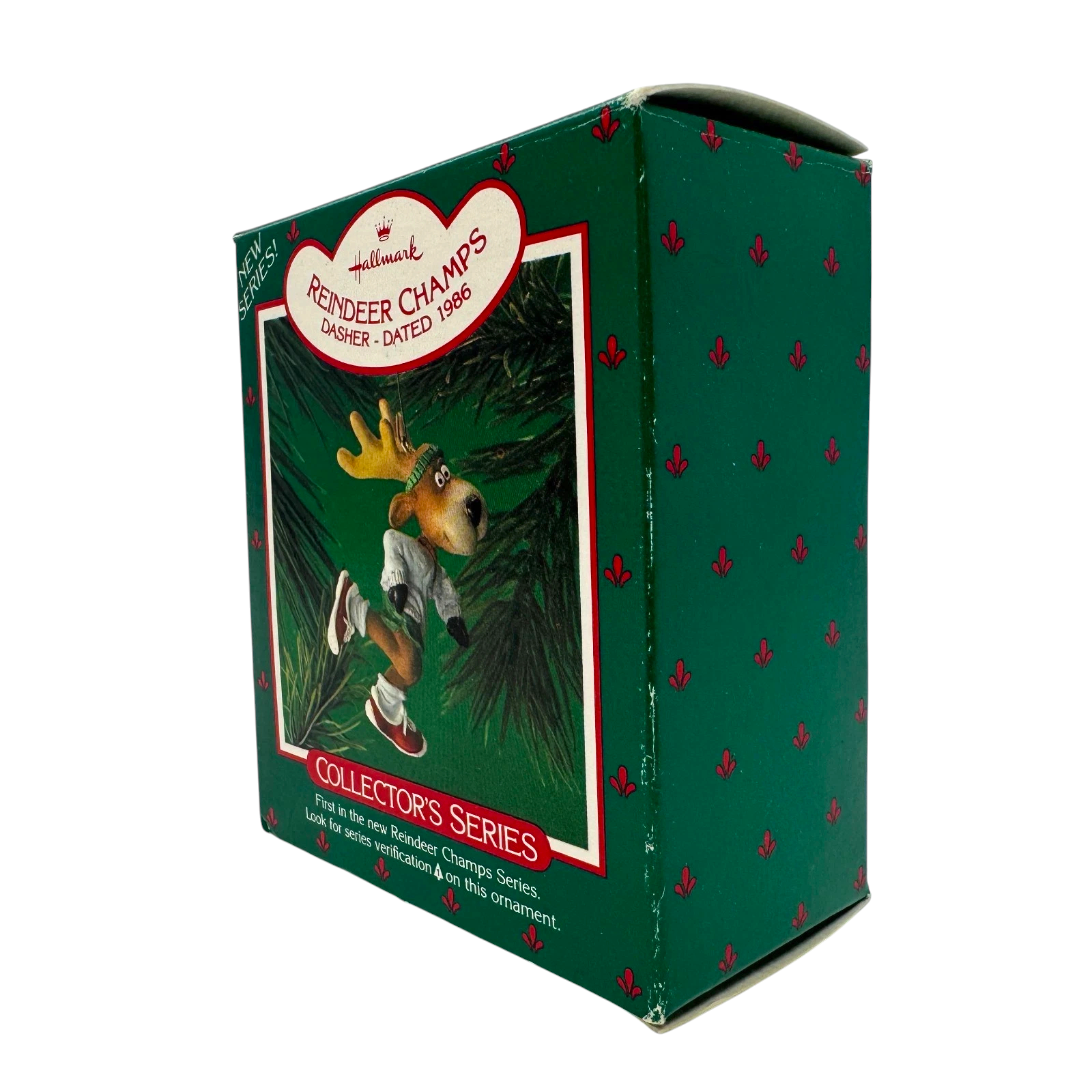 Celebrate classic Christmas charm with the 1986 Dasher (Reindeer Champs) ornament. This vintage Keepsake ornament features Dasher in full stride, ready to lead his fellow reindeer—decked out in festive racing gear for the “Reindeer Champs” challenge. The trim is multi-colored, capturing Dasher’s spirit and motion. This piece originally came in its Hallmark box (mint-in-box versions retain the original packaging), perfect for collectors.