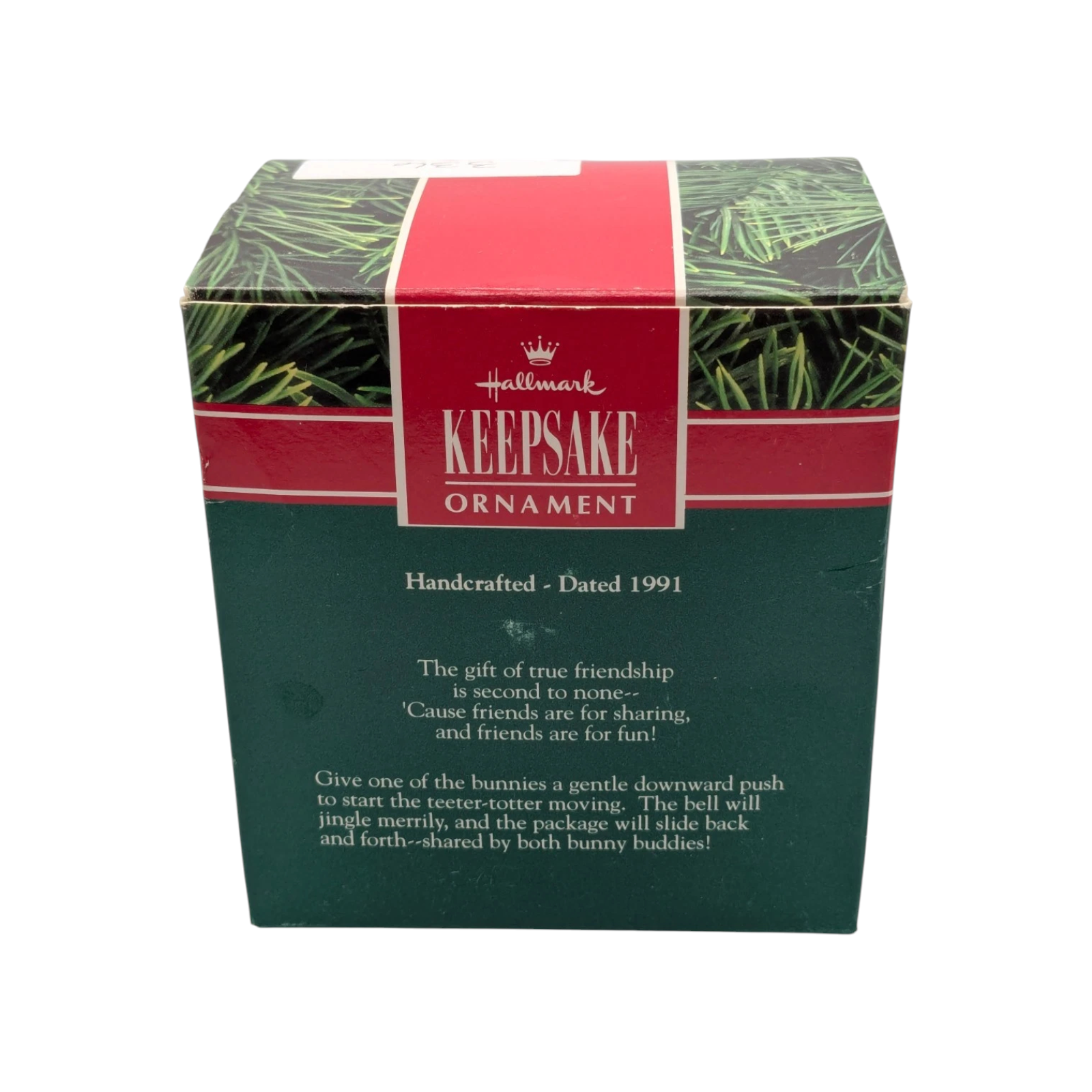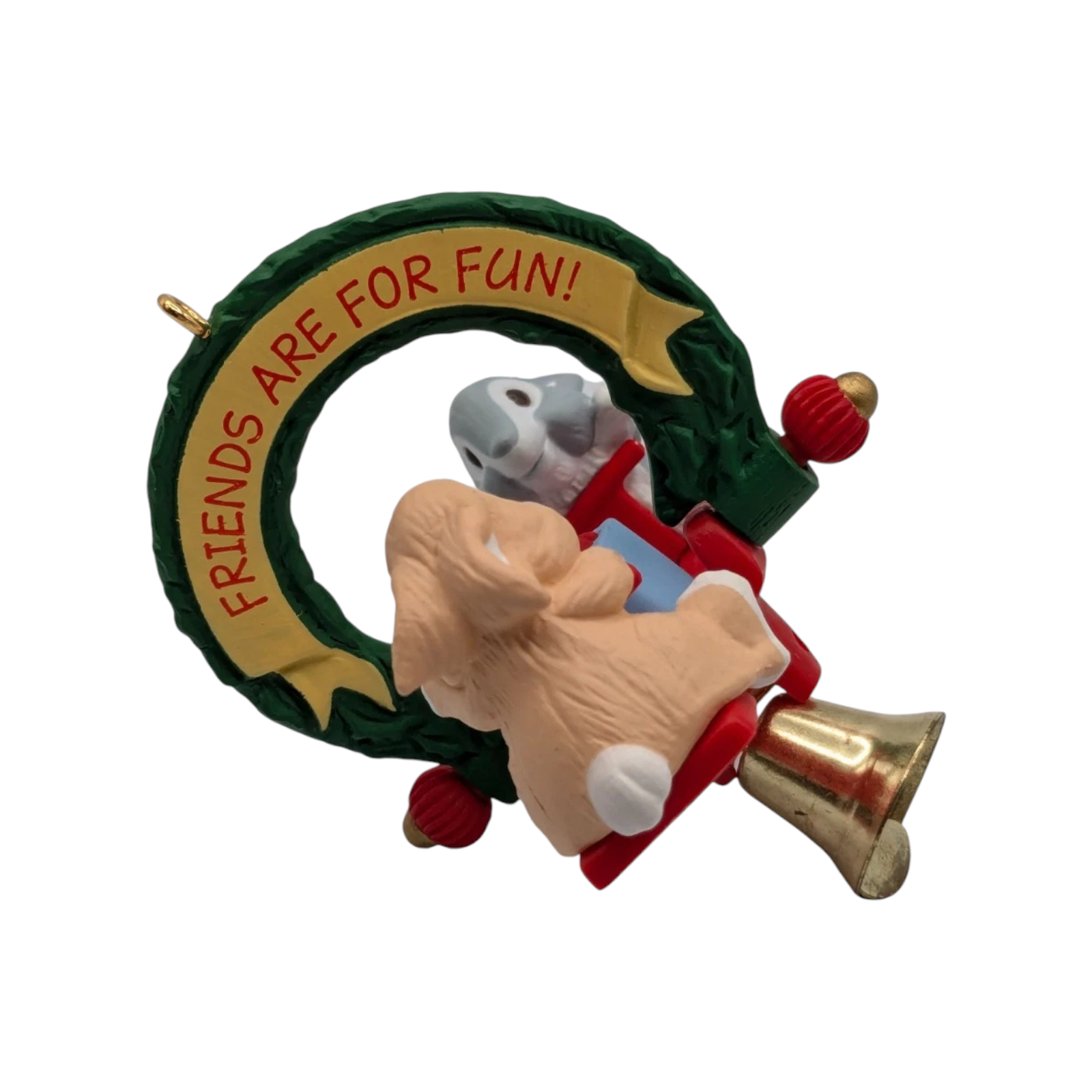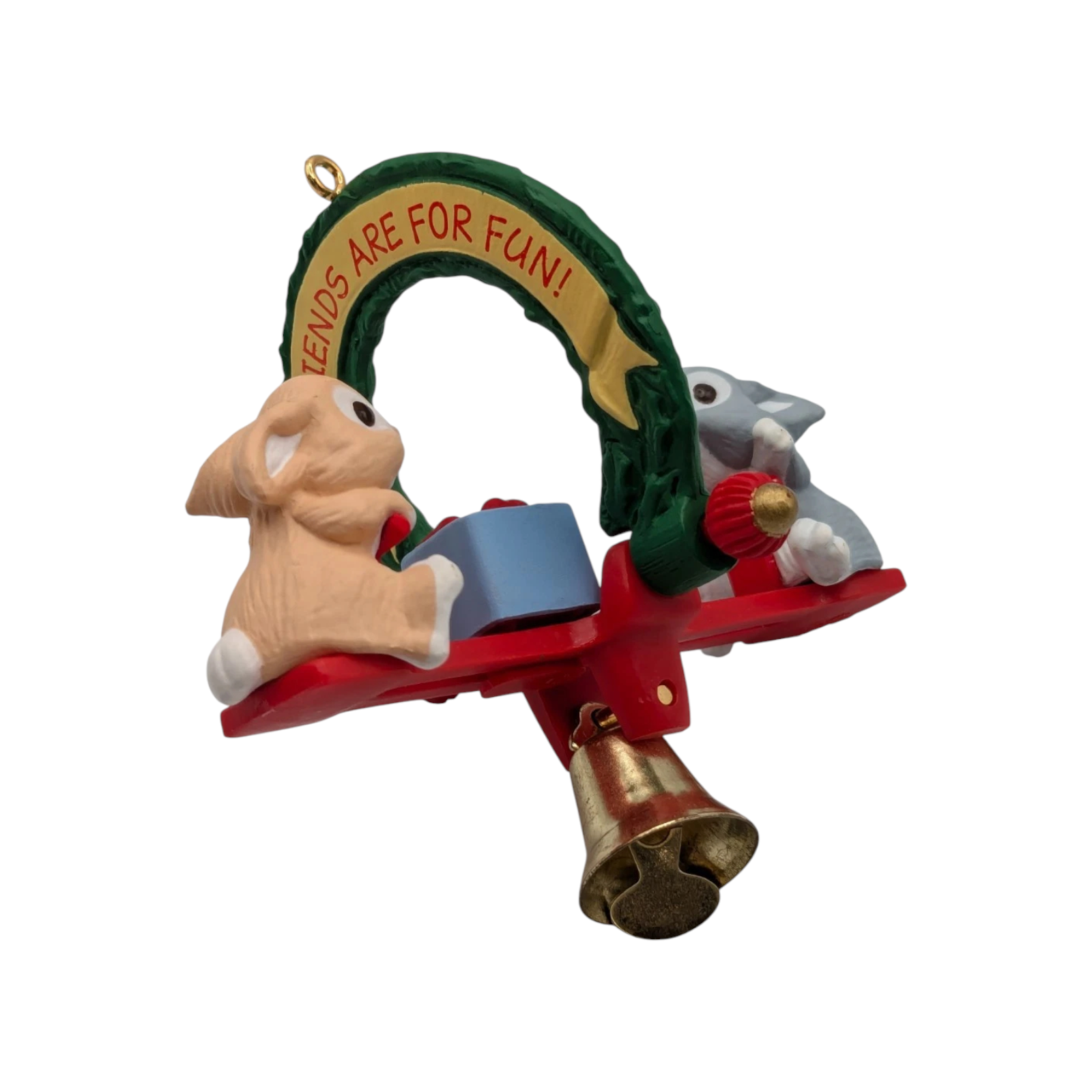 Celebrate the joys of friendship with this charming 1986 Friends Are Fun ornament from Hallmark’s Animal collection. Set within a wreath-shaped frame, two adorable characters — possibly playful woodland animals — teeter-totter back and forth in a whimsical animation. The friendly sentiment “Friends Are For Fun!” arches above them, capturing the warmth of the season. Crafted in resin and arriving mint in its original Keepsake box, this vintage keepsake requires no power — just hang it and enjoy the nostalgia.