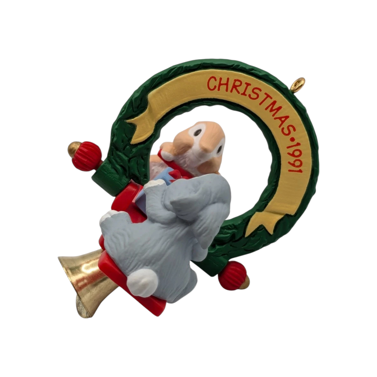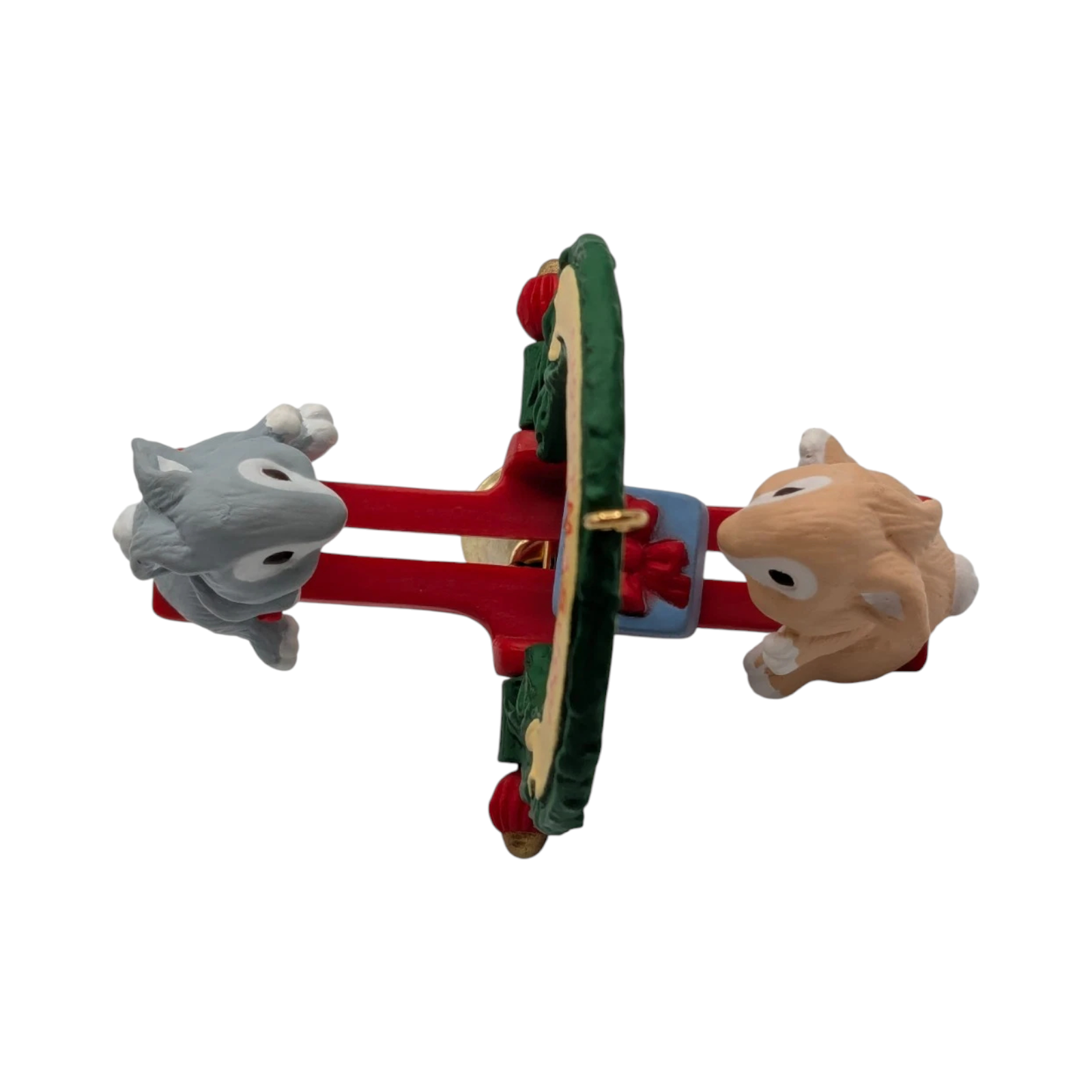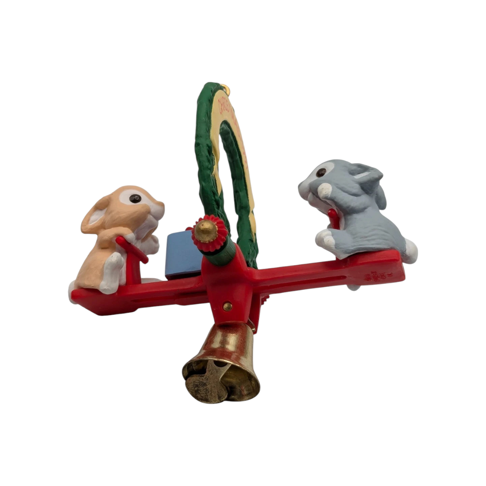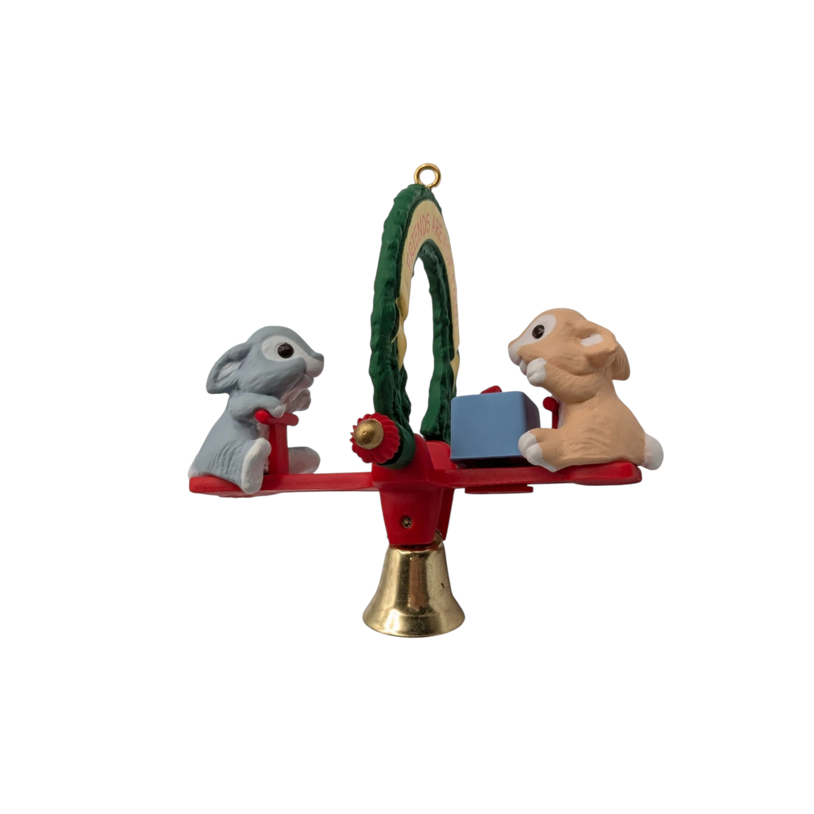 Celebrate the joys of friendship with this charming 1986 Friends Are Fun ornament from Hallmark’s Animal collection. Set within a wreath-shaped frame, two adorable characters — possibly playful woodland animals — teeter-totter back and forth in a whimsical animation. The friendly sentiment “Friends Are For Fun!” arches above them, capturing the warmth of the season. Crafted in resin and arriving mint in its original Keepsake box, this vintage keepsake requires no power — just hang it and enjoy the nostalgia.
