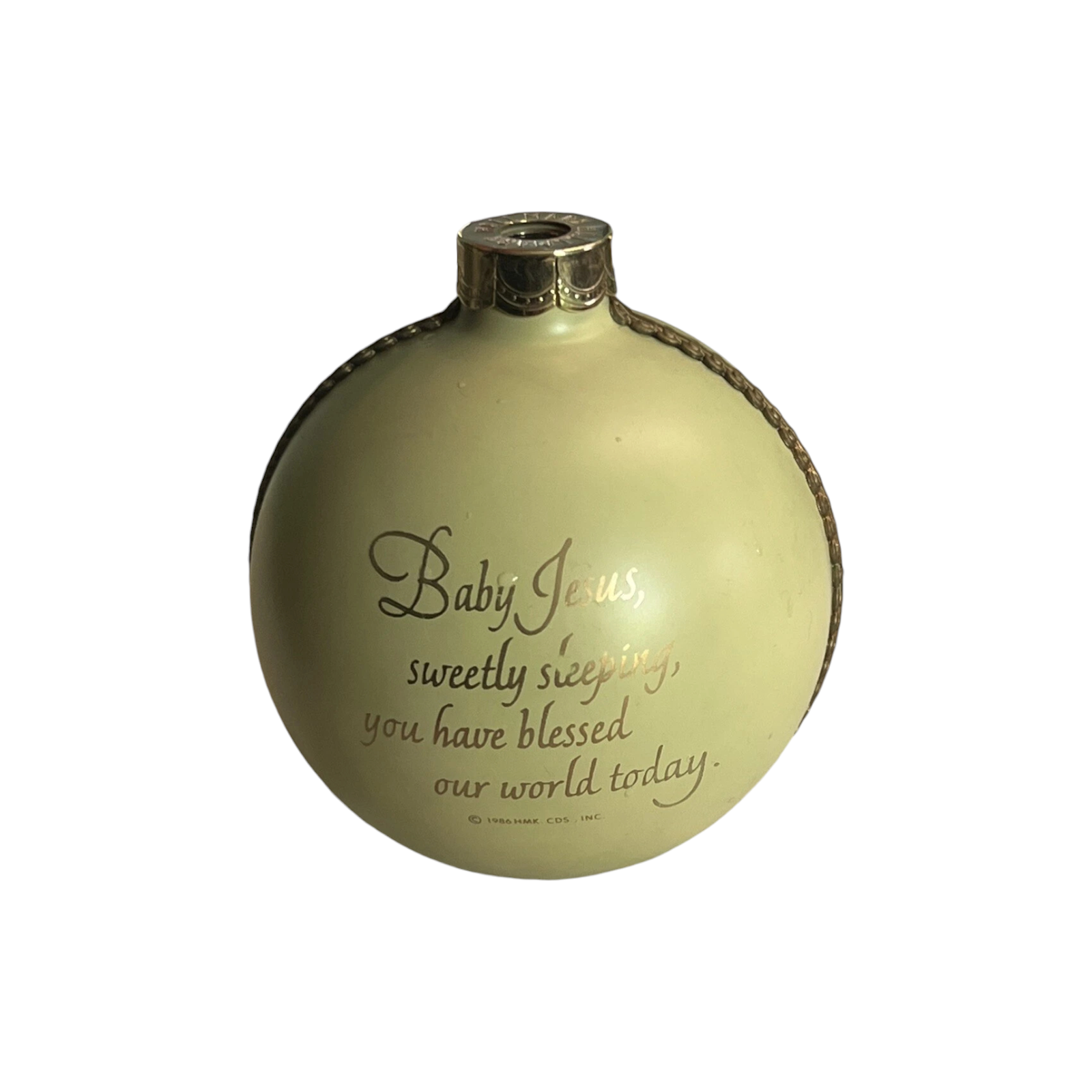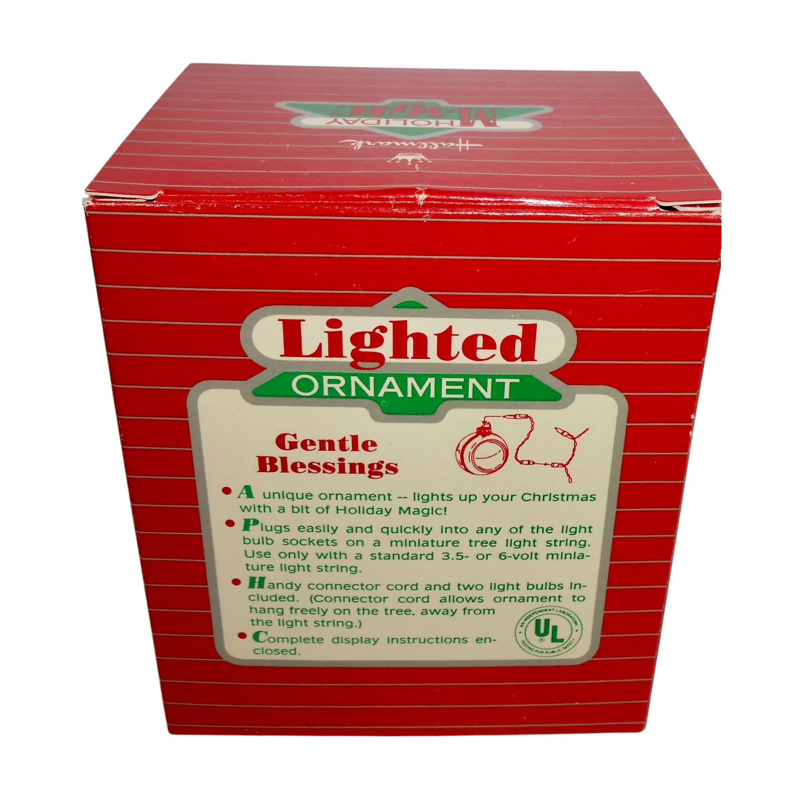 This serene 1986 Hallmark ornament, titled Gentle Blessings, beautifully portrays the quiet holiness of the Nativity. The design features Mary, Joseph, and the Baby Jesus beneath a softly glowing arch, surrounded by subtle star patterns. When connected to a miniature light string, the translucent ornament radiates a warm golden light, symbolizing peace and divine love. This piece is part of Hallmark’s lighted Nativity series, known for its reverent detail and spiritual inspiration. The ornament was originally issued in a Hallmark Keepsake box and includes a push-in light connector for illumination. No batteries are required — simply plug it into your light string to create a comforting glow on your Christmas tree.