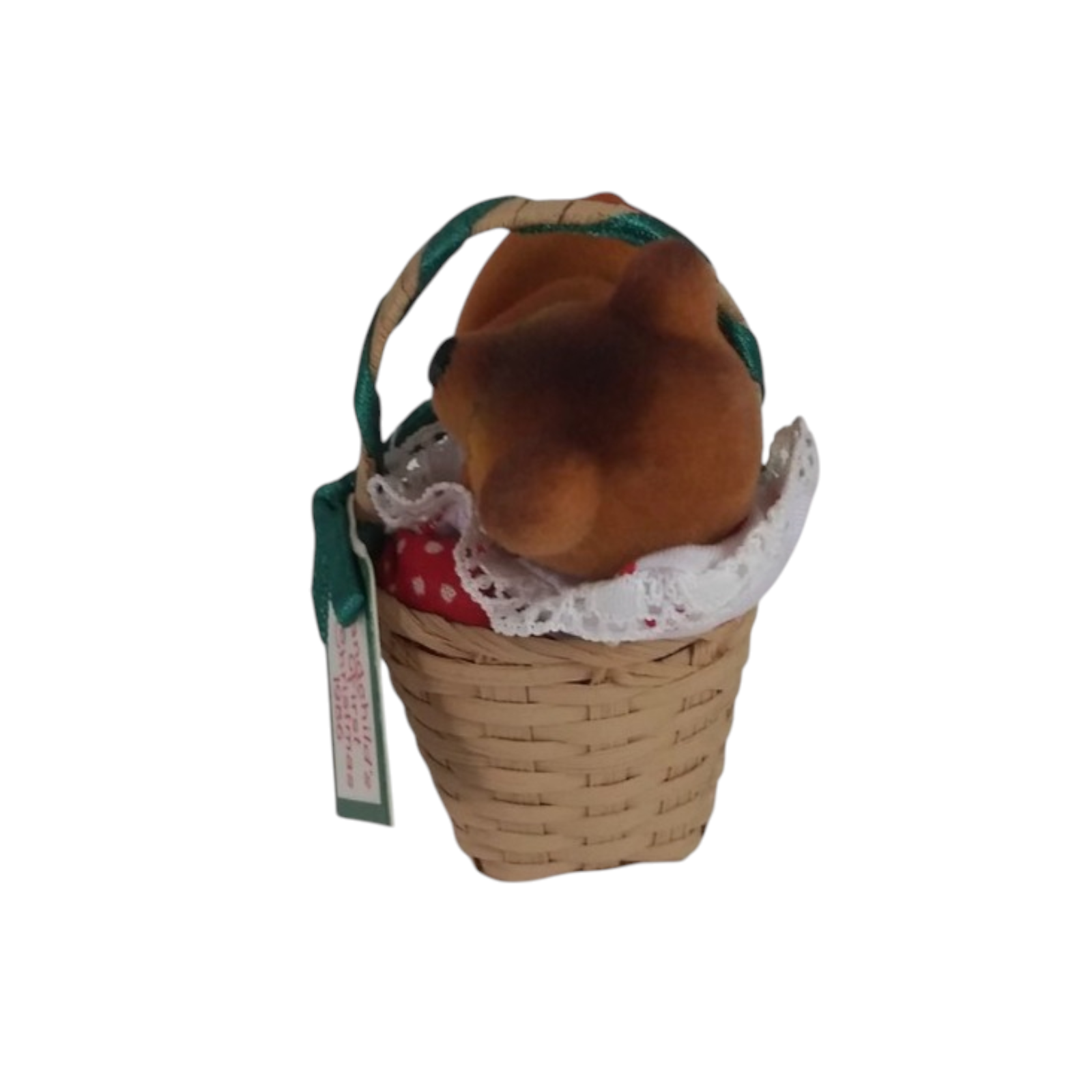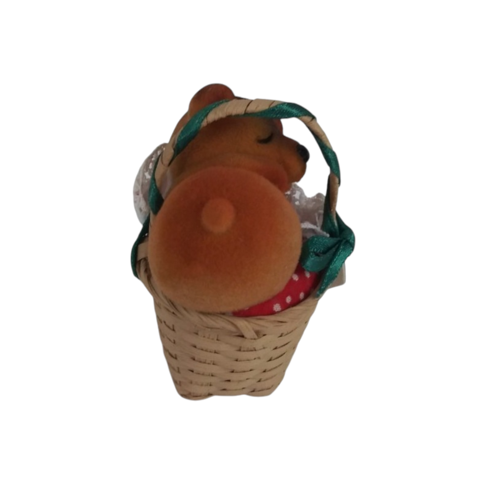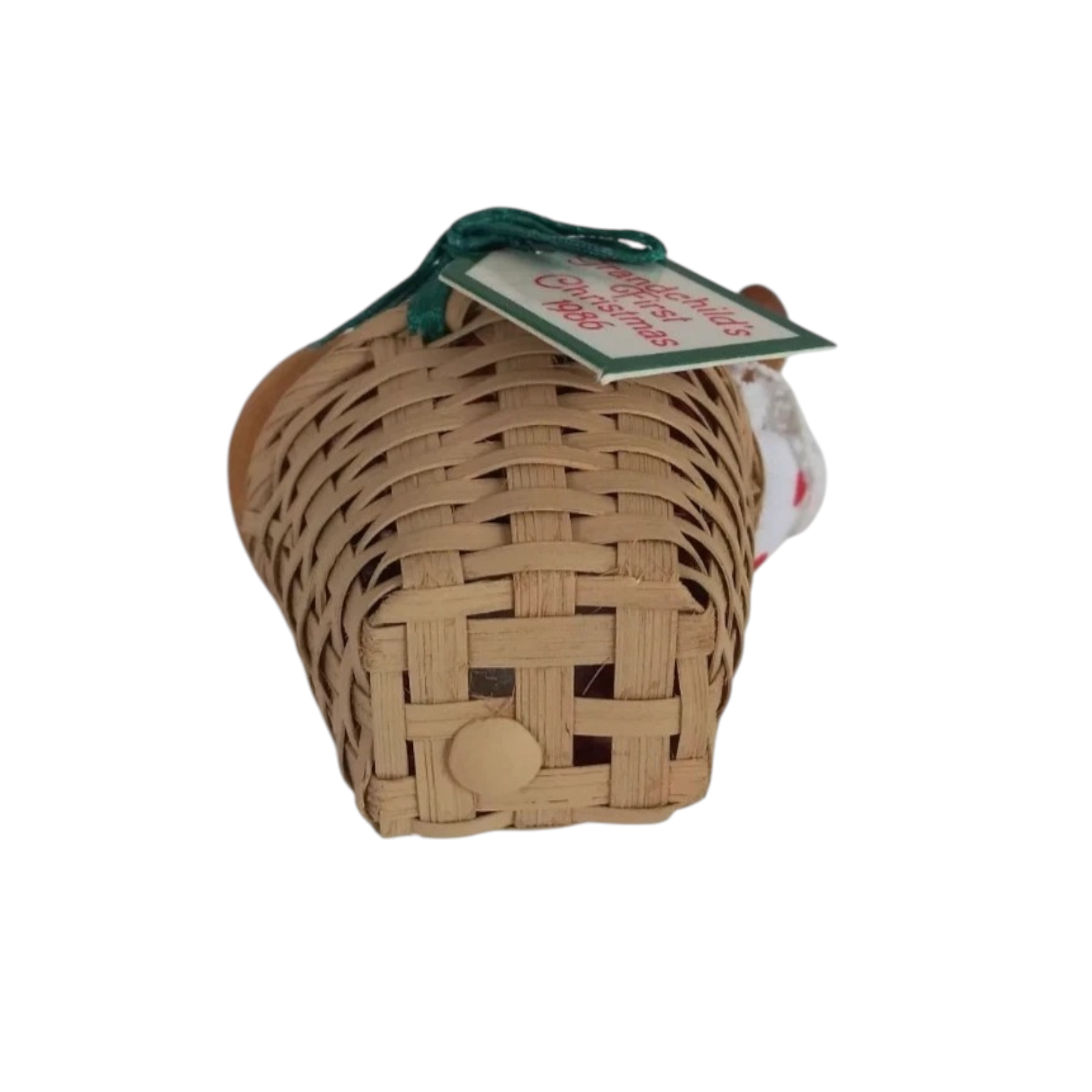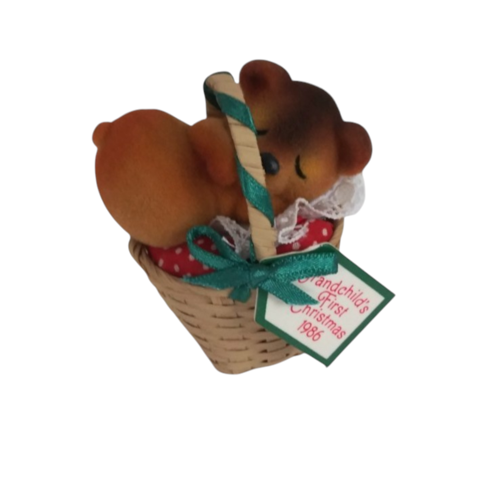 Celebrate a little one’s milestone with Grandchild’s First Christmas, released in 1986. This heartwarming miniature shows an adorable flocked teddy bear sleeping peacefully in a woven basket, nestled atop a lace-trimmed pillow, with a tiny “Grandchild’s First Christmas 1986” tag. Designed to evoke nostalgic sweetness, the ornament typically includes the original collector’s box and ornament tag. No batteries, cords, or lights are required—just a tender keepsake ready to hang.