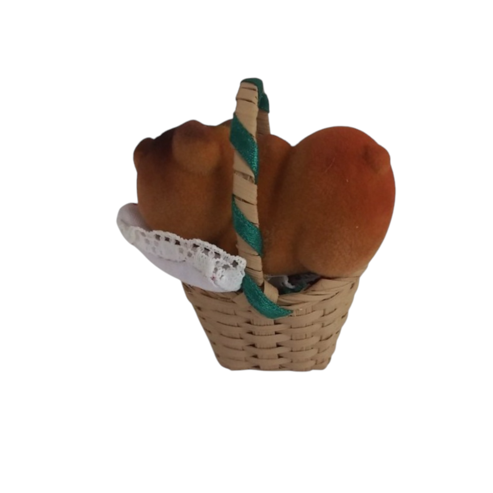 Materials: Flocked resin or plastic bear, fabric pillow, woven basket