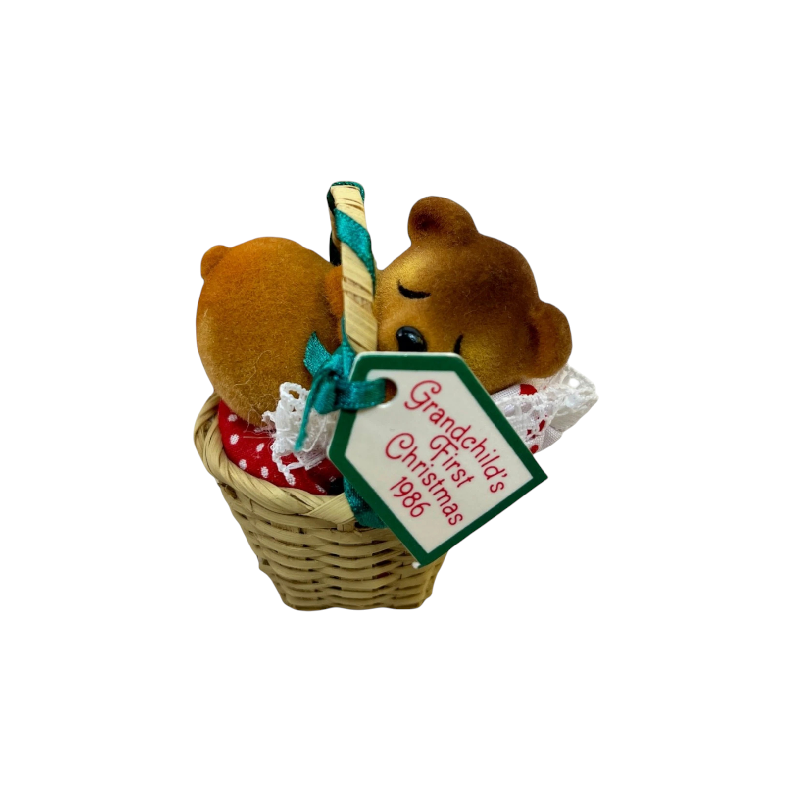 This adorable 1986 Hallmark ornament, titled Grandchild’s First Christmas, celebrates the joy of a family’s newest addition. The ornament features a sweet baby nestled in a soft blanket, surrounded by colorful toys and candy canes. The words “Grandchild’s First Christmas 1986” are beautifully inscribed on the front, making it a sentimental keepsake for grandparents to treasure. The design captures Hallmark’s signature 1980s charm with its hand-painted pastel colors and heartwarming expression. Each ornament was originally issued in a dated Hallmark Keepsake box and includes its hanging loop. No batteries, cords, or lights are required — simply hang this ornament on your tree as a reminder of that special first Christmas.