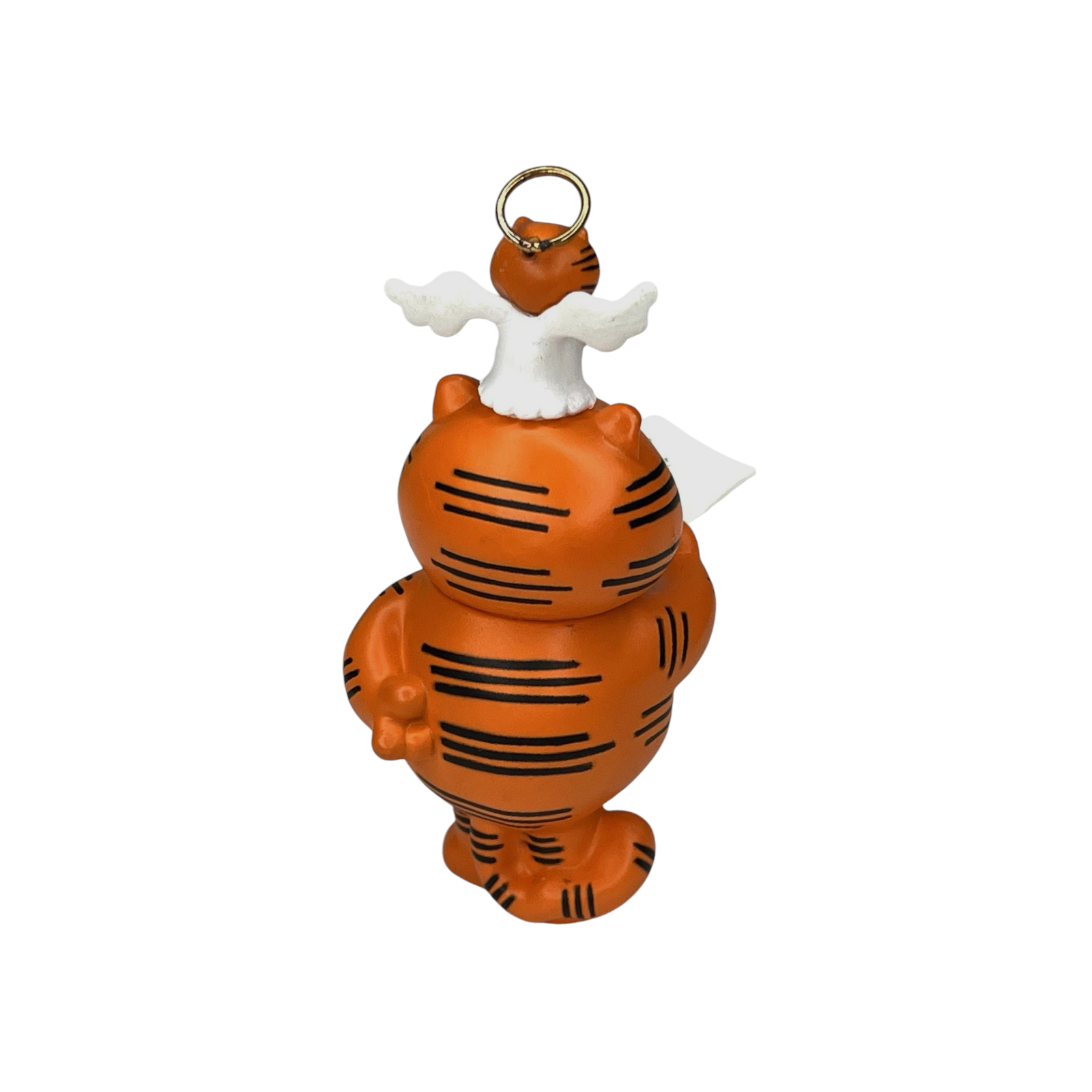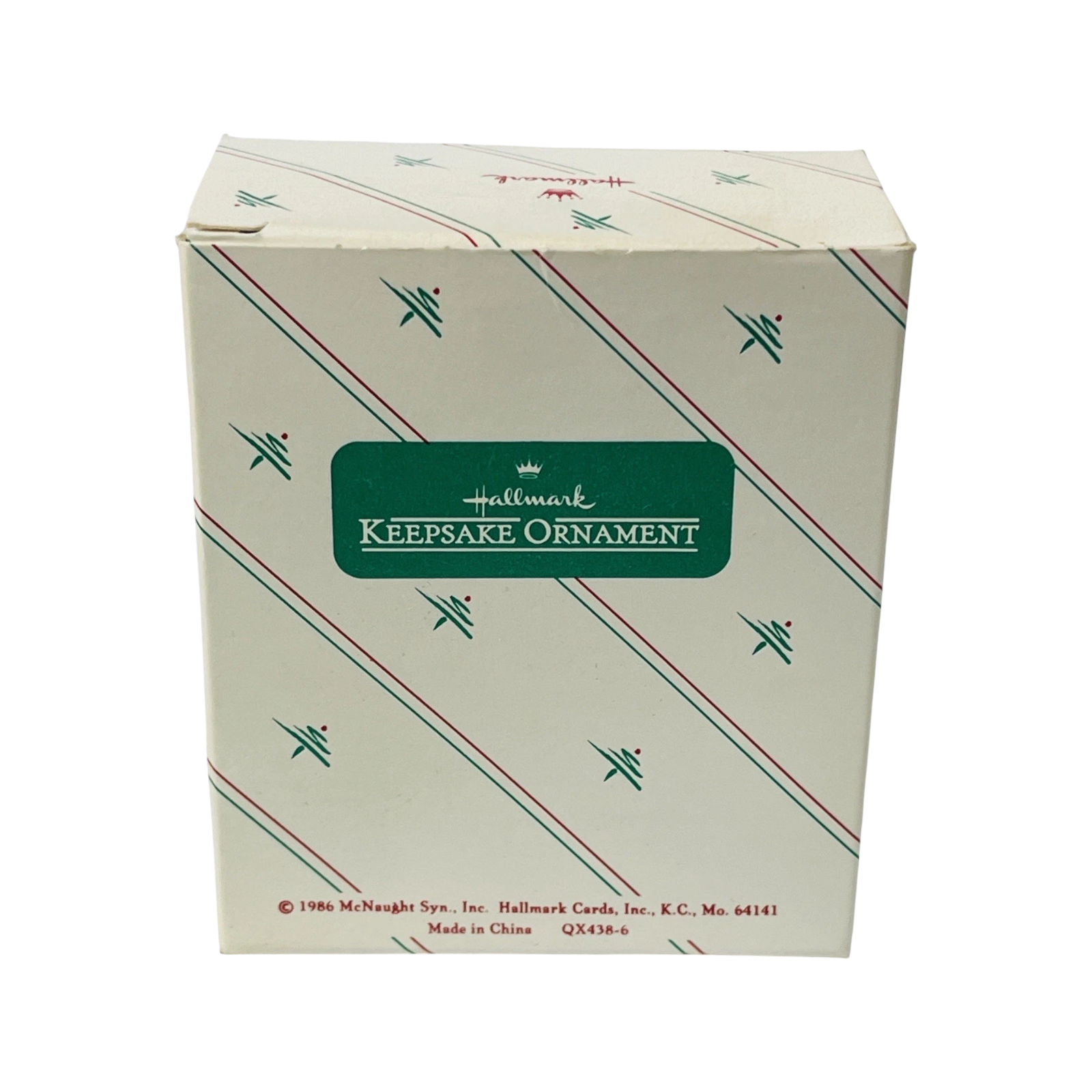 The 1986 Heathcliff ornament features the mischievous orange tabby cat from the classic comic strip, captured in a playful holiday pose. Heathcliff is shown holding a Christmas present while wearing a festive red Santa hat, reflecting his fun-loving and slightly naughty personality. The ornament is made of hand-painted resin and comes with its original Hallmark box and hanging cord. It does not require batteries, cords, or light strings—purely a decorative collectible celebrating 1980s cartoon nostalgia.
