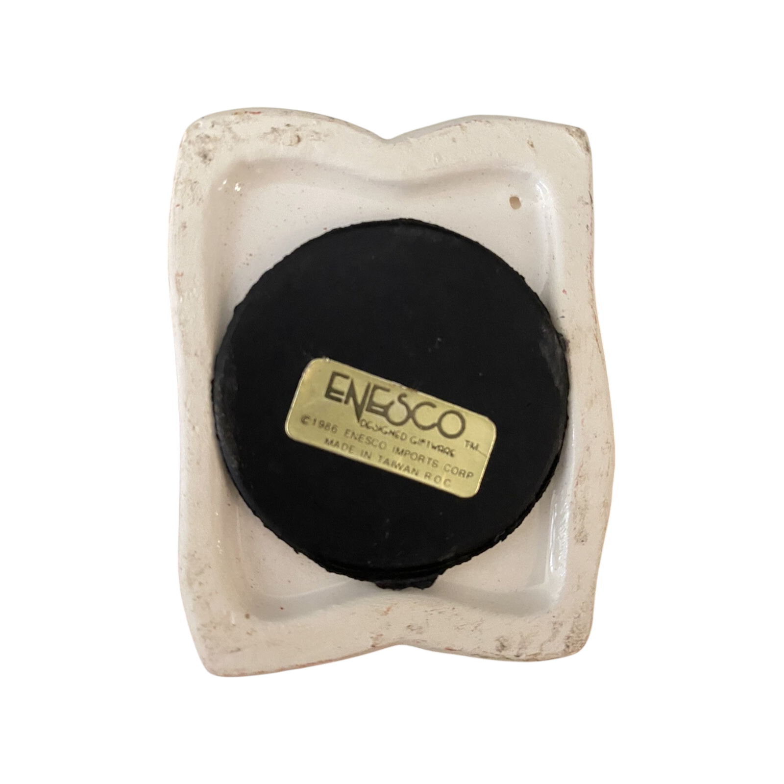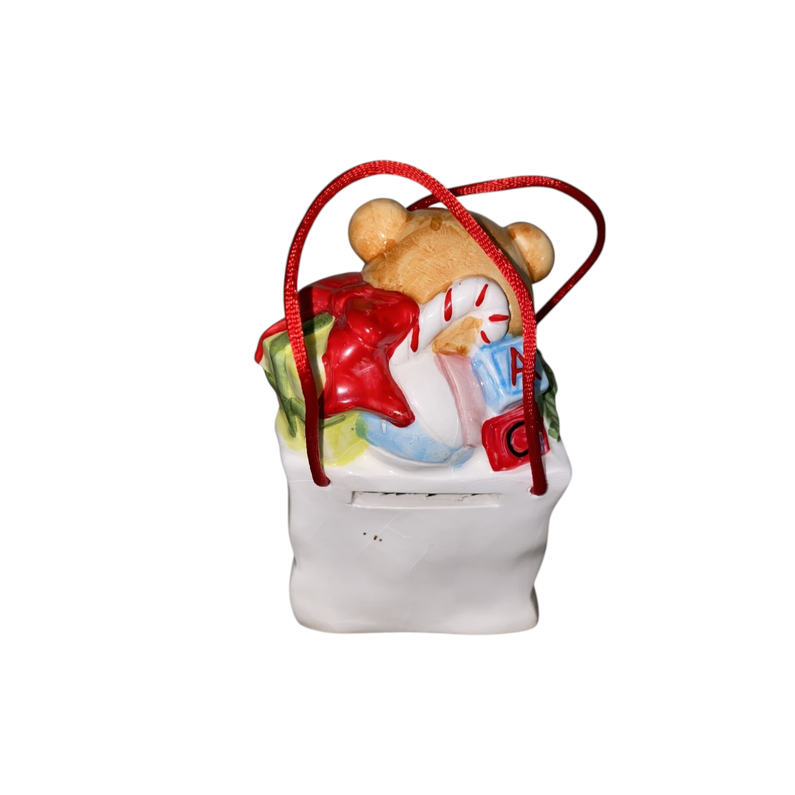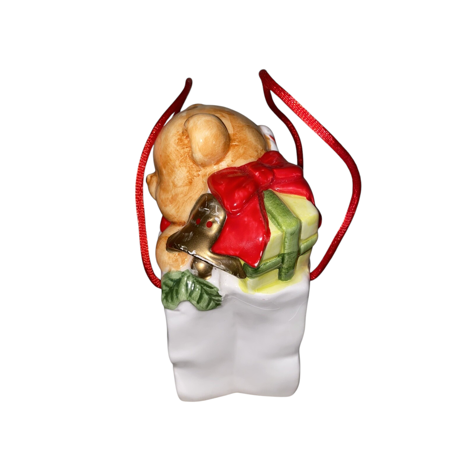 This charming 1986 Enesco ornament, titled Merry Christmas, features an adorable teddy bear dressed in a festive red Santa hat and green scarf, holding a bright holiday wreath. The bear’s soft sculpted texture and gentle smile capture the heartwarming innocence of Christmas, making it a favorite among 1980s Enesco collectors. Crafted with fine hand-painted details, this piece reflects Enesco’s signature style of cozy, nostalgic holiday designs. Each ornament was originally sold in an Enesco gift box and includes a gold hanging cord for display. No batteries, cords, or lights are required — simply hang it on your tree to bring a touch of cheerful, vintage charm.