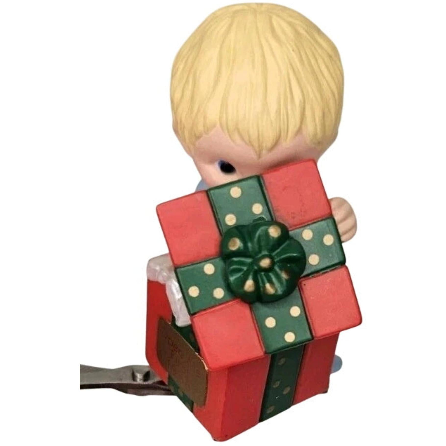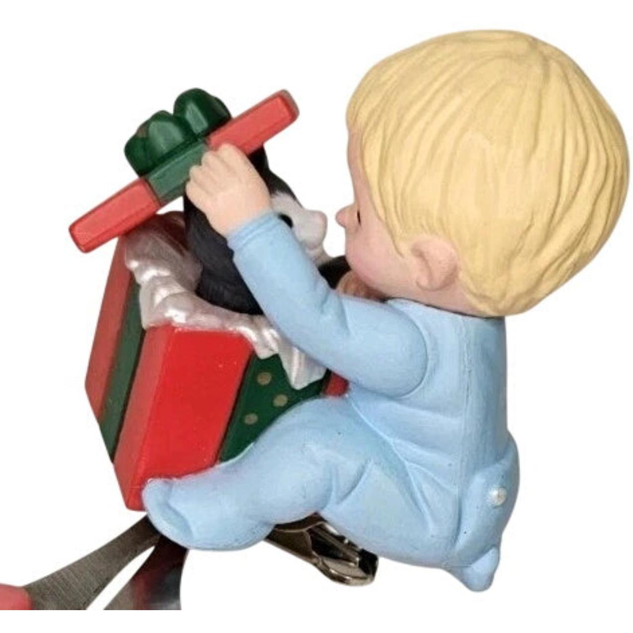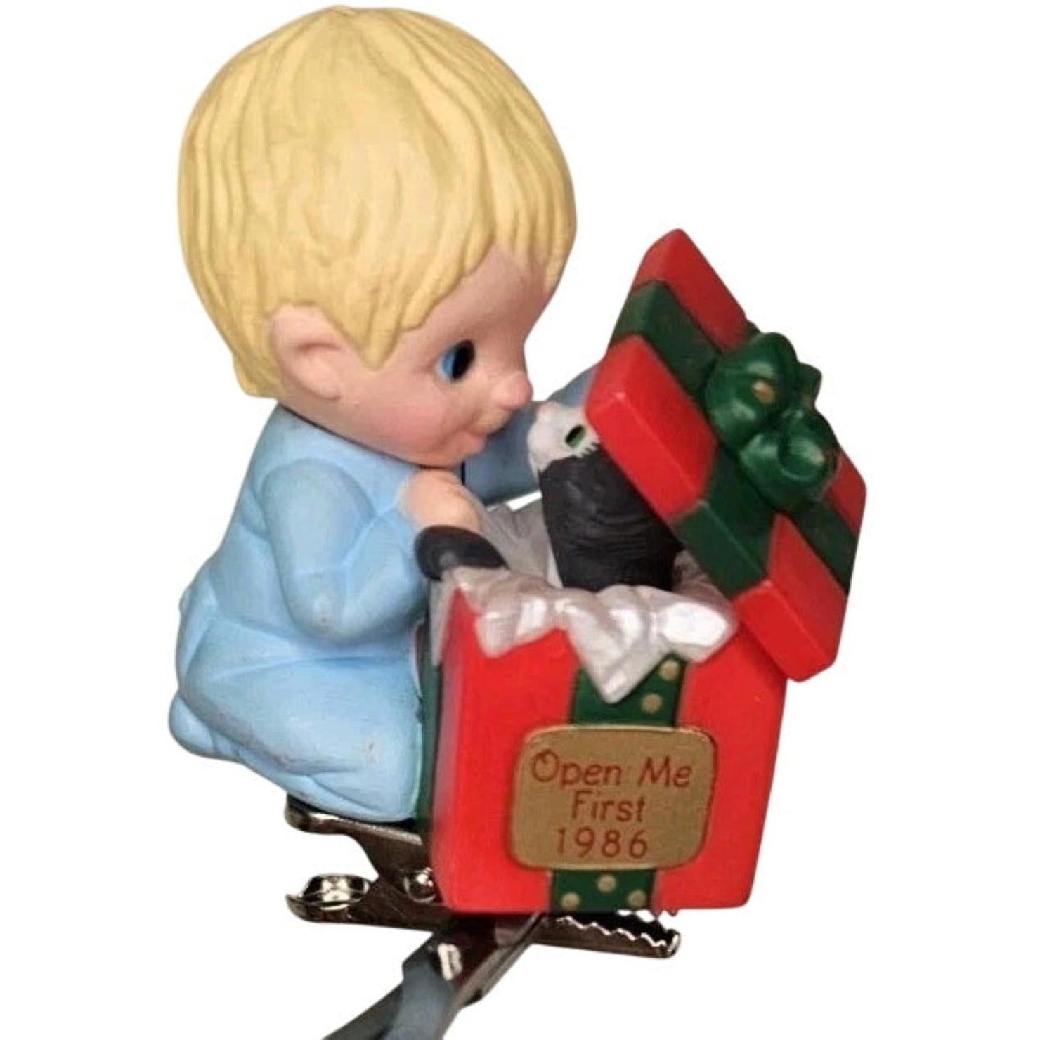 Delight in the surprise of Christmas morning with Open Me First, a 1986 Hallmark clip‑on ornament. This adorable design features a wide‑eyed child in blue pajamas peering into a festive red gift box labeled “Open Me First 1986,” revealing a curious black-and-white kitten inside. This handcrafted minisize ornament clips securely onto a tree branch. Most listings include the original collector’s box and ornament tag. Absolutely no power, lights, or motion required—just pure holiday wonder.