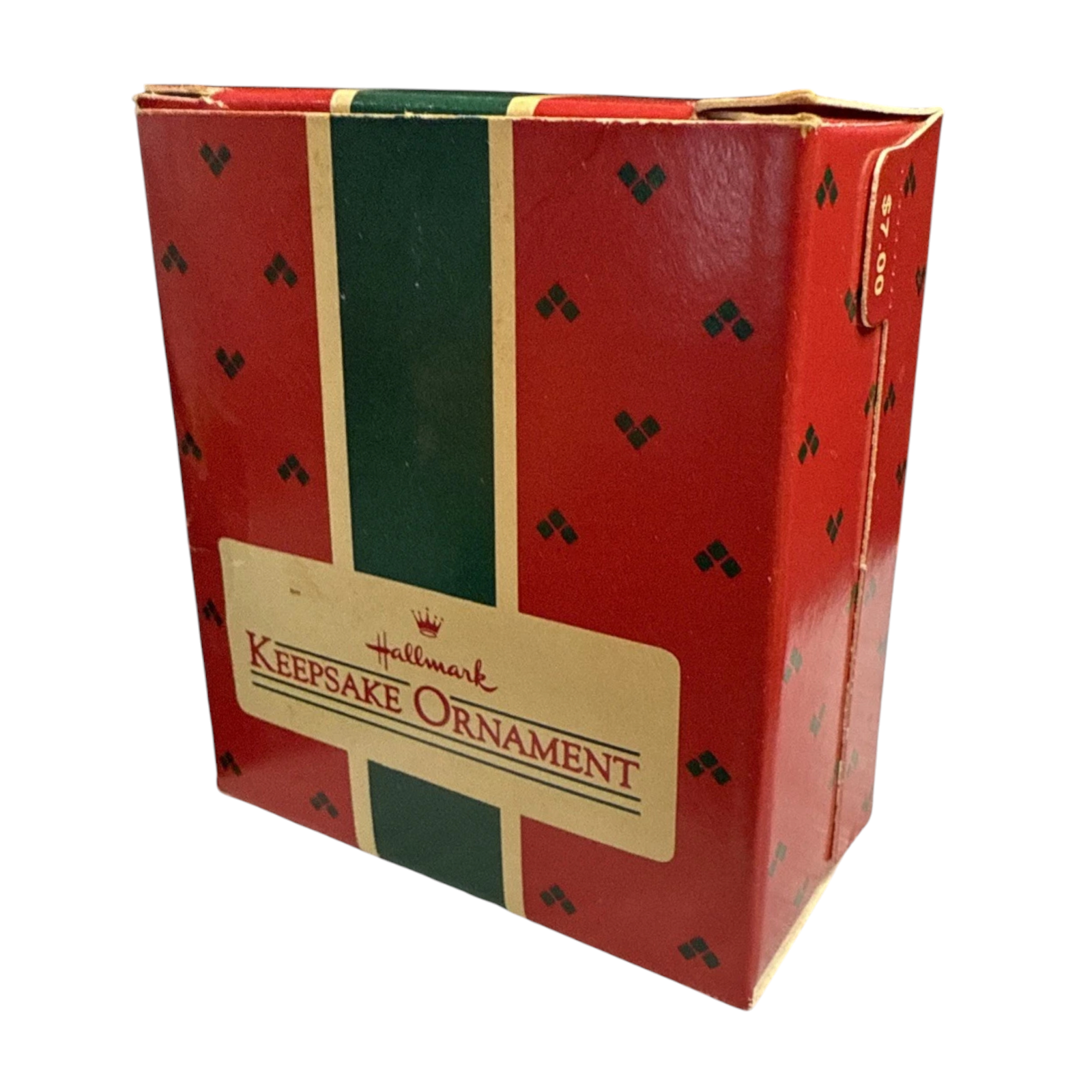 This lively 1986 Hallmark ornament, titled Rah Rah Rabbit, features an energetic bunny dressed as a cheerleader, complete with pom-poms and a bright red sweater emblazoned with a bold “R.” The cheerful design captures the spirit of celebration and fun, making it a favorite among collectors of Hallmark’s whimsical 1980s animal ornaments. The rabbit’s playful pose and expressive face showcase Hallmark’s hand-painted craftsmanship from the early Keepsake years. Each ornament was originally issued in a dated Hallmark Keepsake box and includes a gold hanging cord for display. No batteries, cords, or lights are required — just hang this festive rabbit on your tree to add a touch of pep and personality to your holiday décor.