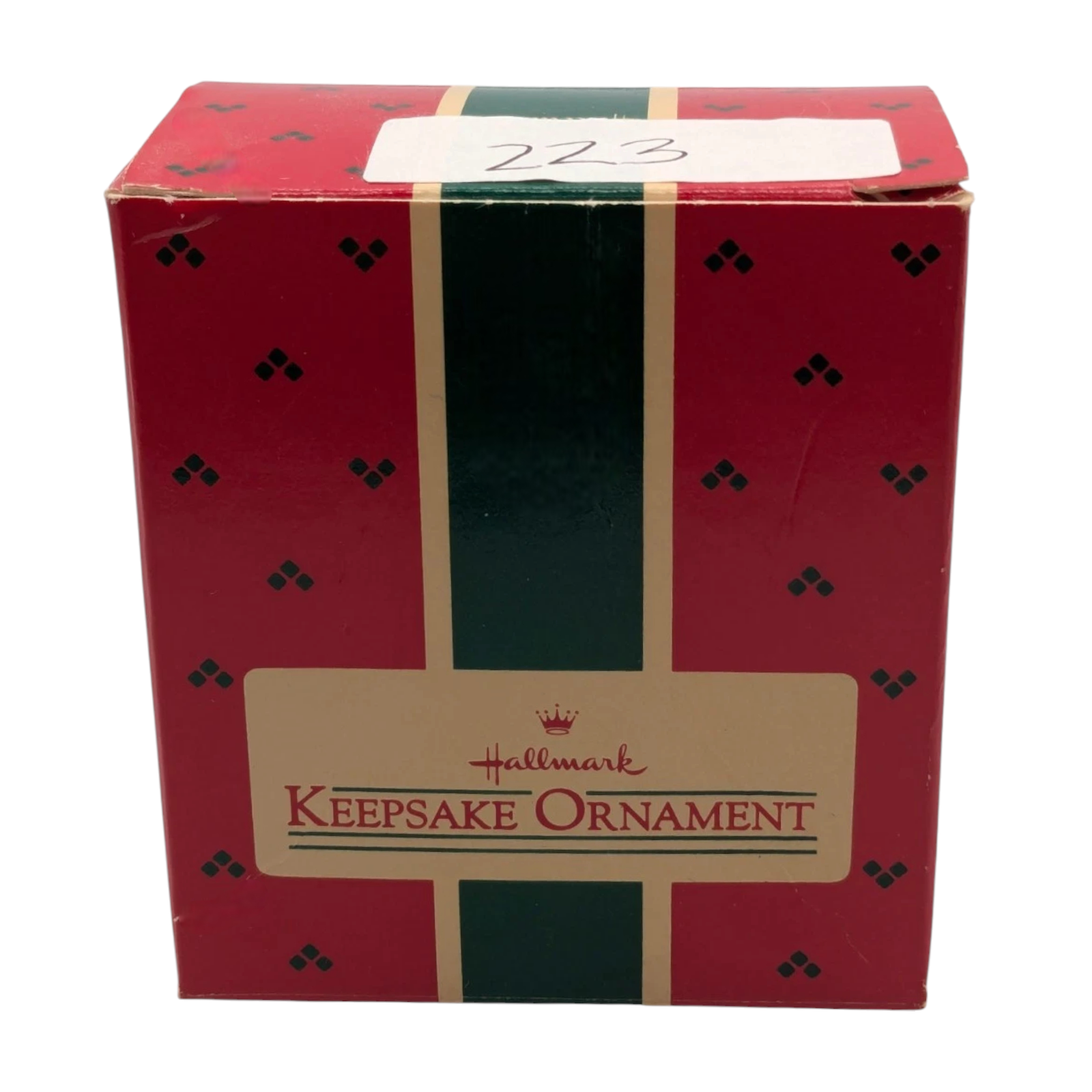 This adorable 1986 Hallmark ornament, titled Snow Buddies, captures the joy of winter friendship. The design features a playful snowman bundled in a red scarf and green mittens, happily building a smaller snow-pup beside him. The friendly pair stand on a snowy base detailed with light texturing and painted accents that give the scene a handcrafted, cheerful look. Hallmark’s signature 1980s artistry shines through in the gentle expressions and classic colors. Each ornament was originally issued in a dated Hallmark Keepsake box and includes a hanging loop for display. No batteries, cords, or lights are required — just hang this heartwarming scene on your tree to bring a touch of nostalgic holiday happiness.
