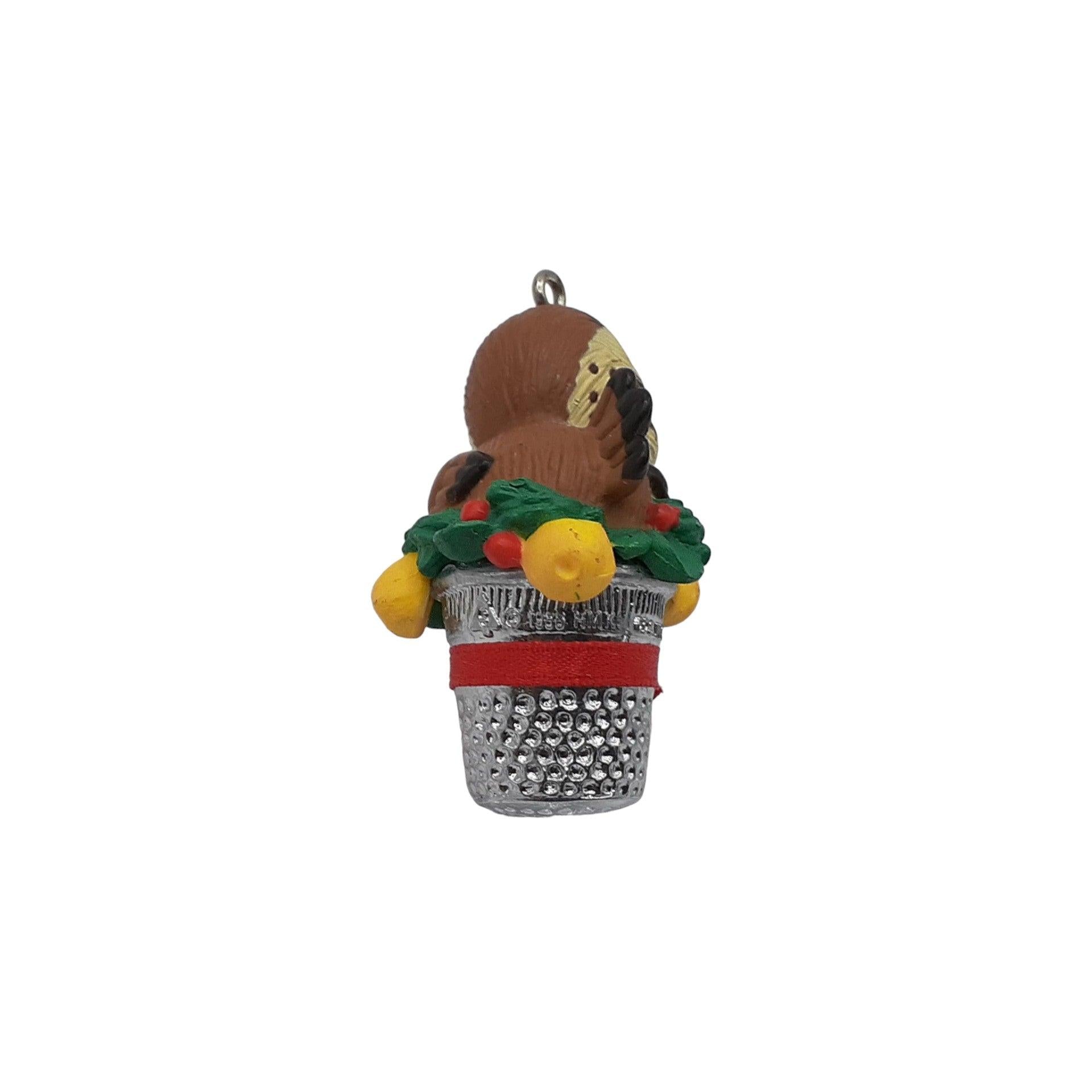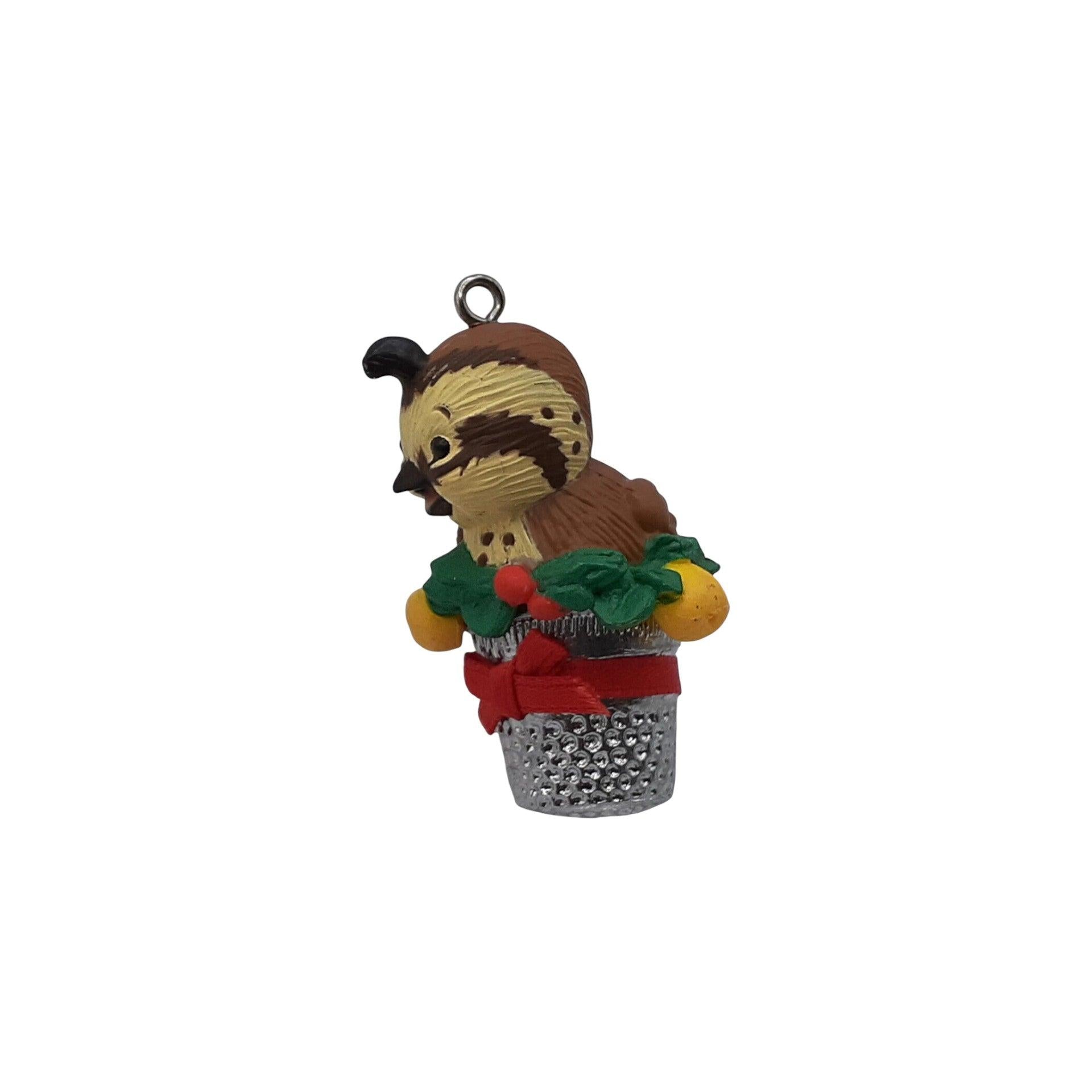 Introduce a petite blend of whimsy and vintage charm with Thimble Partridge, debuted in 1986 as the ninth installment in Hallmark’s delightful Thimble Series. This miniature ornament showcases a cheerful partridge perched inside a gleaming silver thimble, trimmed with holly sprigs, bright red berries, and accented by a festive ribbon. It typically arrives in its original green collector’s box marked Thimble Partridge Handcrafted Ornament (9th in series), along with the ornament tag. No batteries, cords, motion or light needed—its handcrafted detail and festive design speak for themselves.